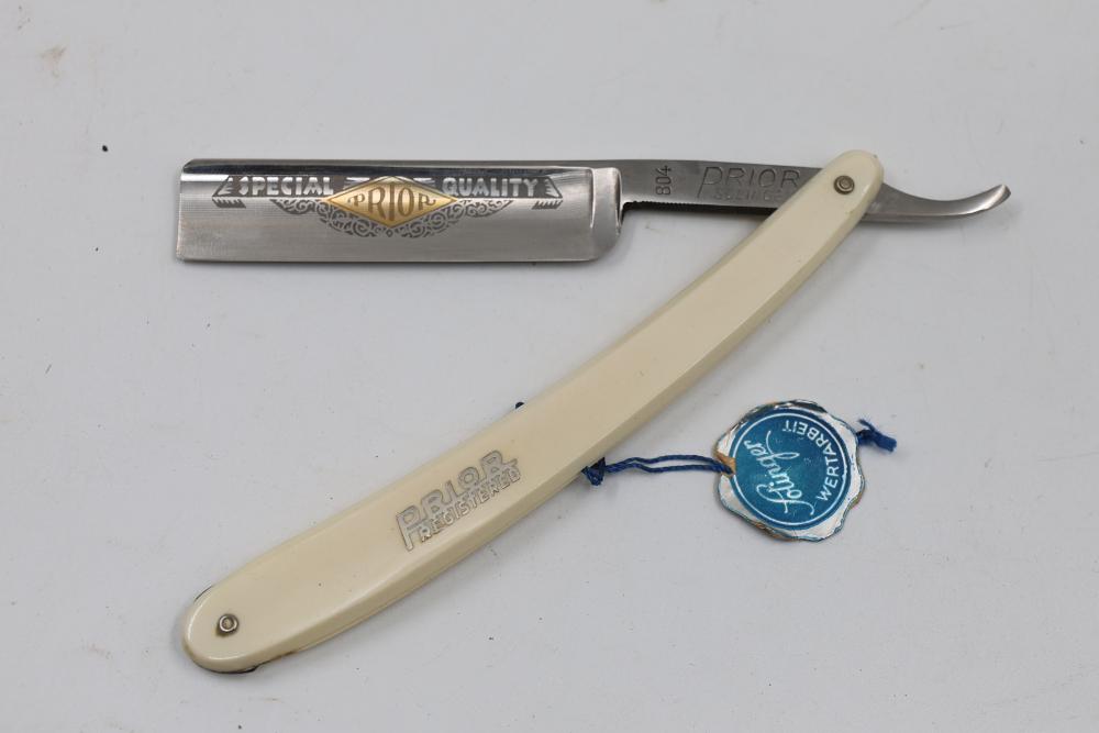 Eleven Straight Razors and One Hair Shaper with makers marks from Prior, Romo, and Wade & Butcher, featuring celluloid and horn scales, hollow, and wedge blades. One with mother of pearl blade end from The J.R. Torrey Razor Co. Includes multiple cases. Pickup only.