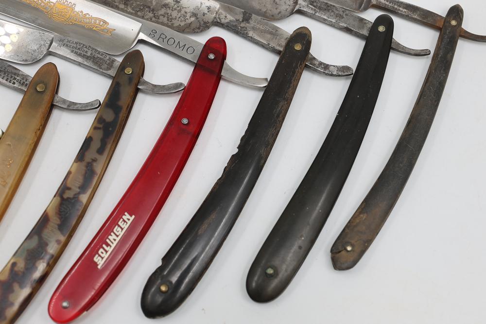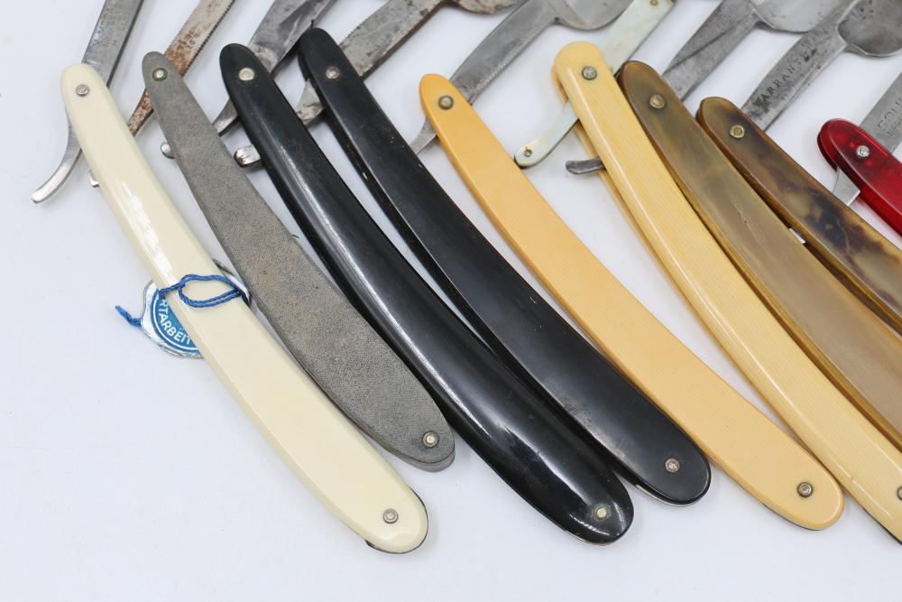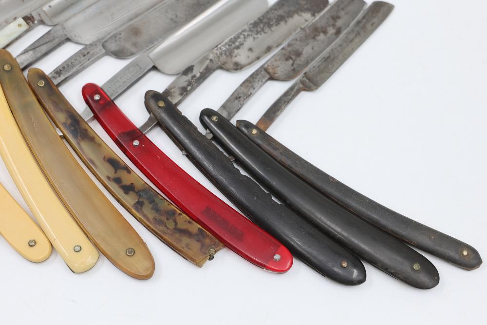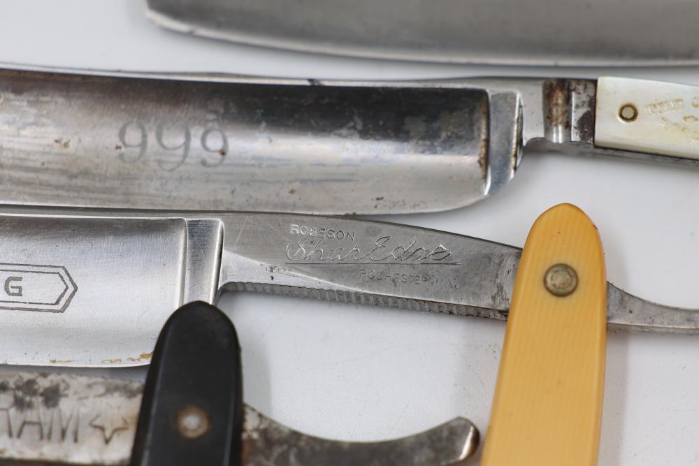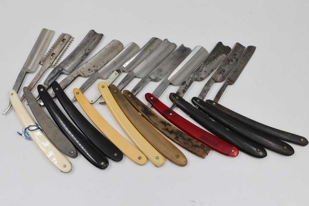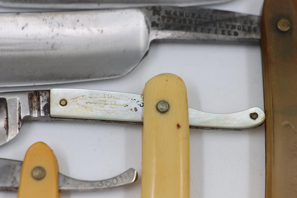 Items are from one straight razor collection & include cased matched pair of Joseph Rodgers & Sons straight razors having etched blade panels in velvet-lined Rodgers fitted case; etched motif Theodore Roosevelt & General Botha straight razor; Texas Luggage U.S. military style portable barber kit; porcelain shaving mugs with four lather brushes, collapsible compact travel shaving mirror with bowl; Warranted Razors having horn handles & notched Sheffield-style blades, etched Washington commemorative hollow blade with patriotic motif; Frederick Reynolds Sheffield straight razors; razors w/ mother of pearl scales/inlaid bar escutcheons/silver tone end caps/wedge-style blades; razors from Rogers & Sons, Wade & Butcher & Mappin's, featuring two horn scales & one celluloid with wedge style blades; razors from Clauss, J.A. Henckels, & H. Boker & Co., featuring mixed celluloid scales with hollow blades/includes multiple cases; barber accessories including razor strops/sharpening stones/boxed Schick blades; hair shapers; identification & value books & more. Items are located in Pleasant Valley, NY.