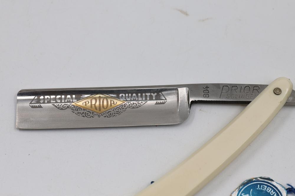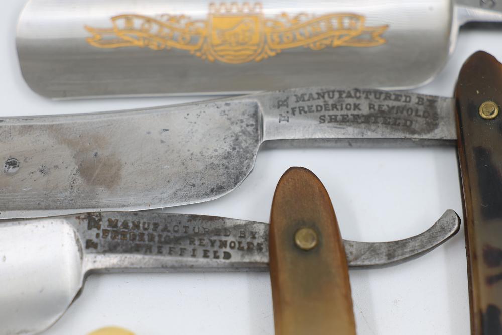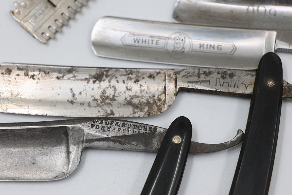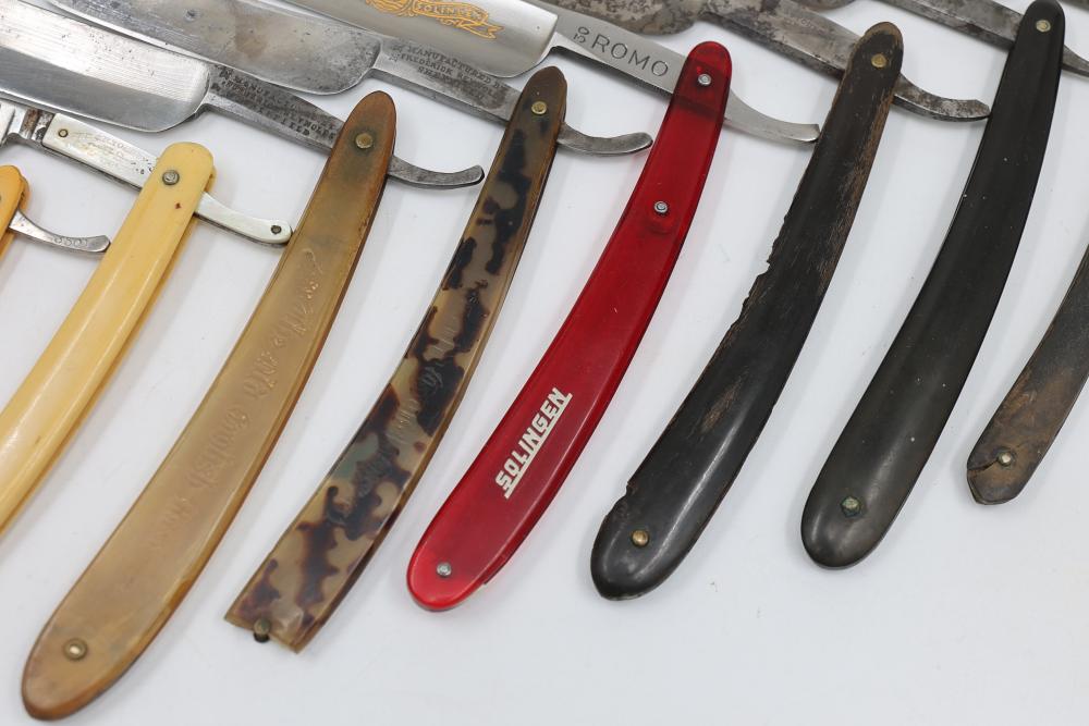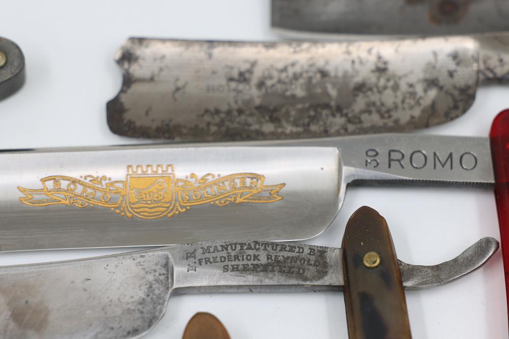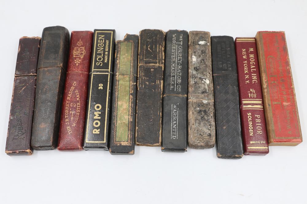 Items are from one straight razor collection & include cased matched pair of Joseph Rodgers & Sons straight razors having etched blade panels in velvet-lined Rodgers fitted case; etched motif Theodore Roosevelt & General Botha straight razor; Texas Luggage U.S. military style portable barber kit; porcelain shaving mugs with four lather brushes, collapsible compact travel shaving mirror with bowl; Warranted Razors having horn handles & notched Sheffield-style blades, etched Washington commemorative hollow blade with patriotic motif; Frederick Reynolds Sheffield straight razors; razors w/ mother of pearl scales/inlaid bar escutcheons/silver tone end caps/wedge-style blades; razors from Rogers & Sons, Wade & Butcher & Mappin's, featuring two horn scales & one celluloid with wedge style blades; razors from Clauss, J.A. Henckels, & H. Boker & Co., featuring mixed celluloid scales with hollow blades/includes multiple cases; barber accessories including razor strops/sharpening stones/boxed Schick blades; hair shapers; identification & value books & more. Items are located in Pleasant Valley, NY.