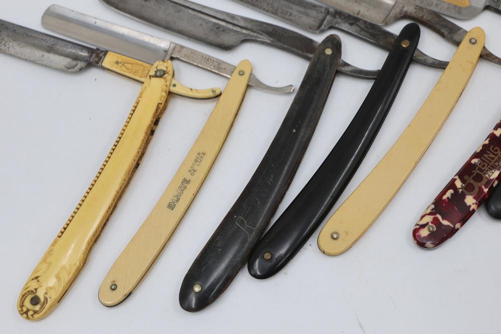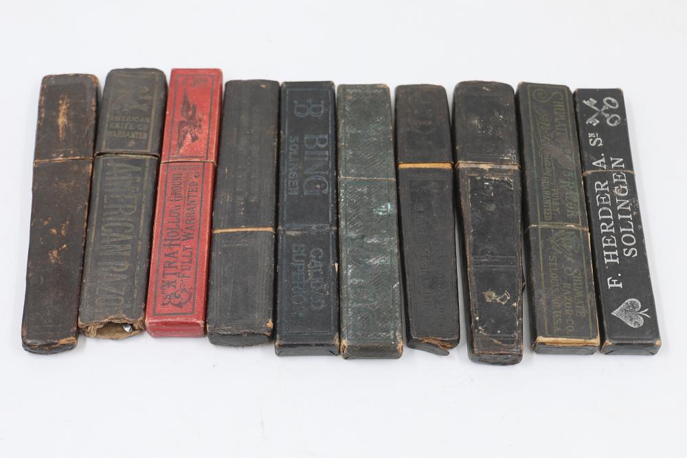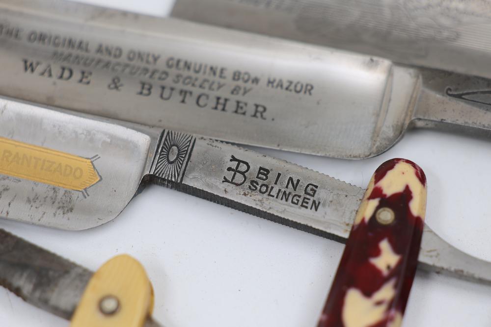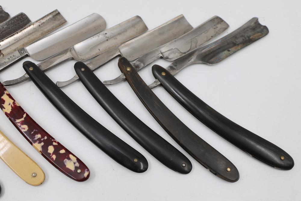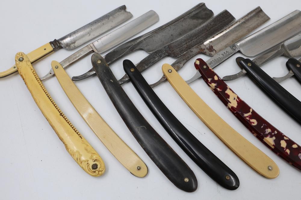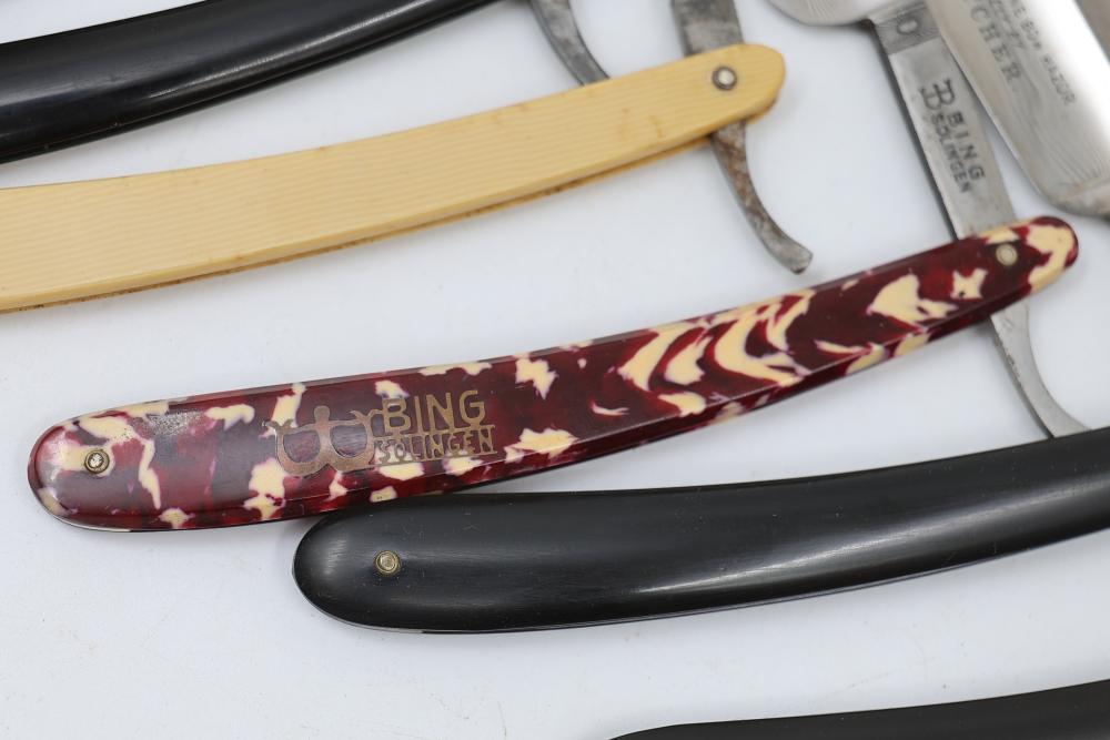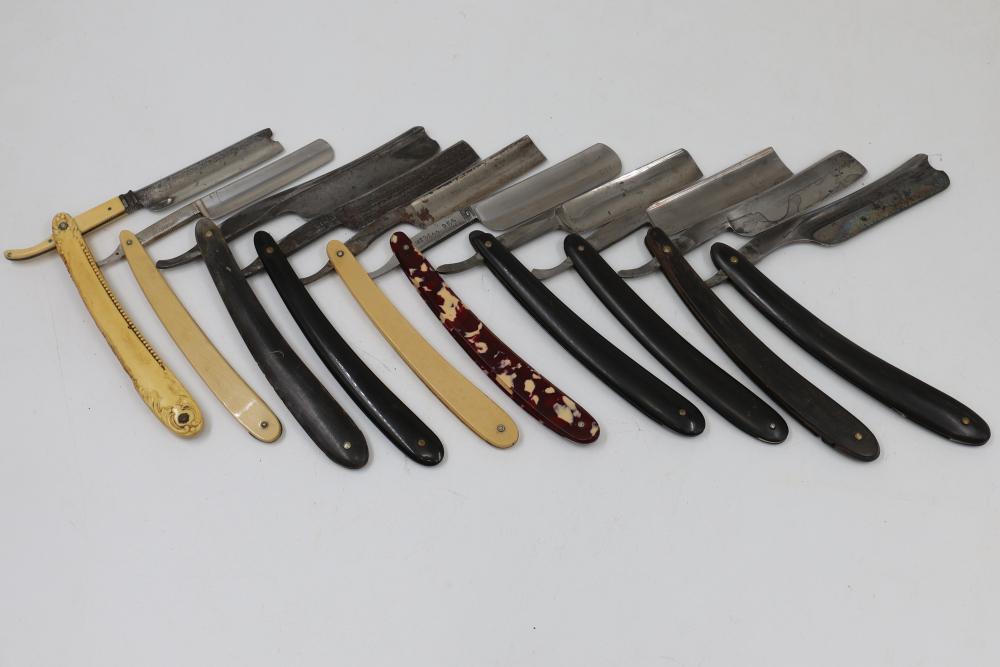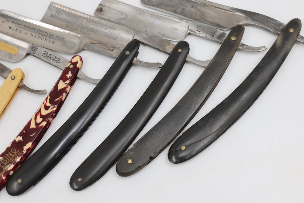 Ten Straight Razors with makers such as Wade & Butcher, Bing, and George Wostenholm, featuring celluloid, wood, and horn scales, with mixed hollow and wedge blade styles. Includes mutliple cases. Pickup only.