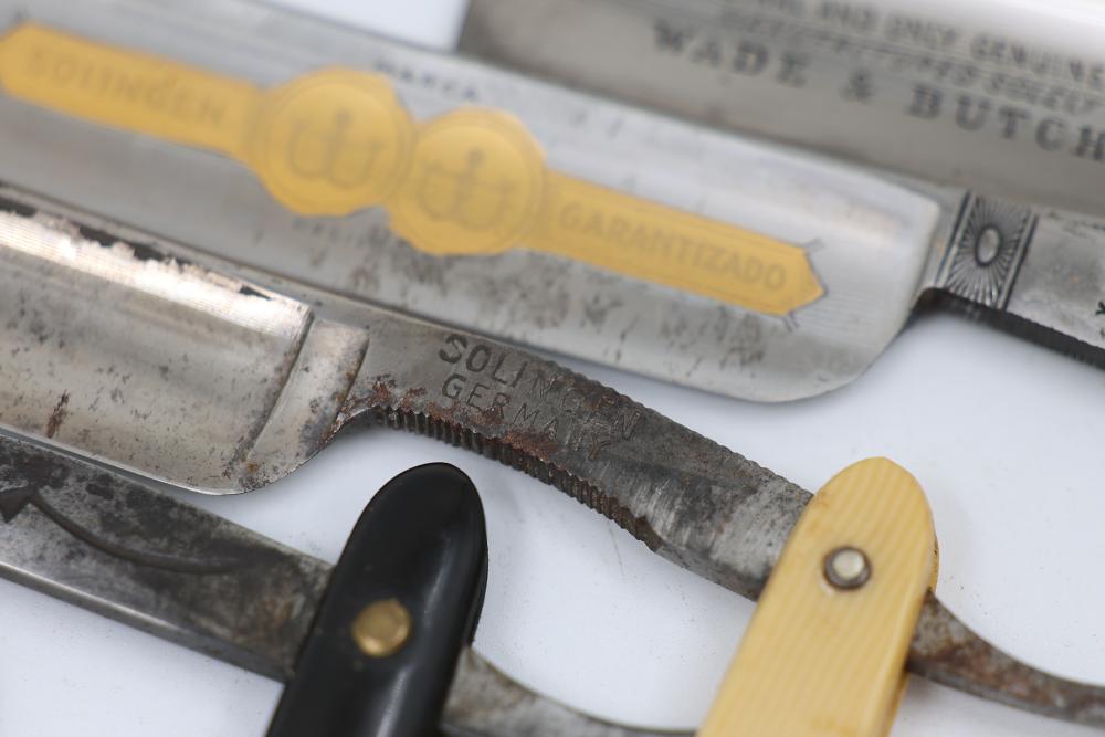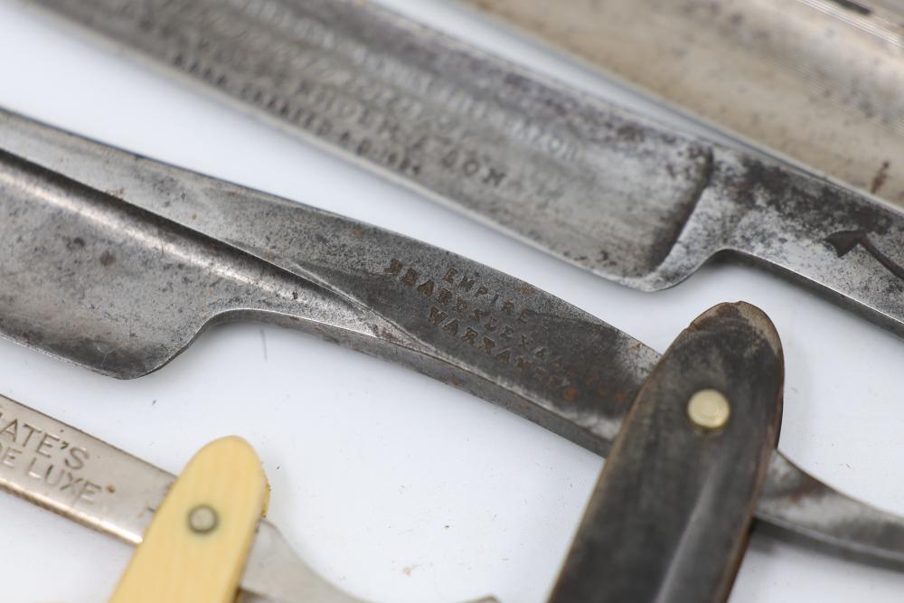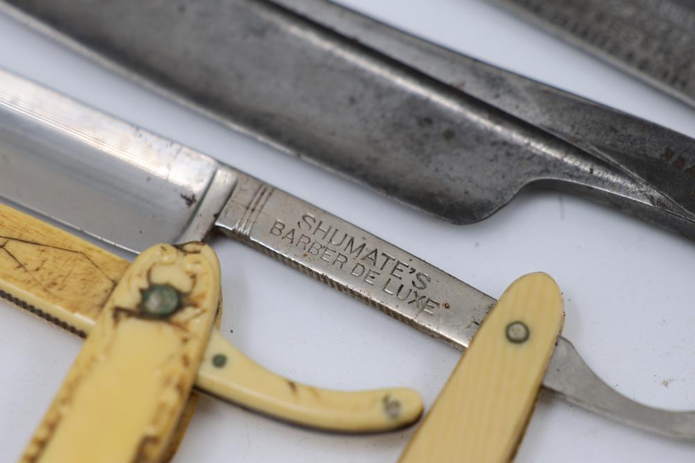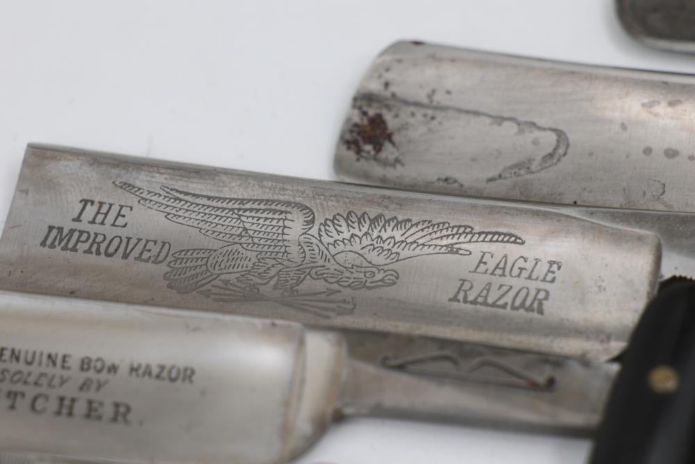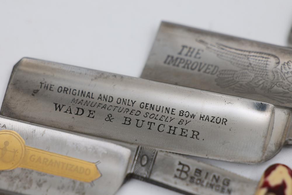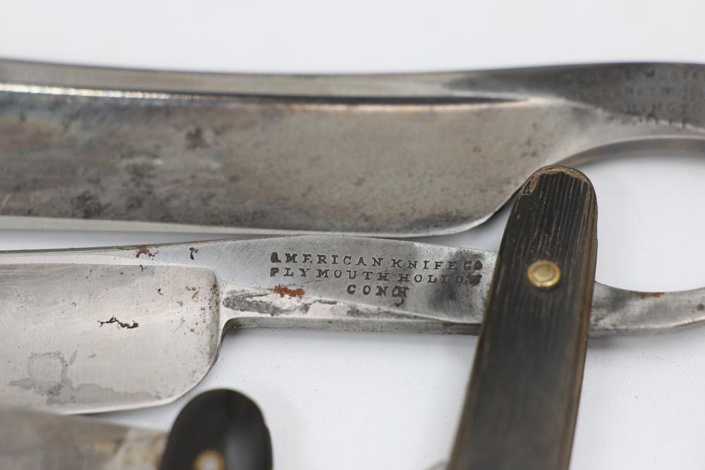 Items are from one straight razor collection & include cased matched pair of Joseph Rodgers & Sons straight razors having etched blade panels in velvet-lined Rodgers fitted case; etched motif Theodore Roosevelt & General Botha straight razor; Texas Luggage U.S. military style portable barber kit; porcelain shaving mugs with four lather brushes, collapsible compact travel shaving mirror with bowl; Warranted Razors having horn handles & notched Sheffield-style blades, etched Washington commemorative hollow blade with patriotic motif; Frederick Reynolds Sheffield straight razors; razors w/ mother of pearl scales/inlaid bar escutcheons/silver tone end caps/wedge-style blades; razors from Rogers & Sons, Wade & Butcher & Mappin's, featuring two horn scales & one celluloid with wedge style blades; razors from Clauss, J.A. Henckels, & H. Boker & Co., featuring mixed celluloid scales with hollow blades/includes multiple cases; barber accessories including razor strops/sharpening stones/boxed Schick blades; hair shapers; identification & value books & more. Items are located in Pleasant Valley, NY.
