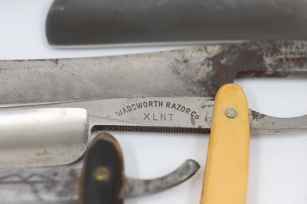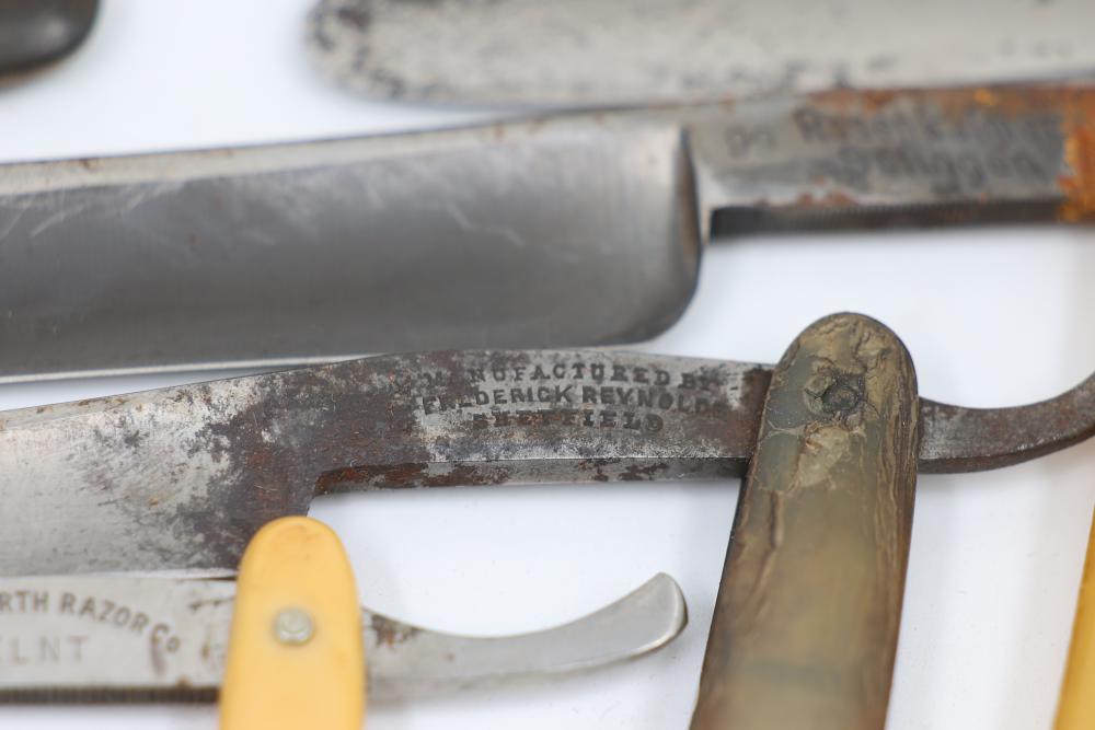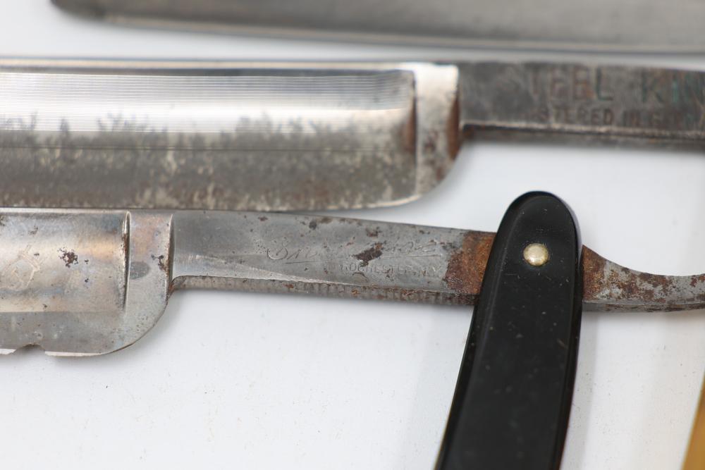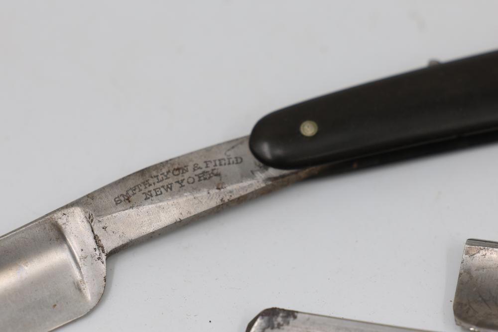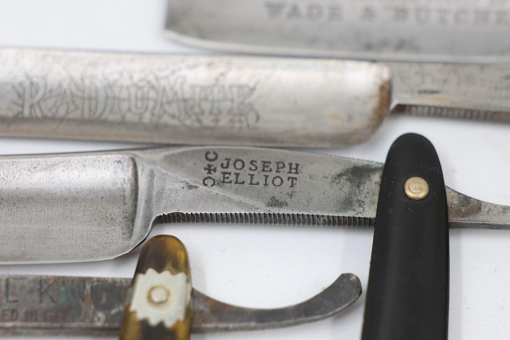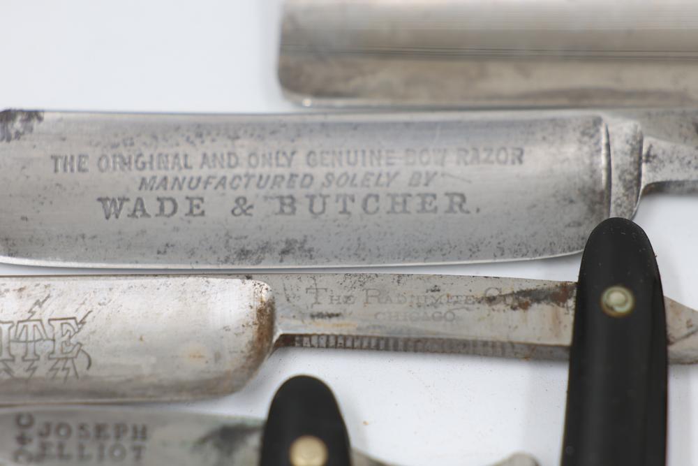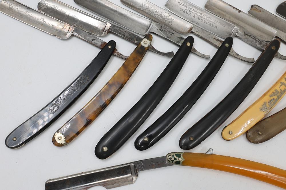 Items are from one straight razor collection & include cased matched pair of Joseph Rodgers & Sons straight razors having etched blade panels in velvet-lined Rodgers fitted case; etched motif Theodore Roosevelt & General Botha straight razor; Texas Luggage U.S. military style portable barber kit; porcelain shaving mugs with four lather brushes, collapsible compact travel shaving mirror with bowl; Warranted Razors having horn handles & notched Sheffield-style blades, etched Washington commemorative hollow blade with patriotic motif; Frederick Reynolds Sheffield straight razors; razors w/ mother of pearl scales/inlaid bar escutcheons/silver tone end caps/wedge-style blades; razors from Rogers & Sons, Wade & Butcher & Mappin's, featuring two horn scales & one celluloid with wedge style blades; razors from Clauss, J.A. Henckels, & H. Boker & Co., featuring mixed celluloid scales with hollow blades/includes multiple cases; barber accessories including razor strops/sharpening stones/boxed Schick blades; hair shapers; identification & value books & more. Items are located in Pleasant Valley, NY.