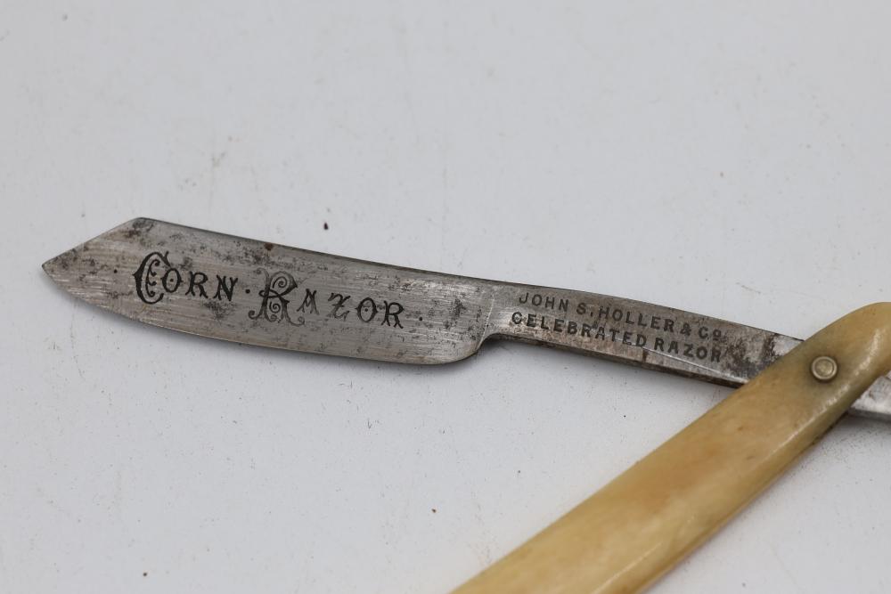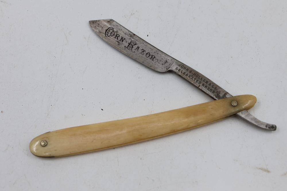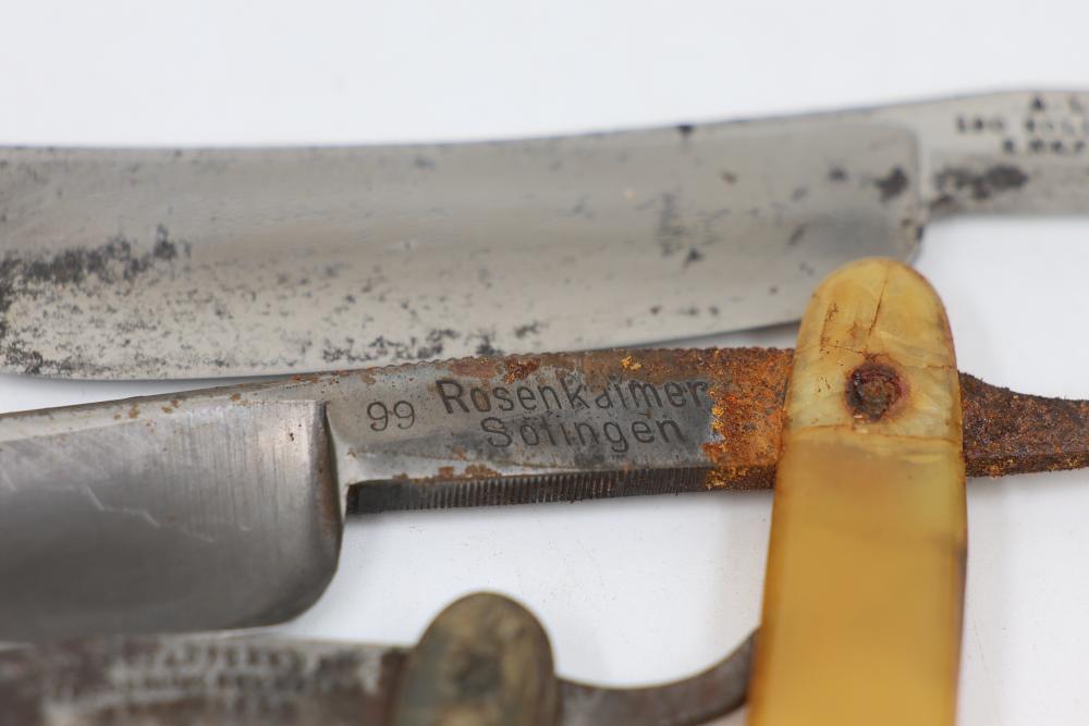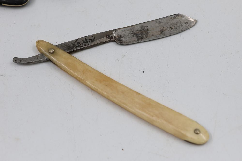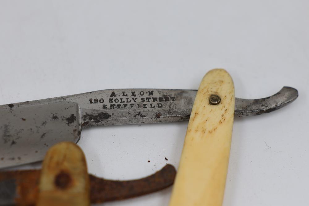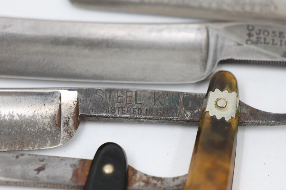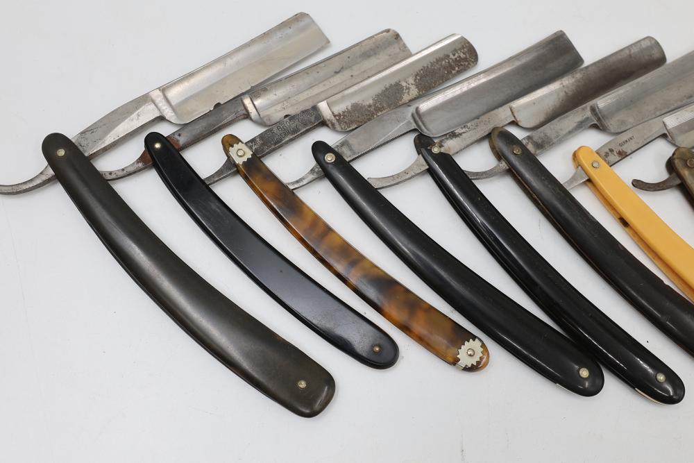 Items are from one straight razor collection & include cased matched pair of Joseph Rodgers & Sons straight razors having etched blade panels in velvet-lined Rodgers fitted case; etched motif Theodore Roosevelt & General Botha straight razor; Texas Luggage U.S. military style portable barber kit; porcelain shaving mugs with four lather brushes, collapsible compact travel shaving mirror with bowl; Warranted Razors having horn handles & notched Sheffield-style blades, etched Washington commemorative hollow blade with patriotic motif; Frederick Reynolds Sheffield straight razors; razors w/ mother of pearl scales/inlaid bar escutcheons/silver tone end caps/wedge-style blades; razors from Rogers & Sons, Wade & Butcher & Mappin's, featuring two horn scales & one celluloid with wedge style blades; razors from Clauss, J.A. Henckels, & H. Boker & Co., featuring mixed celluloid scales with hollow blades/includes multiple cases; barber accessories including razor strops/sharpening stones/boxed Schick blades; hair shapers; identification & value books & more. Items are located in Pleasant Valley, NY.