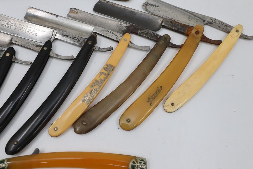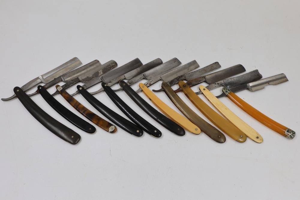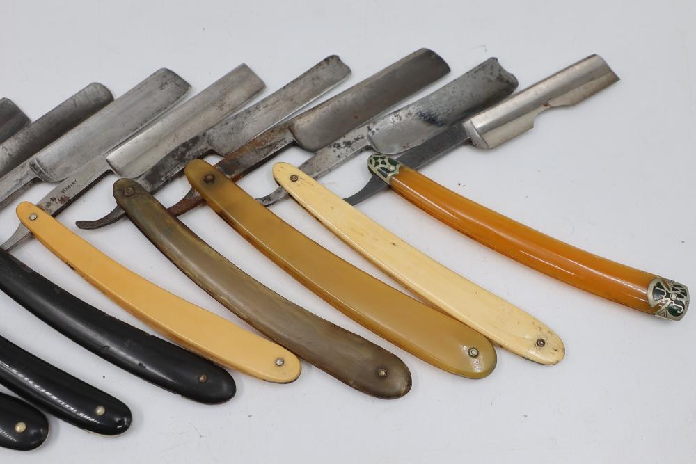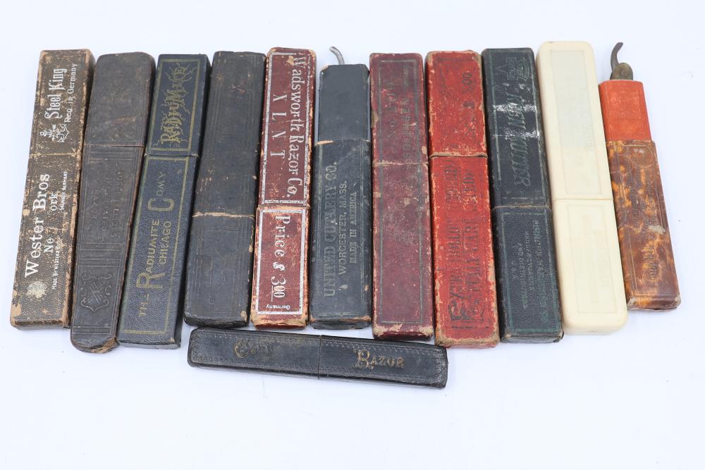12 Straight Razors with makers such as Robeson, John S. Holler & Co., and Rosenkeimer, featuring celluloid and horn scales, with hollow and wedge style blades. Includes multiple cases. See phots for details. Pickup only.