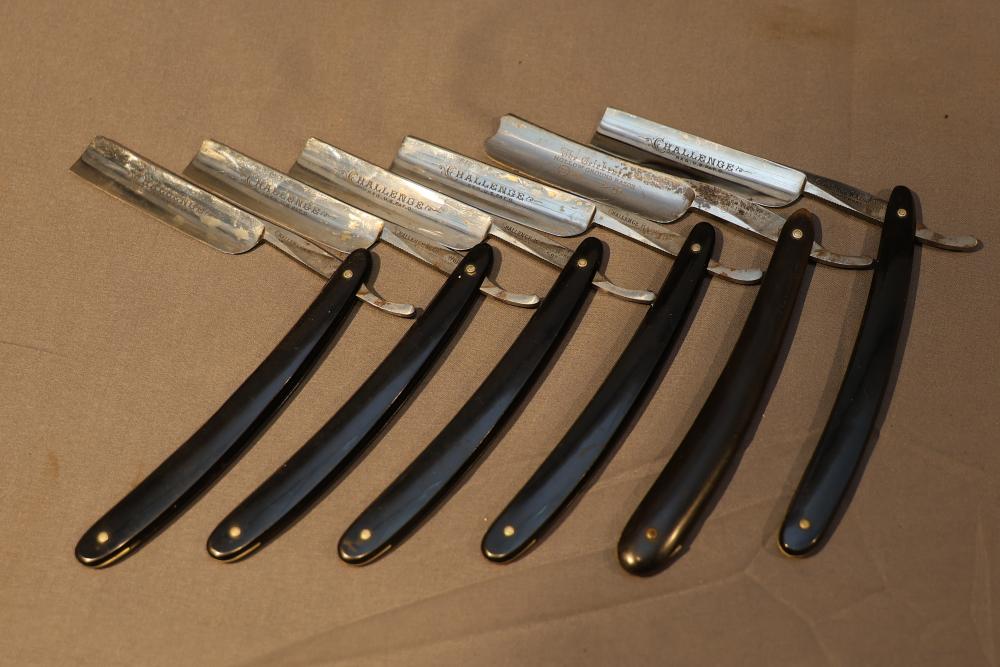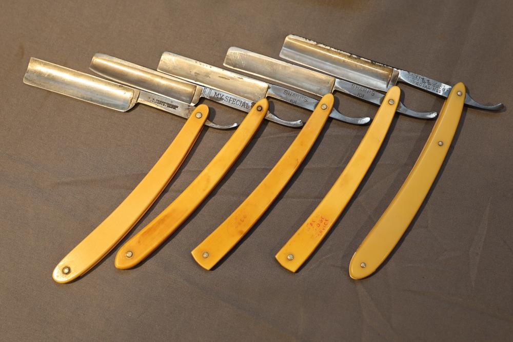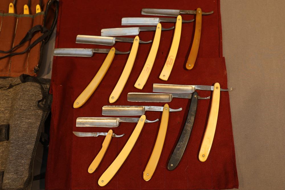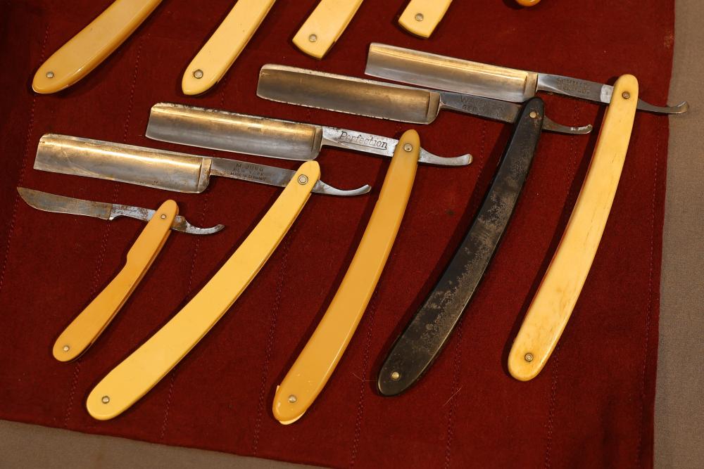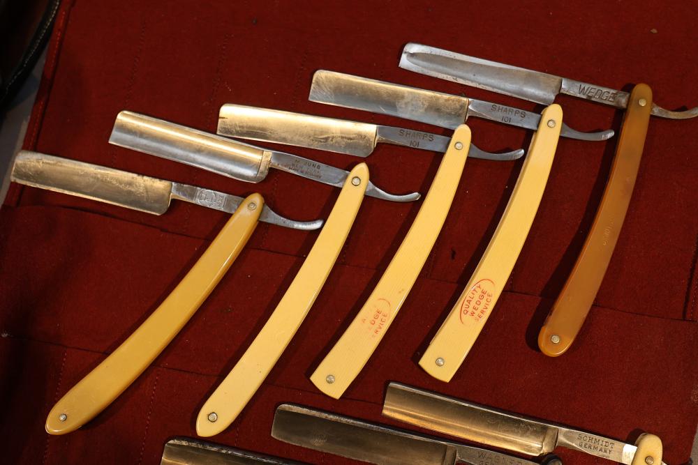 Items are from one straight razor collection & include cased matched pair of Joseph Rodgers & Sons straight razors having etched blade panels in velvet-lined Rodgers fitted case; etched motif Theodore Roosevelt & General Botha straight razor; Texas Luggage U.S. military style portable barber kit; porcelain shaving mugs with four lather brushes, collapsible compact travel shaving mirror with bowl; Warranted Razors having horn handles & notched Sheffield-style blades, etched Washington commemorative hollow blade with patriotic motif; Frederick Reynolds Sheffield straight razors; razors w/ mother of pearl scales/inlaid bar escutcheons/silver tone end caps/wedge-style blades; razors from Rogers & Sons, Wade & Butcher & Mappin's, featuring two horn scales & one celluloid with wedge style blades; razors from Clauss, J.A. Henckels, & H. Boker & Co., featuring mixed celluloid scales with hollow blades/includes multiple cases; barber accessories including razor strops/sharpening stones/boxed Schick blades; hair shapers; identification & value books & more. Items are located in Pleasant Valley, NY.
