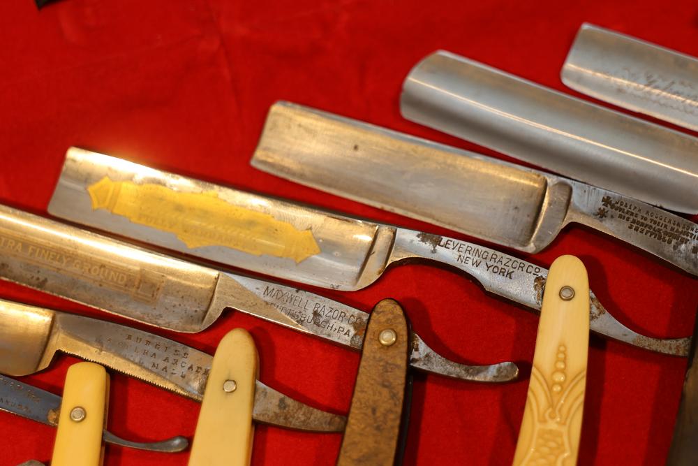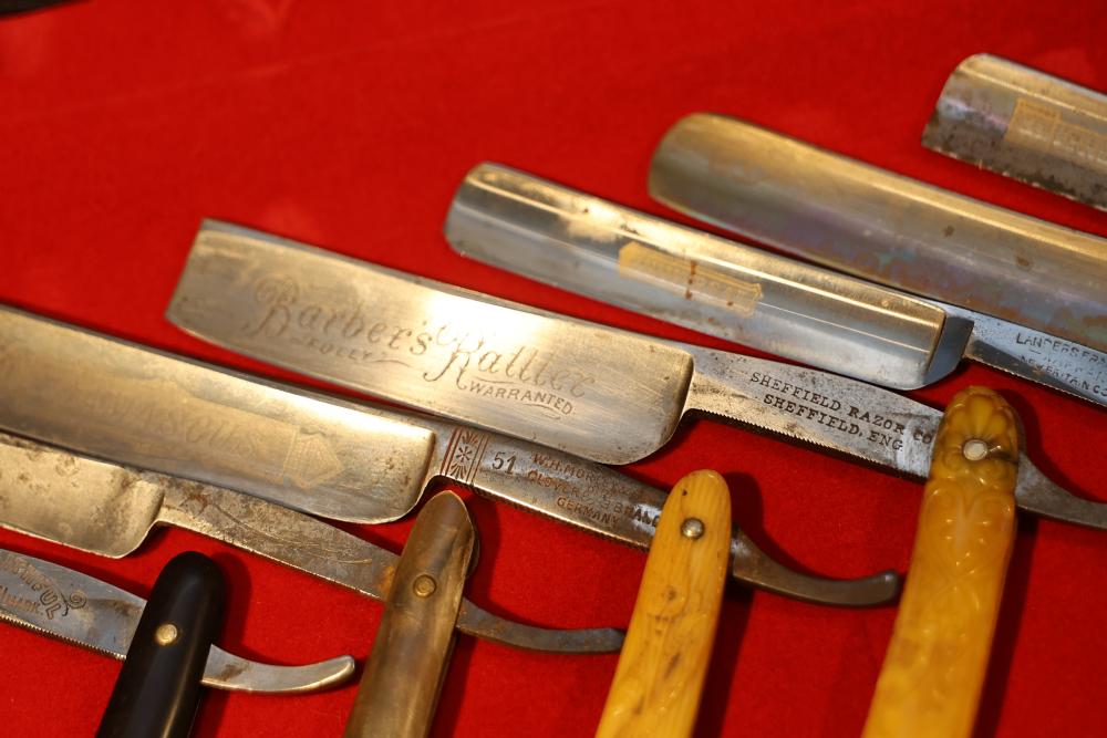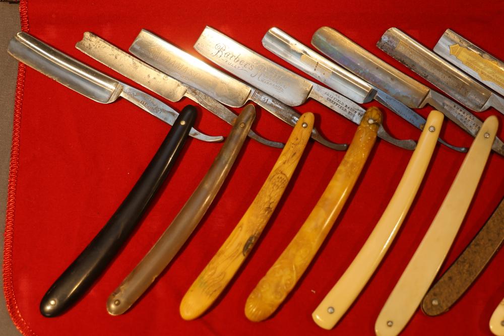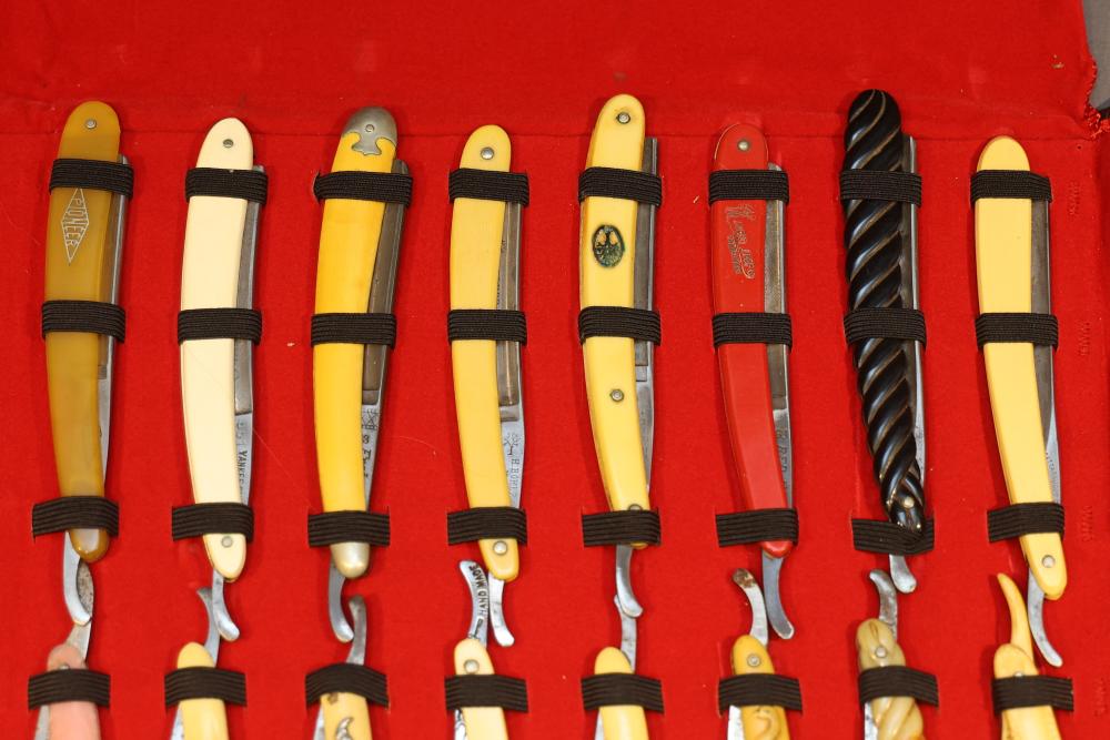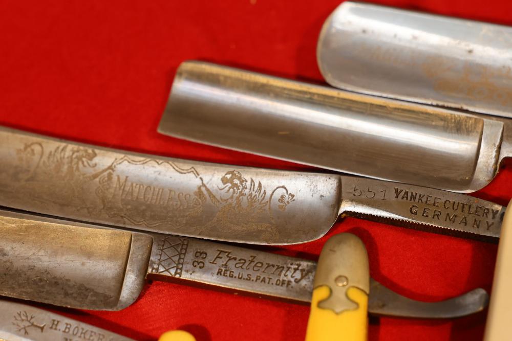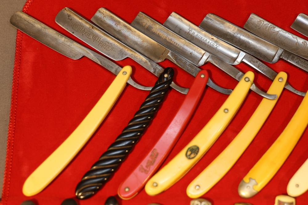 Items are from one straight razor collection & include cased matched pair of Joseph Rodgers & Sons straight razors having etched blade panels in velvet-lined Rodgers fitted case; etched motif Theodore Roosevelt & General Botha straight razor; Texas Luggage U.S. military style portable barber kit; porcelain shaving mugs with four lather brushes, collapsible compact travel shaving mirror with bowl; Warranted Razors having horn handles & notched Sheffield-style blades, etched Washington commemorative hollow blade with patriotic motif; Frederick Reynolds Sheffield straight razors; razors w/ mother of pearl scales/inlaid bar escutcheons/silver tone end caps/wedge-style blades; razors from Rogers & Sons, Wade & Butcher & Mappin's, featuring two horn scales & one celluloid with wedge style blades; razors from Clauss, J.A. Henckels, & H. Boker & Co., featuring mixed celluloid scales with hollow blades/includes multiple cases; barber accessories including razor strops/sharpening stones/boxed Schick blades; hair shapers; identification & value books & more. Items are located in Pleasant Valley, NY.