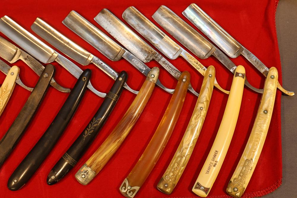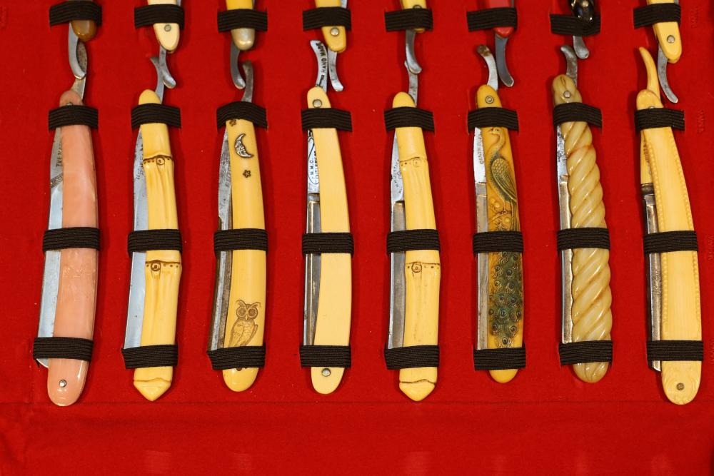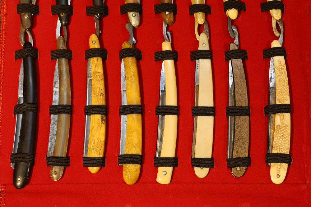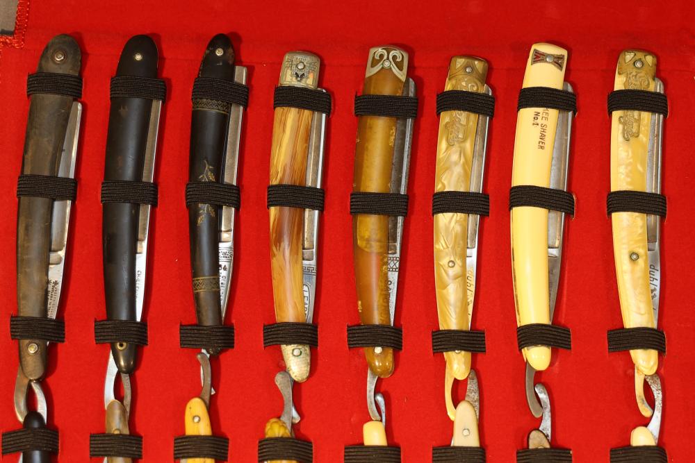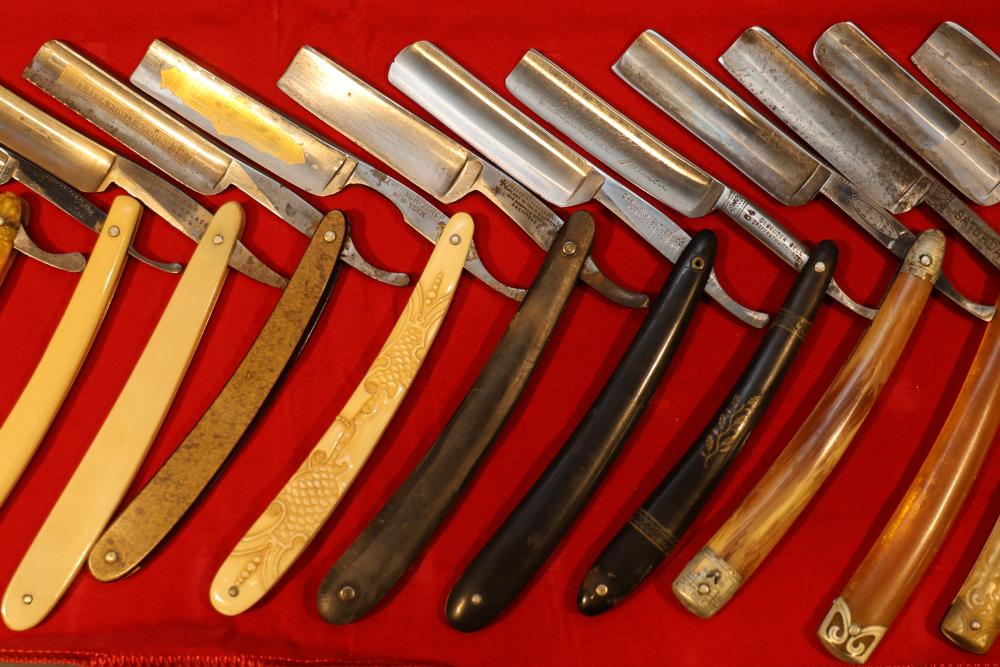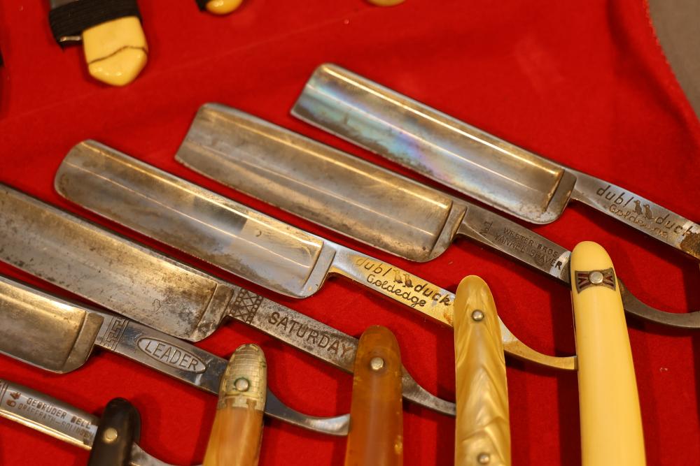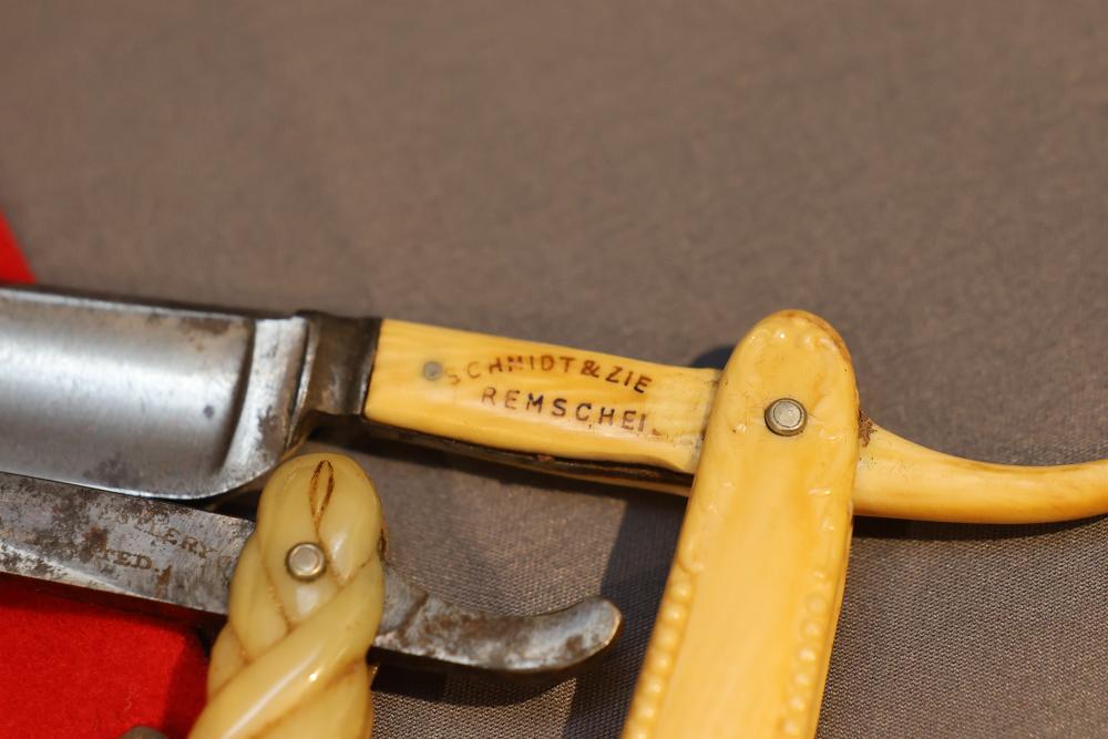 Items are from one straight razor collection & include cased matched pair of Joseph Rodgers & Sons straight razors having etched blade panels in velvet-lined Rodgers fitted case; etched motif Theodore Roosevelt & General Botha straight razor; Texas Luggage U.S. military style portable barber kit; porcelain shaving mugs with four lather brushes, collapsible compact travel shaving mirror with bowl; Warranted Razors having horn handles & notched Sheffield-style blades, etched Washington commemorative hollow blade with patriotic motif; Frederick Reynolds Sheffield straight razors; razors w/ mother of pearl scales/inlaid bar escutcheons/silver tone end caps/wedge-style blades; razors from Rogers & Sons, Wade & Butcher & Mappin's, featuring two horn scales & one celluloid with wedge style blades; razors from Clauss, J.A. Henckels, & H. Boker & Co., featuring mixed celluloid scales with hollow blades/includes multiple cases; barber accessories including razor strops/sharpening stones/boxed Schick blades; hair shapers; identification & value books & more. Items are located in Pleasant Valley, NY.