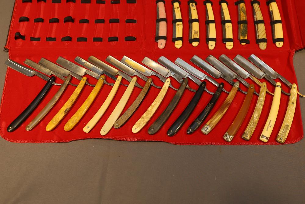 32 Straight Razors from makers such as Dubl Duck, A.J. Jordan, and H.M. Justice, featuring decorative scales in celluloid, horn, and wood, with mixed wedge and hollow blade styles. Includes a leather hardcase with a red soft cloth interior and snap buttons for storage. Pickup only.