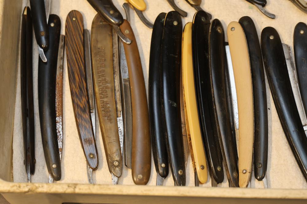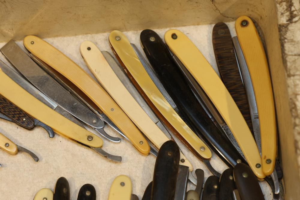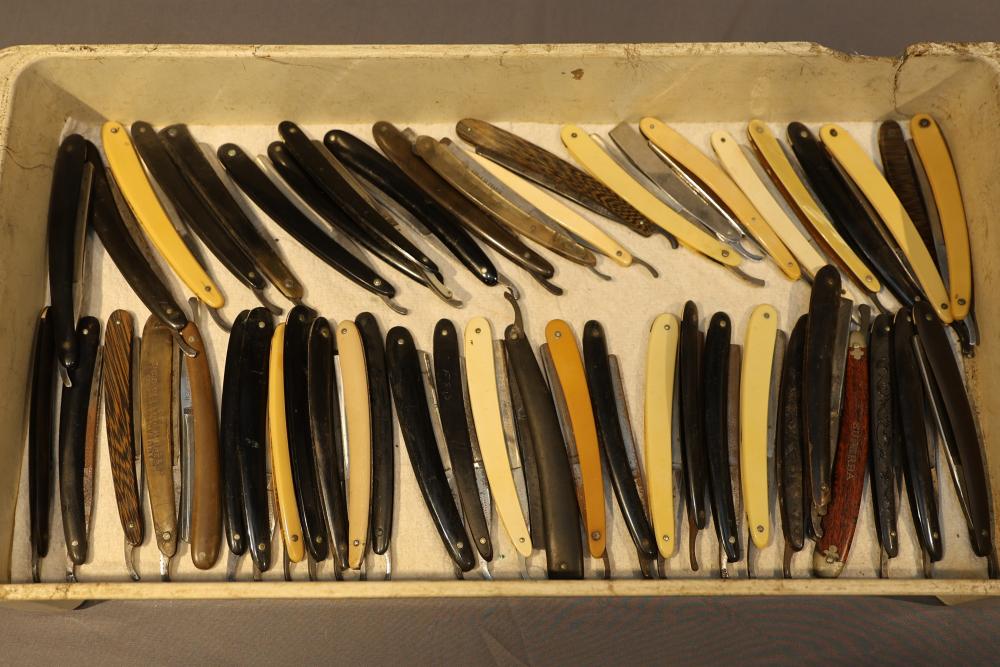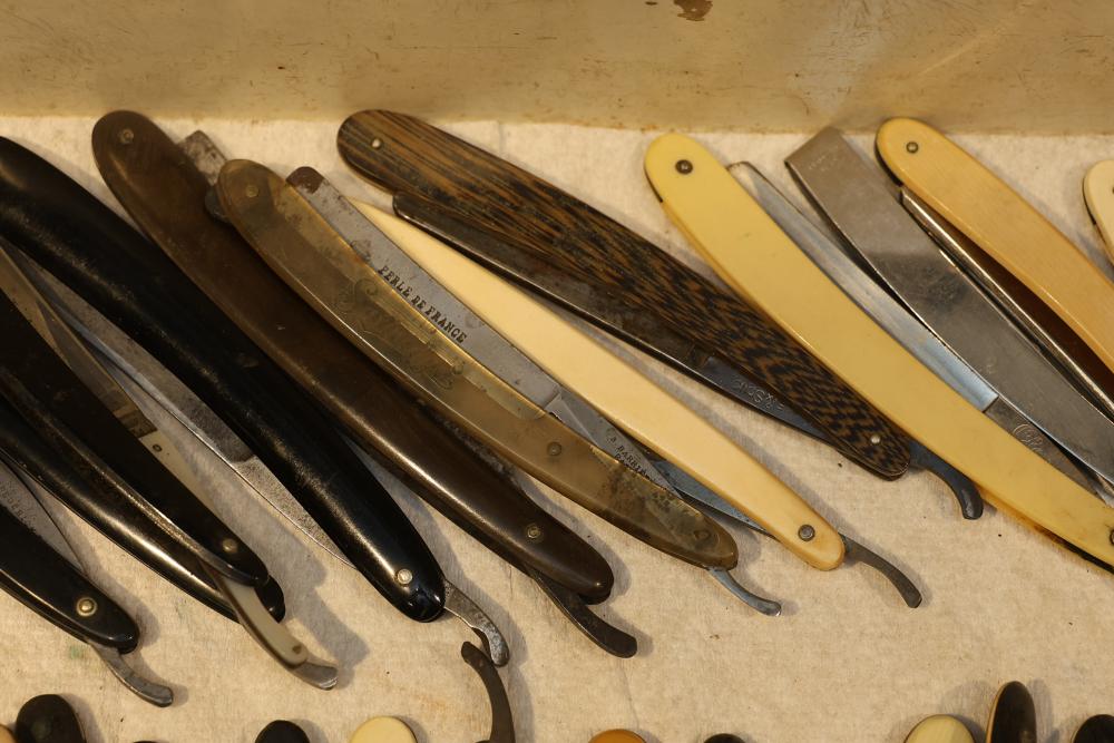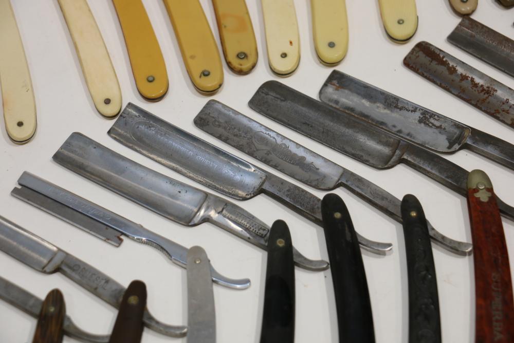 49 Straight Razors from many different makers such as J.R. Torrey, W.R. Case, and M.E. Reppenhagen, featuring horn and celluloid scales, with mixed wedge blades. One has a mother of pearl blade end. Pickup only.