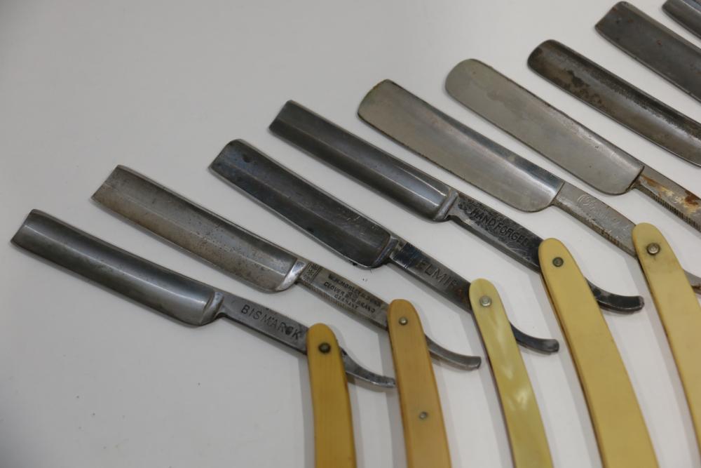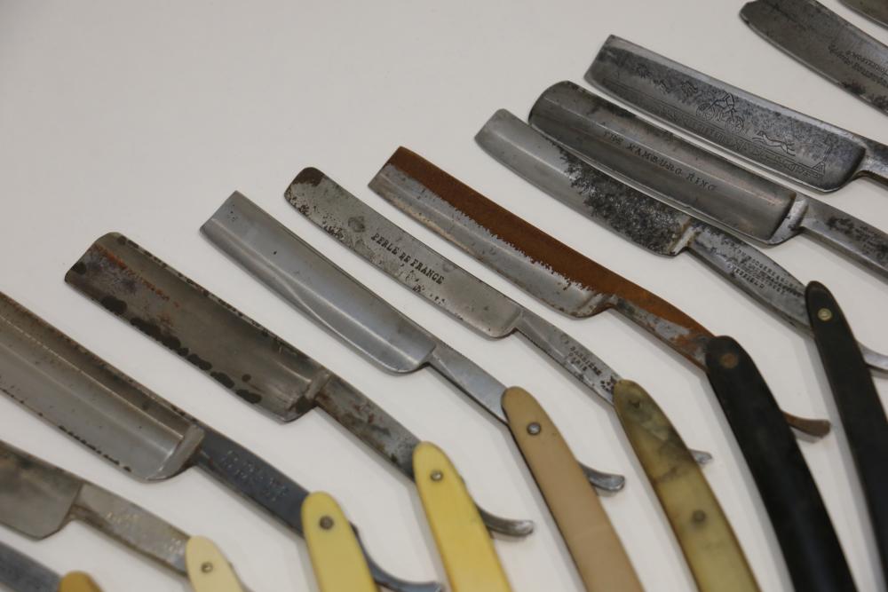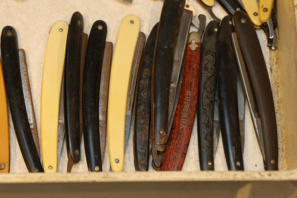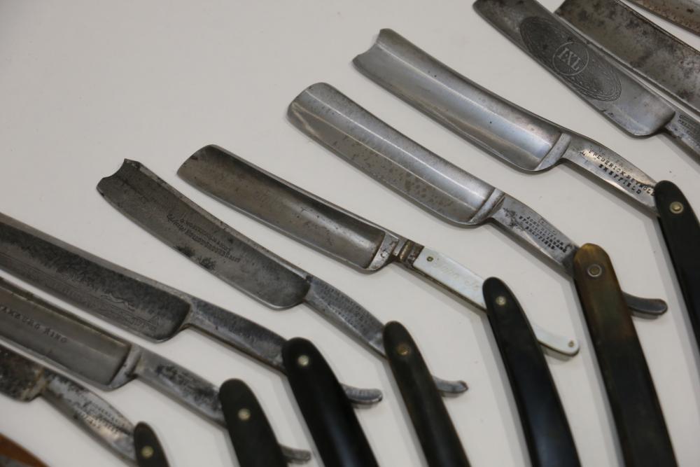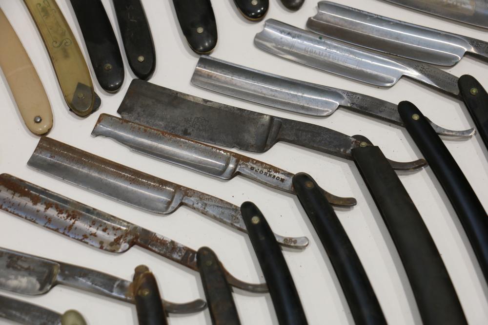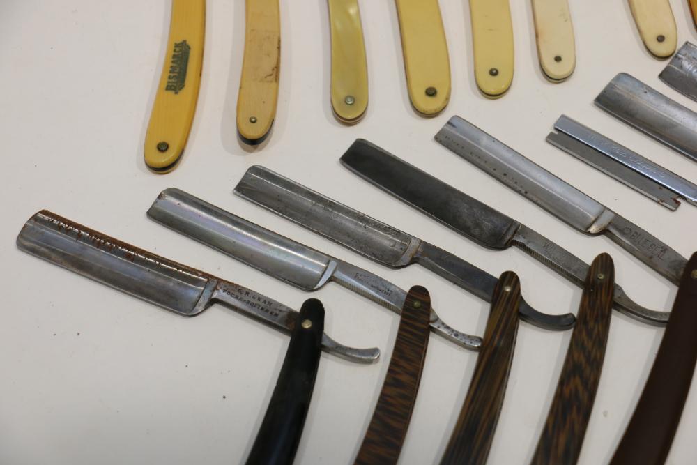 49 Straight Razors from many different makers such as J.R. Torrey, W.R. Case, and M.E. Reppenhagen, featuring horn and celluloid scales, with mixed wedge blades. One has a mother of pearl blade end. Pickup only.