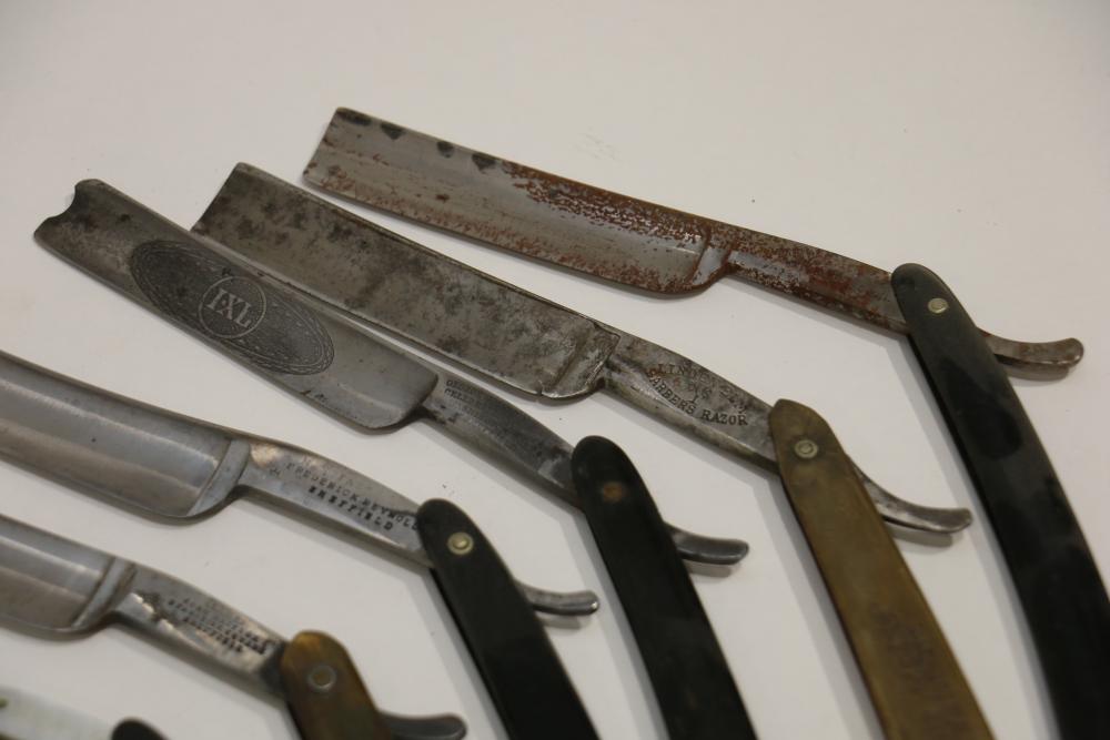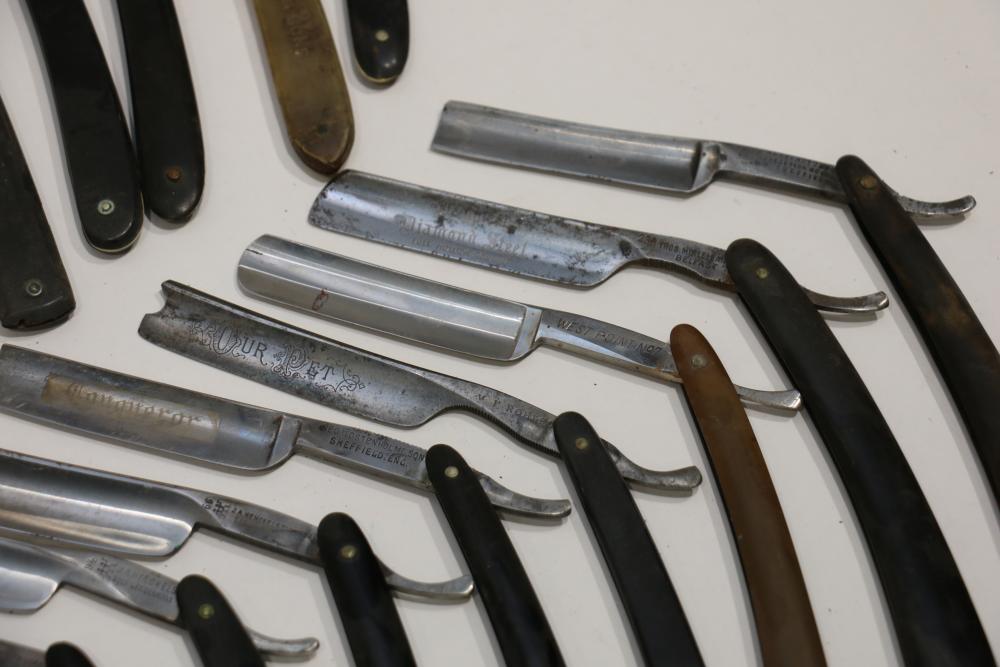 Items are from one straight razor collection & include cased matched pair of Joseph Rodgers & Sons straight razors having etched blade panels in velvet-lined Rodgers fitted case; etched motif Theodore Roosevelt & General Botha straight razor; Texas Luggage U.S. military style portable barber kit; porcelain shaving mugs with four lather brushes, collapsible compact travel shaving mirror with bowl; Warranted Razors having horn handles & notched Sheffield-style blades, etched Washington commemorative hollow blade with patriotic motif; Frederick Reynolds Sheffield straight razors; razors w/ mother of pearl scales/inlaid bar escutcheons/silver tone end caps/wedge-style blades; razors from Rogers & Sons, Wade & Butcher & Mappin's, featuring two horn scales & one celluloid with wedge style blades; razors from Clauss, J.A. Henckels, & H. Boker & Co., featuring mixed celluloid scales with hollow blades/includes multiple cases; barber accessories including razor strops/sharpening stones/boxed Schick blades; hair shapers; identification & value books & more. Items are located in Pleasant Valley, NY.