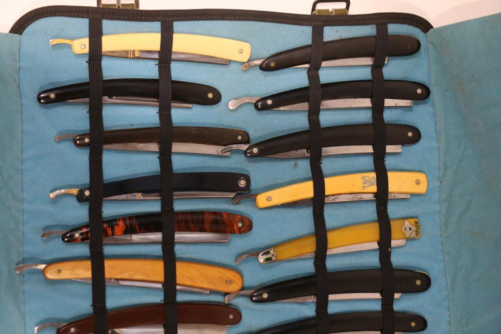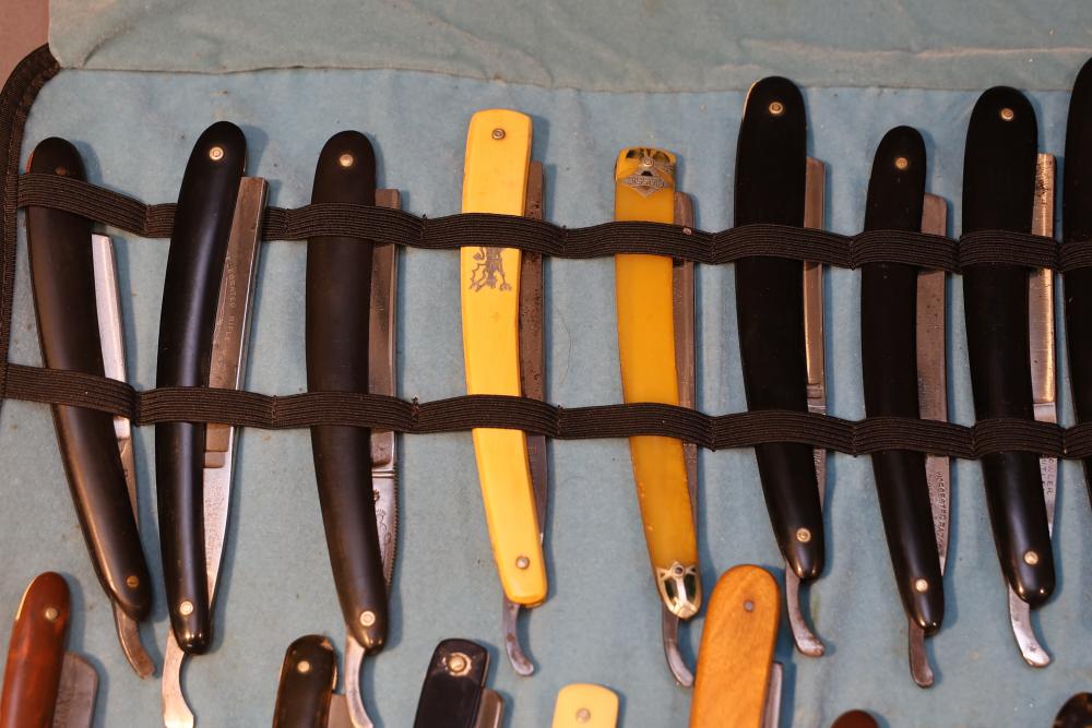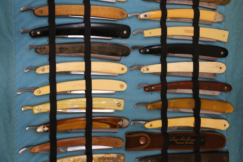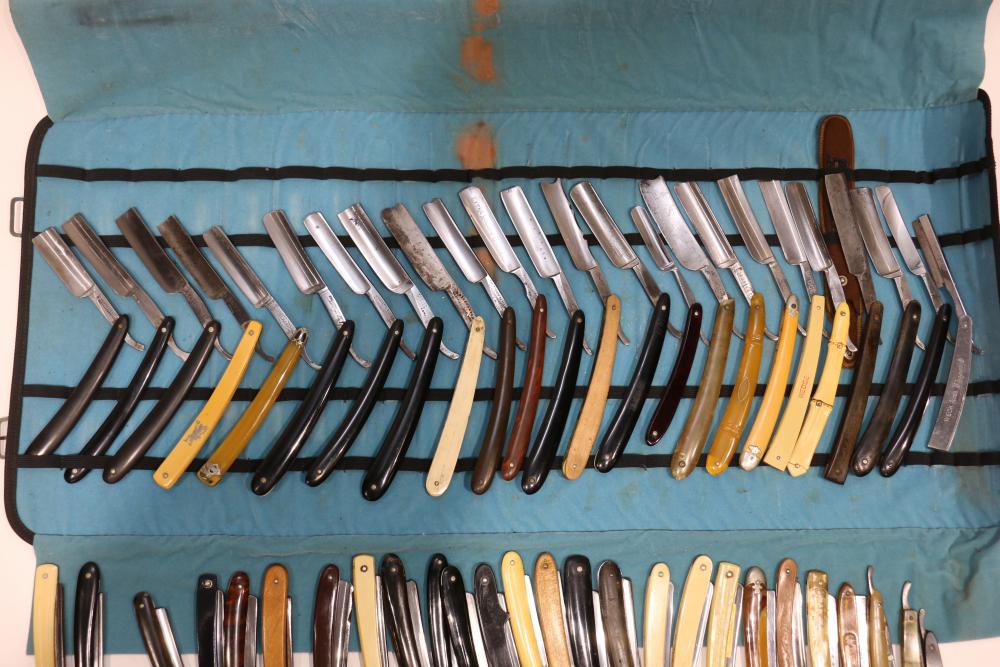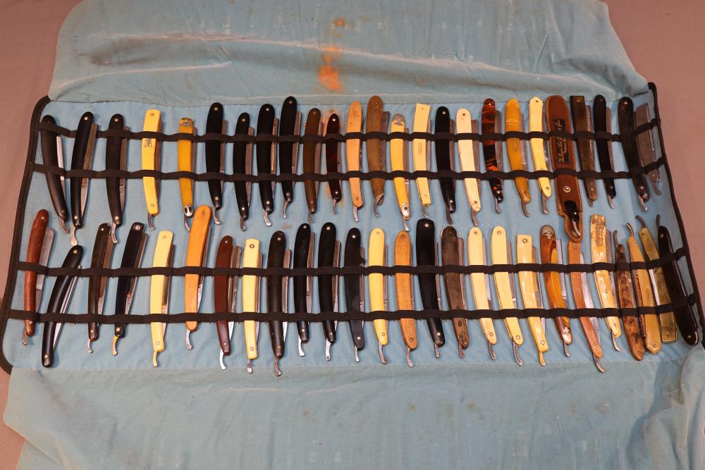 51 Straight Razors from many different makers such as M. Wolkin, Cattaraugus, and L. West, featuring celluloid, wood, and horn scales, with hollow and wedge style blades. Includes a leather rollup case with a blue softcloth interior and external handle with belt straps for storage. Pickup only.
