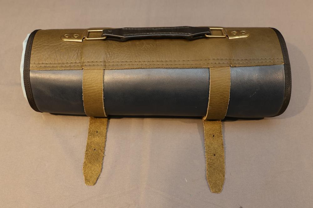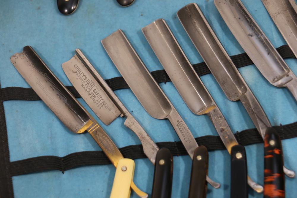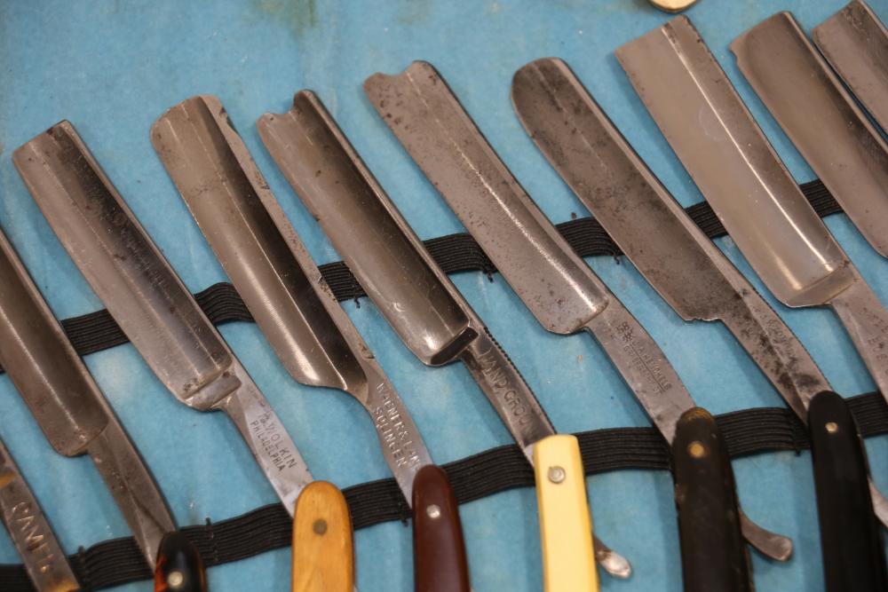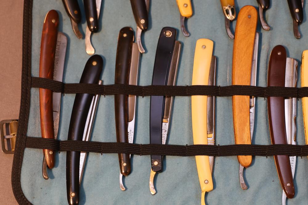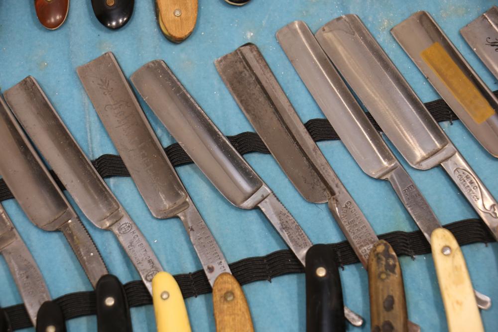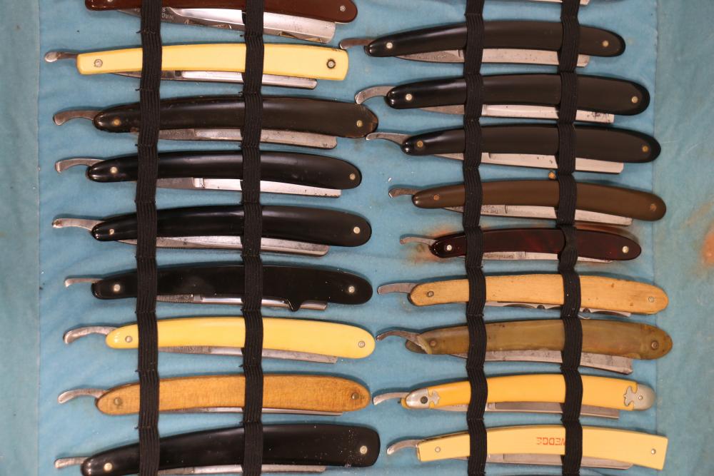 51 Straight Razors from many different makers such as M. Wolkin, Cattaraugus, and L. West, featuring celluloid, wood, and horn scales, with hollow and wedge style blades. Includes a leather rollup case with a blue softcloth interior and external handle with belt straps for storage. Pickup only.