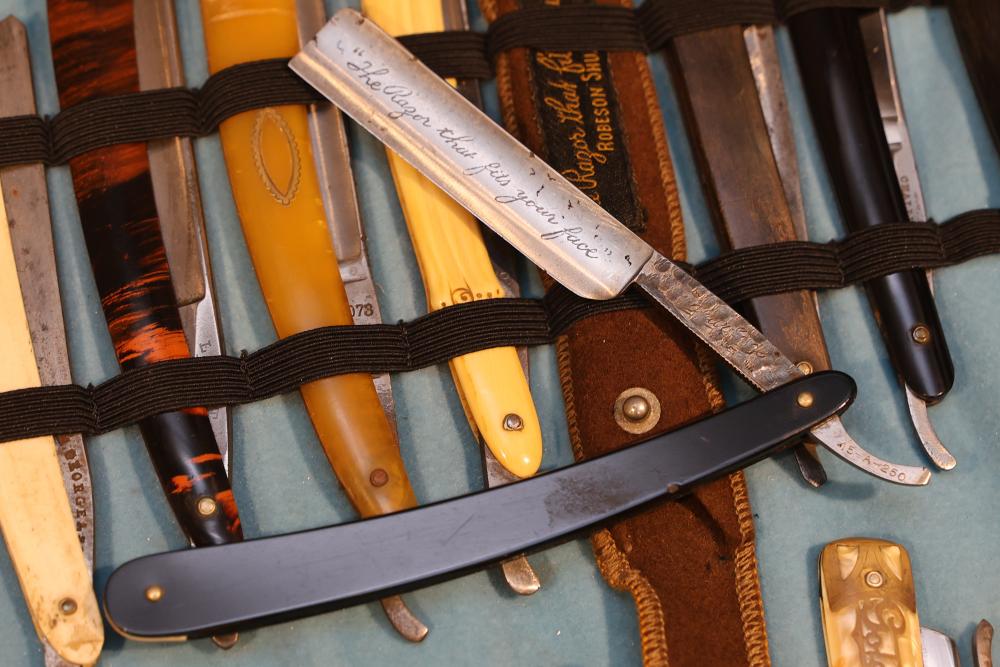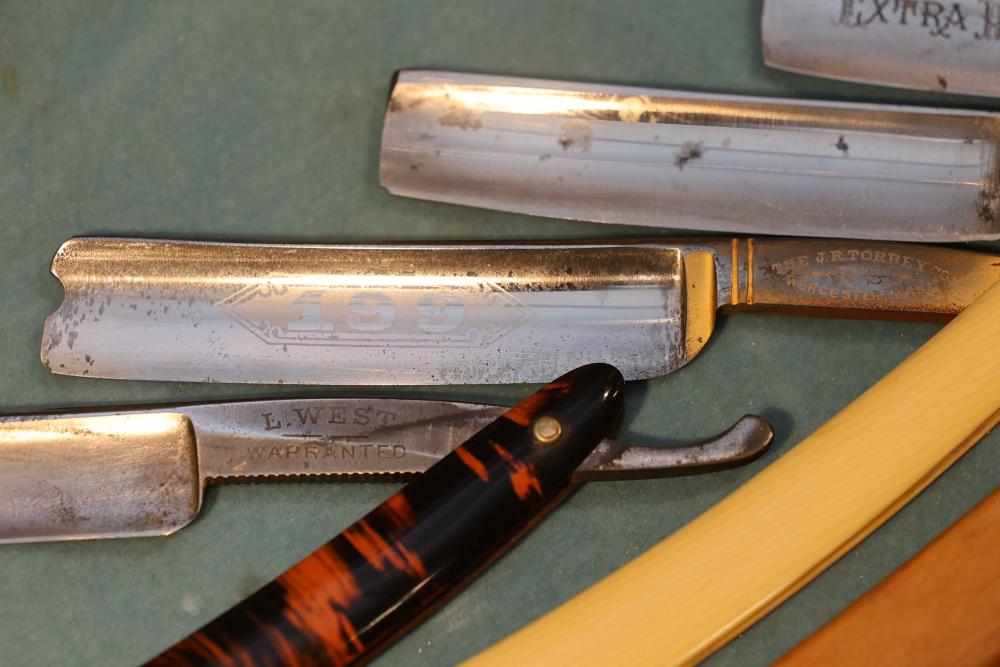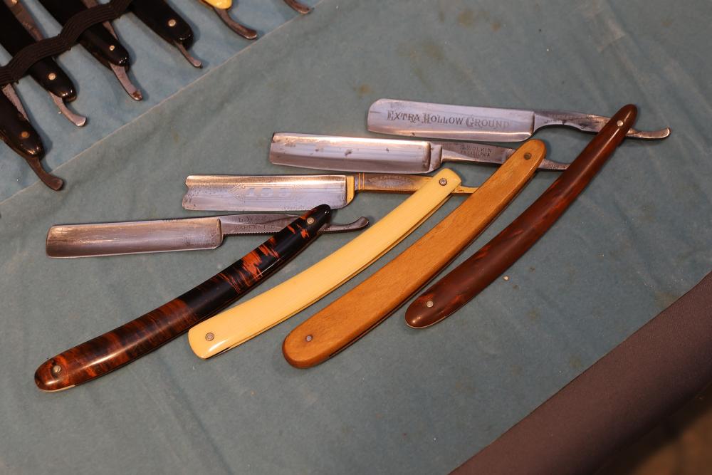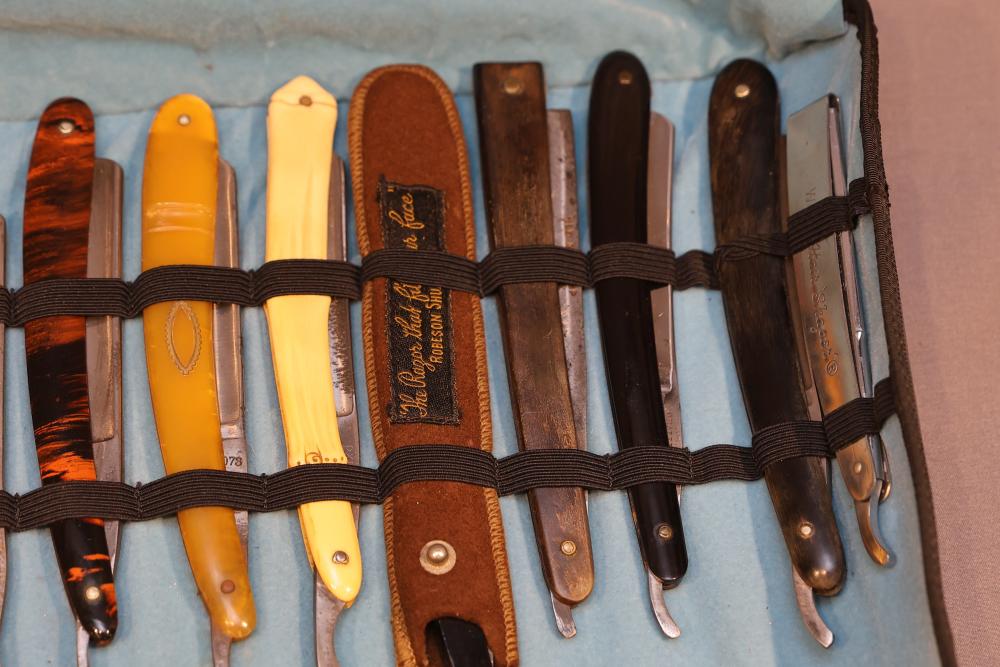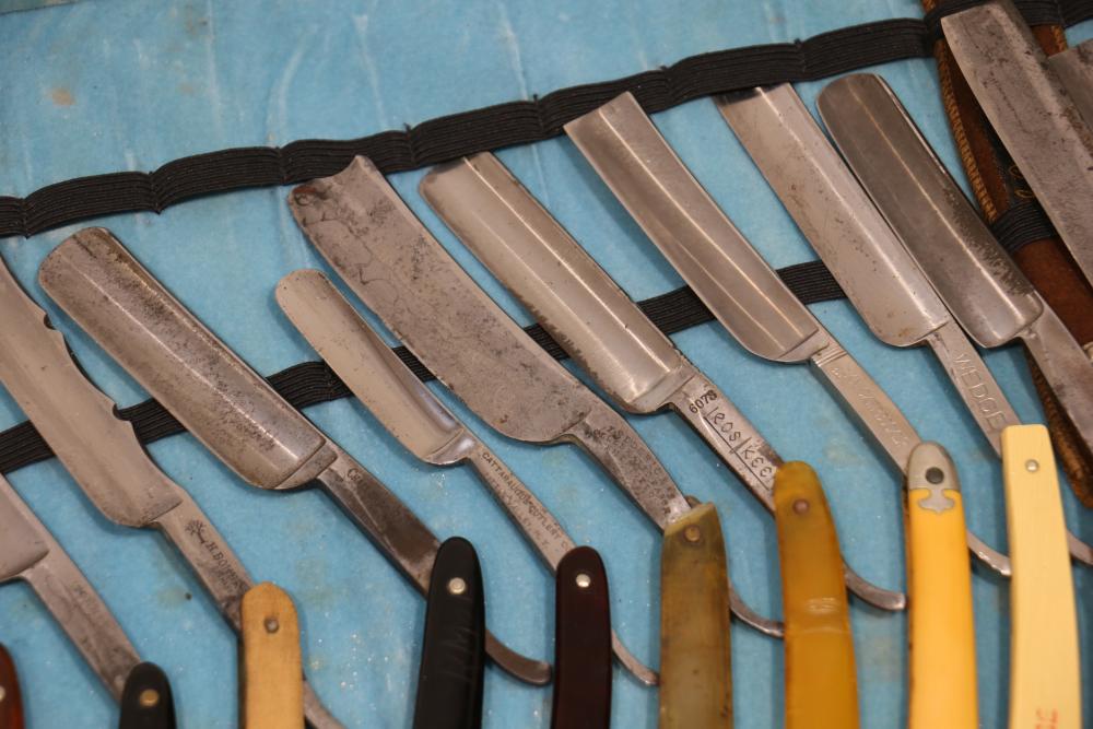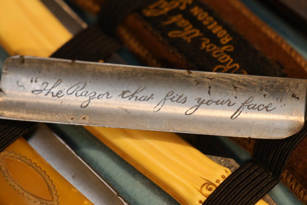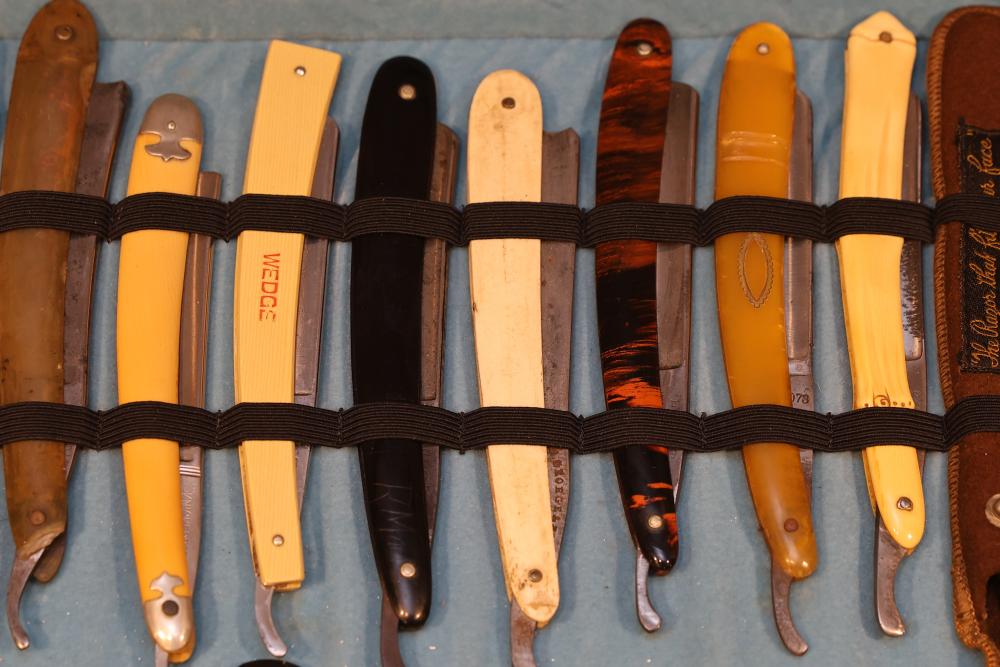 Items are from one straight razor collection & include cased matched pair of Joseph Rodgers & Sons straight razors having etched blade panels in velvet-lined Rodgers fitted case; etched motif Theodore Roosevelt & General Botha straight razor; Texas Luggage U.S. military style portable barber kit; porcelain shaving mugs with four lather brushes, collapsible compact travel shaving mirror with bowl; Warranted Razors having horn handles & notched Sheffield-style blades, etched Washington commemorative hollow blade with patriotic motif; Frederick Reynolds Sheffield straight razors; razors w/ mother of pearl scales/inlaid bar escutcheons/silver tone end caps/wedge-style blades; razors from Rogers & Sons, Wade & Butcher & Mappin's, featuring two horn scales & one celluloid with wedge style blades; razors from Clauss, J.A. Henckels, & H. Boker & Co., featuring mixed celluloid scales with hollow blades/includes multiple cases; barber accessories including razor strops/sharpening stones/boxed Schick blades; hair shapers; identification & value books & more. Items are located in Pleasant Valley, NY.