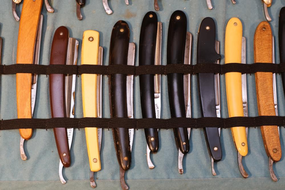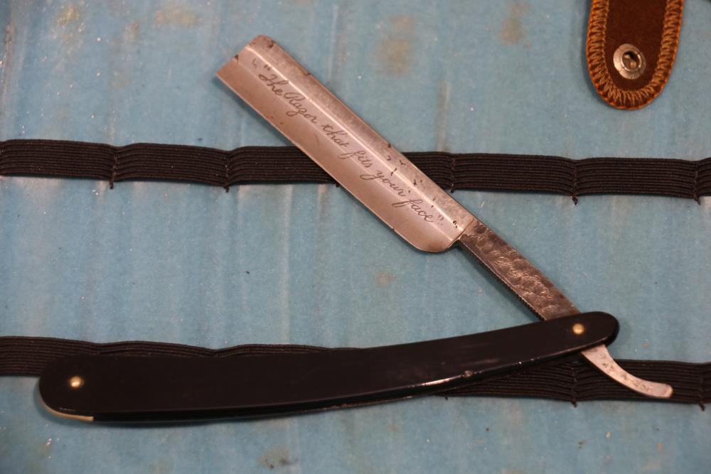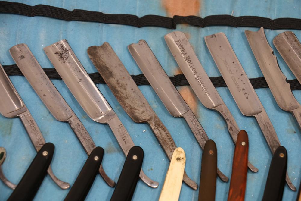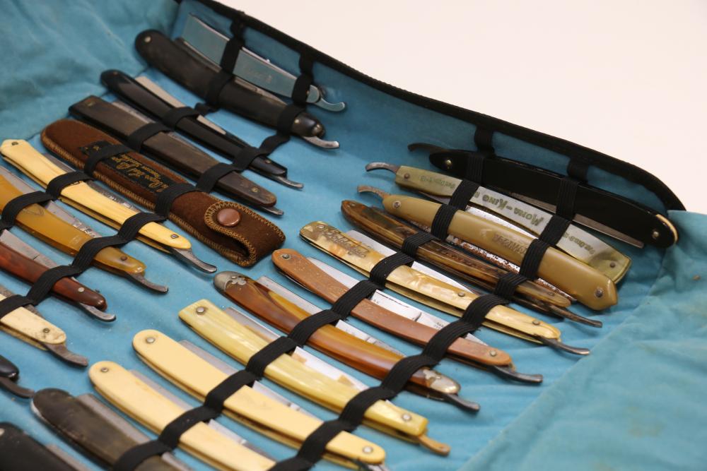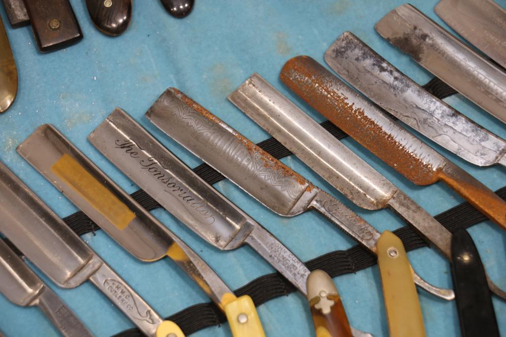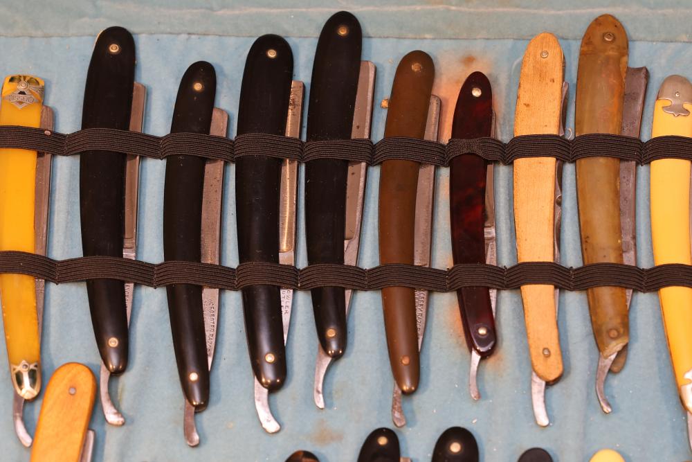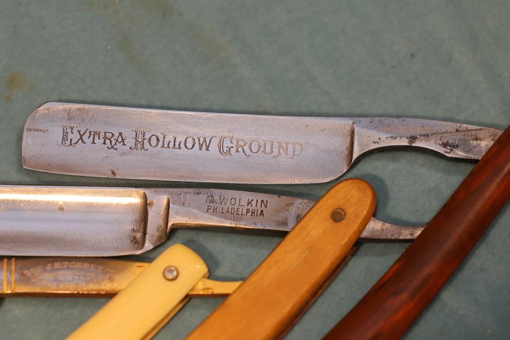 Items are from one straight razor collection & include cased matched pair of Joseph Rodgers & Sons straight razors having etched blade panels in velvet-lined Rodgers fitted case; etched motif Theodore Roosevelt & General Botha straight razor; Texas Luggage U.S. military style portable barber kit; porcelain shaving mugs with four lather brushes, collapsible compact travel shaving mirror with bowl; Warranted Razors having horn handles & notched Sheffield-style blades, etched Washington commemorative hollow blade with patriotic motif; Frederick Reynolds Sheffield straight razors; razors w/ mother of pearl scales/inlaid bar escutcheons/silver tone end caps/wedge-style blades; razors from Rogers & Sons, Wade & Butcher & Mappin's, featuring two horn scales & one celluloid with wedge style blades; razors from Clauss, J.A. Henckels, & H. Boker & Co., featuring mixed celluloid scales with hollow blades/includes multiple cases; barber accessories including razor strops/sharpening stones/boxed Schick blades; hair shapers; identification & value books & more. Items are located in Pleasant Valley, NY.