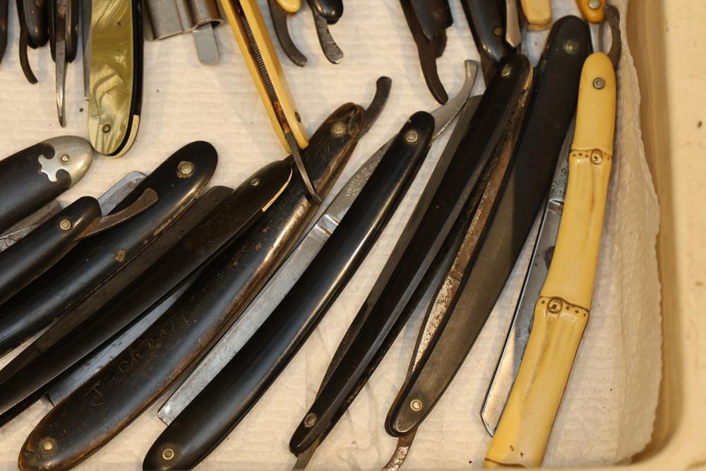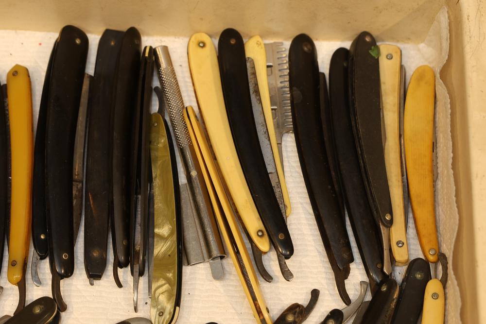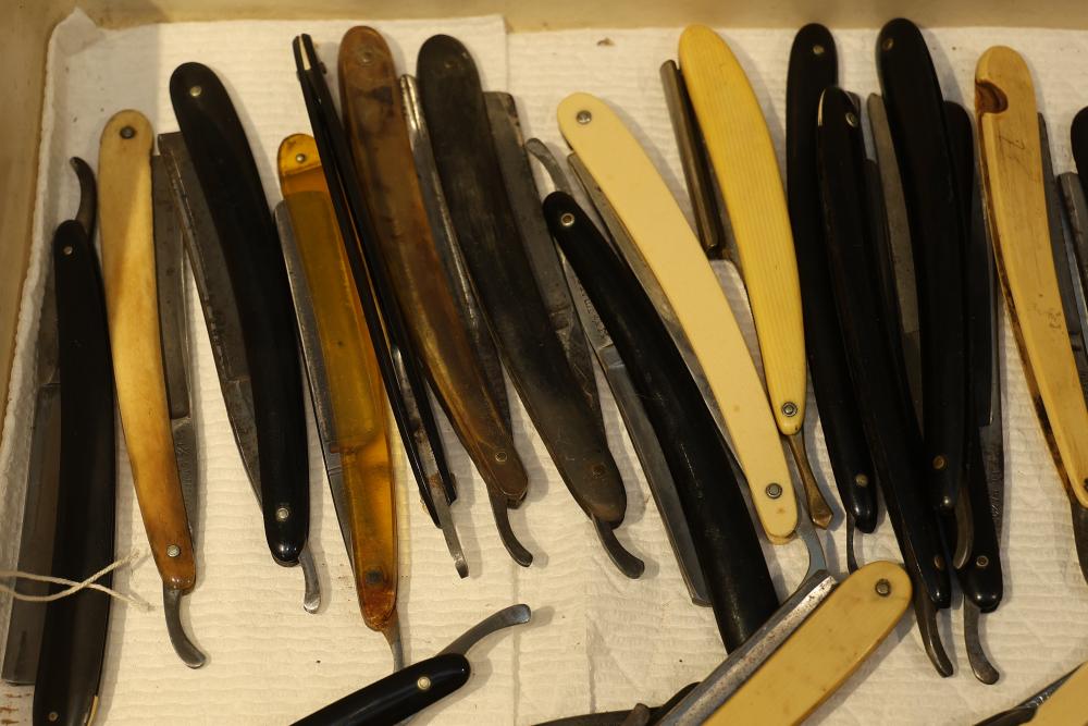 51 Straight Razors from many different makers such as T. Noonan & Sons, Shumate Razor Co., and C. Spagna, featuring horn and celluloid scales, with variations of wedge blades. Pickup only.