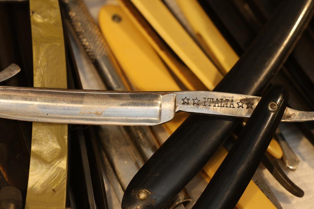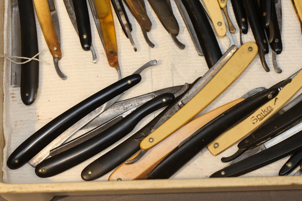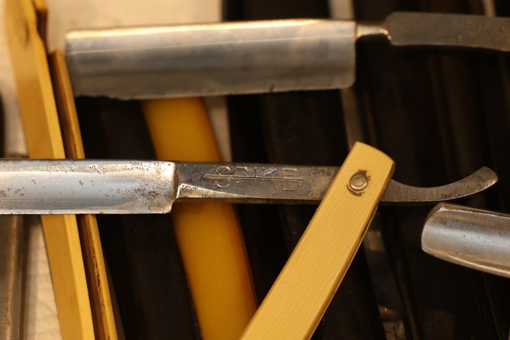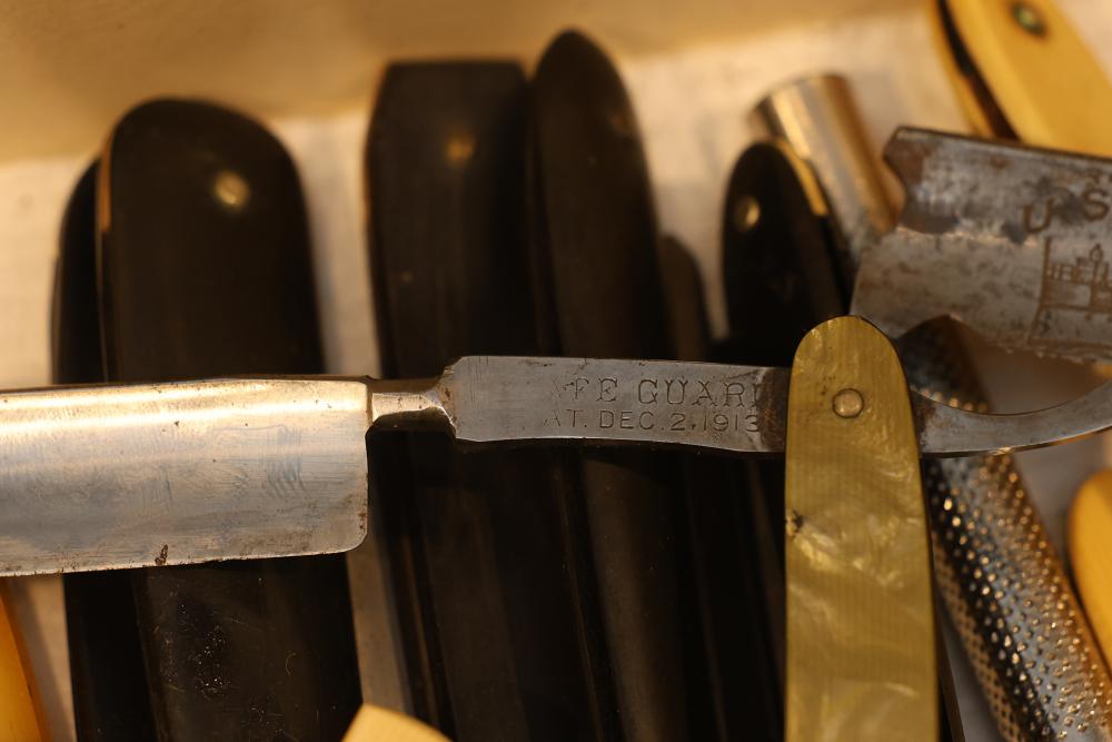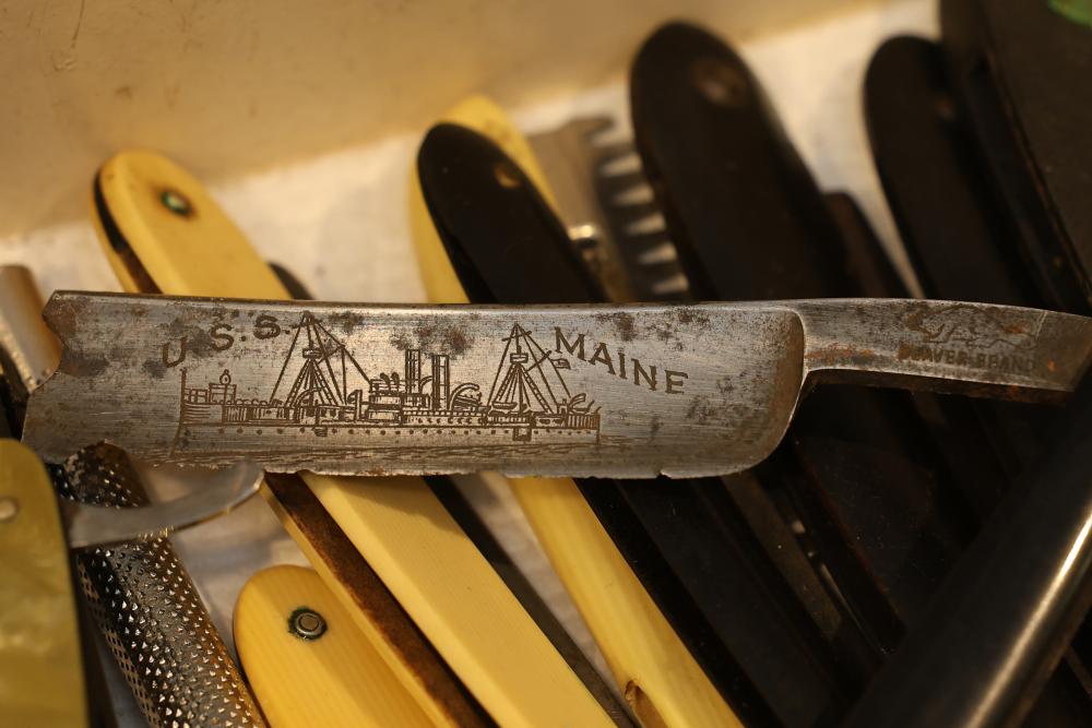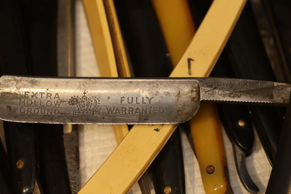 Items are from one straight razor collection & include cased matched pair of Joseph Rodgers & Sons straight razors having etched blade panels in velvet-lined Rodgers fitted case; etched motif Theodore Roosevelt & General Botha straight razor; Texas Luggage U.S. military style portable barber kit; porcelain shaving mugs with four lather brushes, collapsible compact travel shaving mirror with bowl; Warranted Razors having horn handles & notched Sheffield-style blades, etched Washington commemorative hollow blade with patriotic motif; Frederick Reynolds Sheffield straight razors; razors w/ mother of pearl scales/inlaid bar escutcheons/silver tone end caps/wedge-style blades; razors from Rogers & Sons, Wade & Butcher & Mappin's, featuring two horn scales & one celluloid with wedge style blades; razors from Clauss, J.A. Henckels, & H. Boker & Co., featuring mixed celluloid scales with hollow blades/includes multiple cases; barber accessories including razor strops/sharpening stones/boxed Schick blades; hair shapers; identification & value books & more. Items are located in Pleasant Valley, NY.