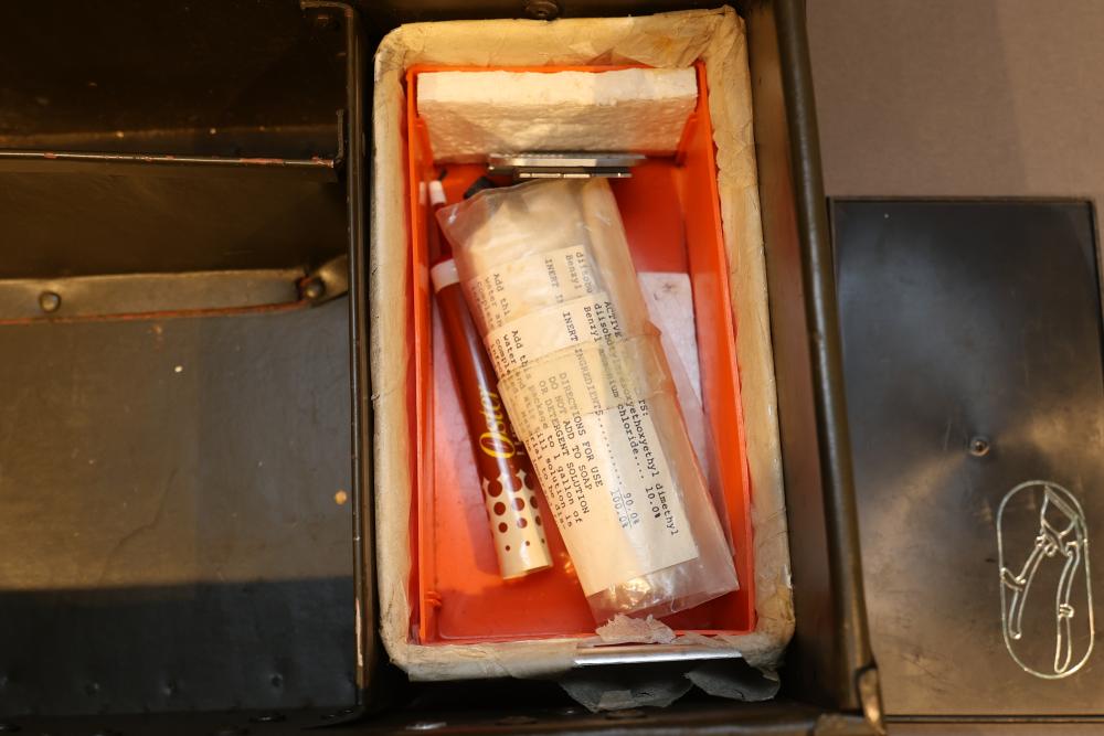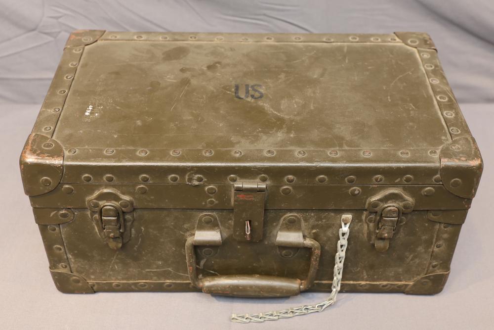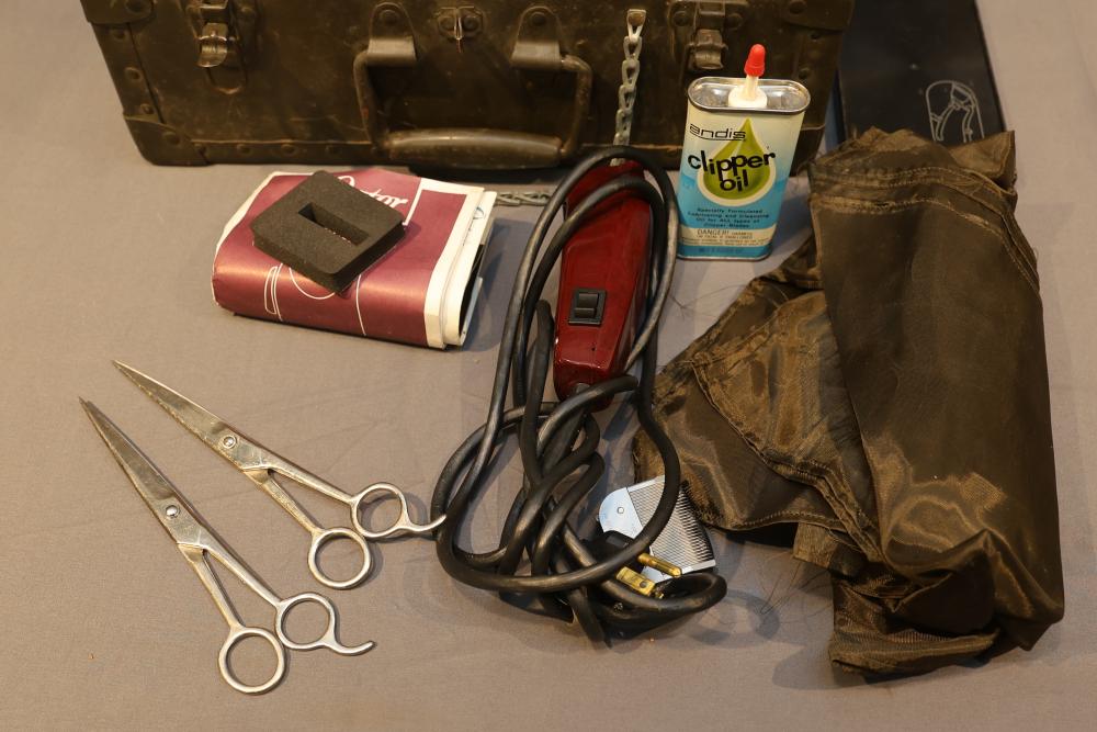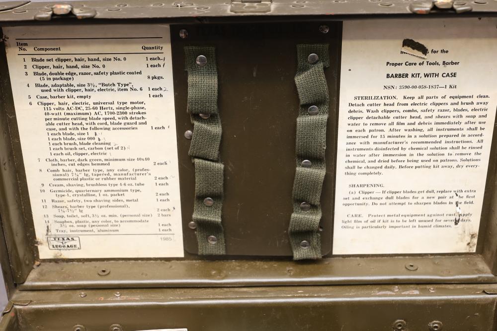 Texas Luggage U.S. Military Style portable barber kit with internal dividers, removable accessory tray, cloth apron, scissors, an Oster electric razor, and storage tin. Pickup only.