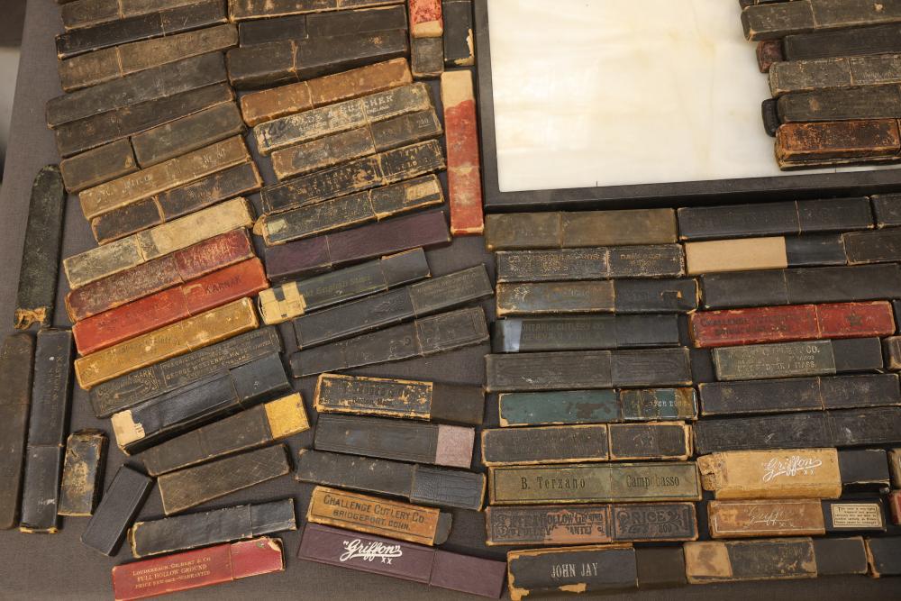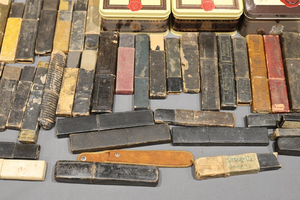 Items are from one straight razor collection & include cased matched pair of Joseph Rodgers & Sons straight razors having etched blade panels in velvet-lined Rodgers fitted case; etched motif Theodore Roosevelt & General Botha straight razor; Texas Luggage U.S. military style portable barber kit; porcelain shaving mugs with four lather brushes, collapsible compact travel shaving mirror with bowl; Warranted Razors having horn handles & notched Sheffield-style blades, etched Washington commemorative hollow blade with patriotic motif; Frederick Reynolds Sheffield straight razors; razors w/ mother of pearl scales/inlaid bar escutcheons/silver tone end caps/wedge-style blades; razors from Rogers & Sons, Wade & Butcher & Mappin's, featuring two horn scales & one celluloid with wedge style blades; razors from Clauss, J.A. Henckels, & H. Boker & Co., featuring mixed celluloid scales with hollow blades/includes multiple cases; barber accessories including razor strops/sharpening stones/boxed Schick blades; hair shapers; identification & value books & more. Items are located in Pleasant Valley, NY.