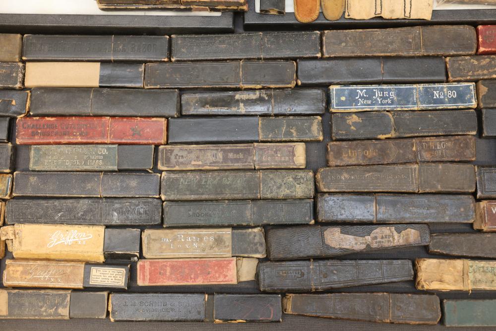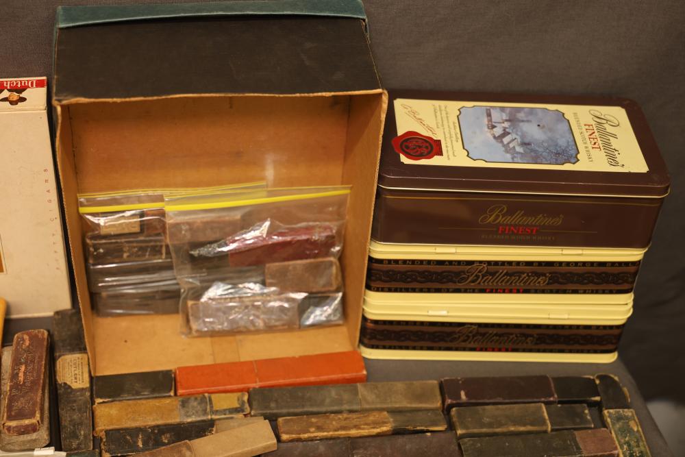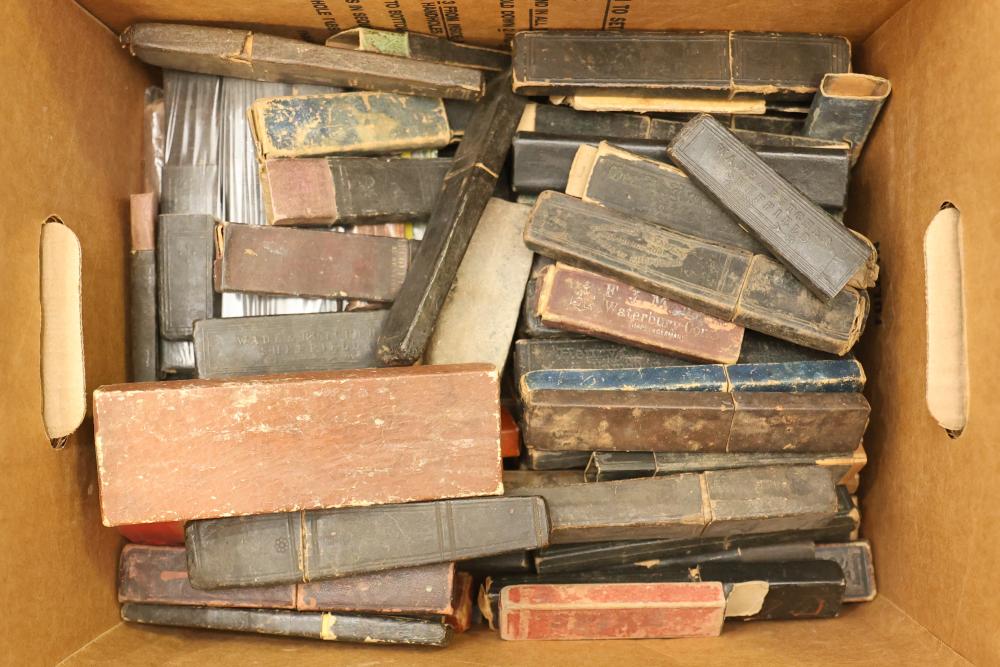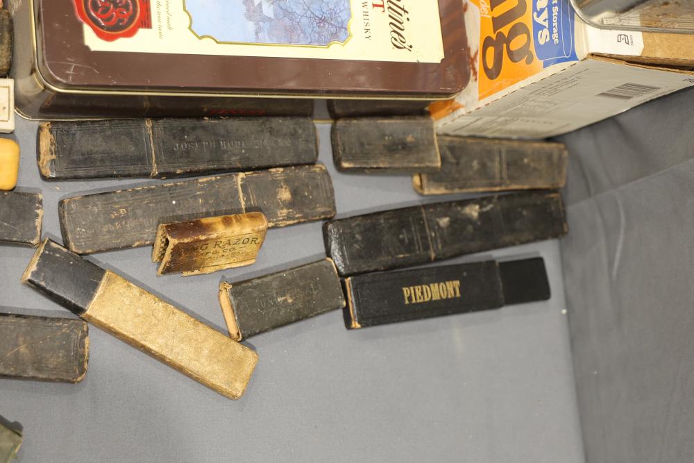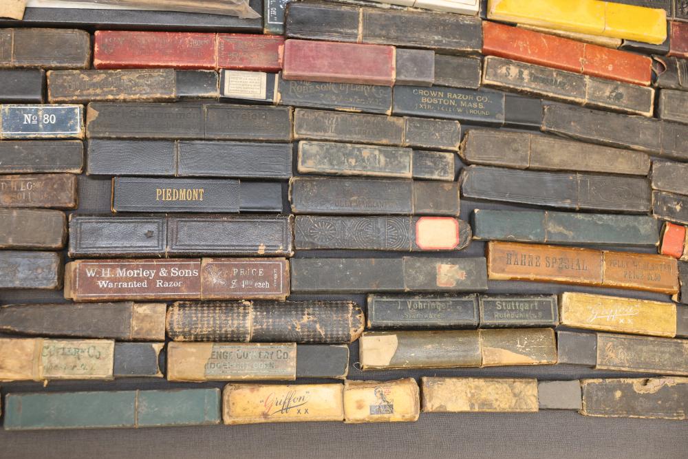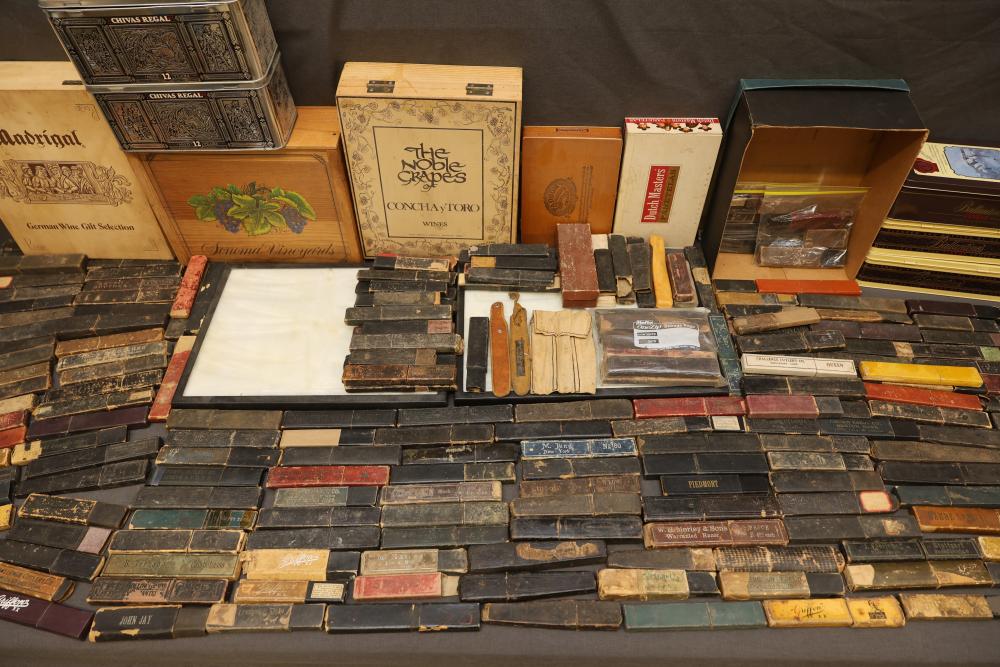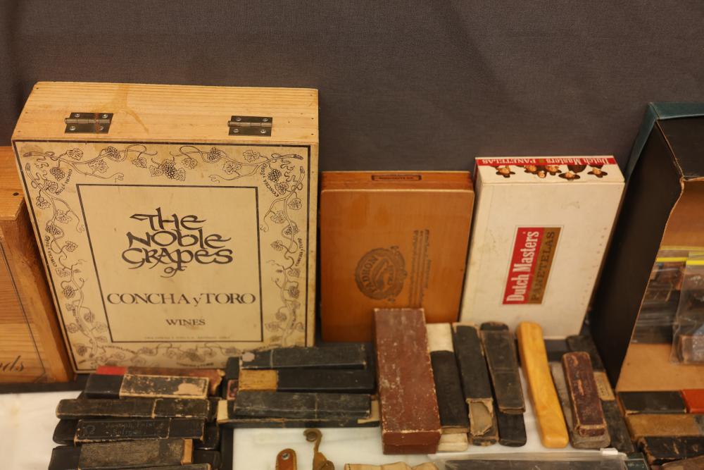 Collection of over 175+ EMPTY straight razor boxes from different many makers including empty cigar tins, display boxes, and wine boxes. No straight razors are in this lot. Pickup only.