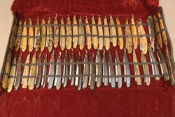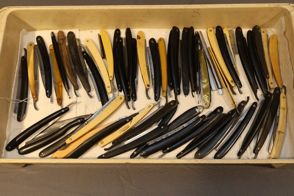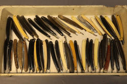 50 Straight Razors from many different makers such as J.R. Torrey, W.R. Case, and M.E. Reppenhagen, featuring horn and celluloid scales, with mixed wedge blades. One has a mother of pearl blade end. See photos for details. Pickup only.