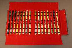 50 Straight Razors from many different makers such as Joseph Rodgers & Sons, Wade & Butcher, and Osgood Bray, featuring horn and celluloid style scales, with a wide variety of wedge and hollow style blades. Includes a leather rollup case with a violet softcloth interior and external handle with belt straps for storage. See photos for details. Pickup only.