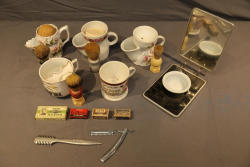 Five Porcelain Shaving Mugs with Four Lather Brushes, a Collapsible Compact Travel Shaving Mirror with Bowl, Two Hair Shapers, and a variety of blades. Some designs feature floral motifs, gold accents, and traditional scuttle designs. Includes badger-style shaving brushes. See photos for details. Pickup only.