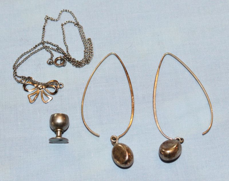 Silver jewelry with a combined weight of 44 grams. Most pieces are marked sterling or 925. Includes a vintage Coro Craft sterling brooch with rhinestones and other colored stones; sterling chains; earrings; etc. Shipping is available for this item.
