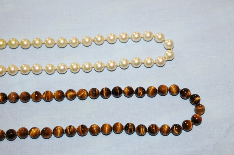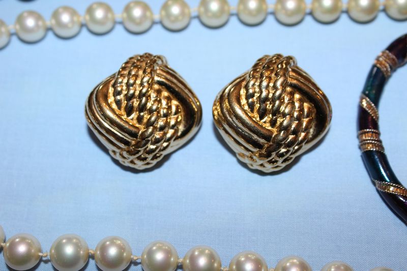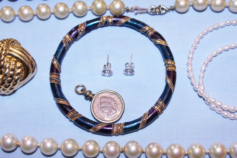 Vintage costume jewelry including a Japanese Iro Urushi tube layered lacquer bangle bracelet with gold-tone wire; pair of Ciner clip on earrings; pendant with 1906 Indian Head penny; 32"L tiger eye necklace; 15"L freshwater pearl necklace with sterling clasp; Majorica faux pearl necklace 30"L with 800 silver clasp; pair of CZ earrings with sterling mounts. Shipping is available for this item.