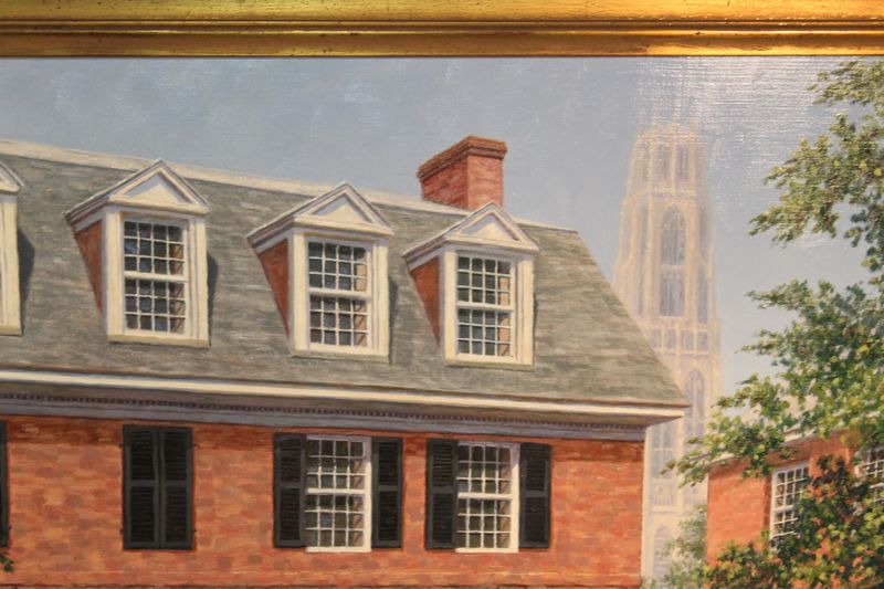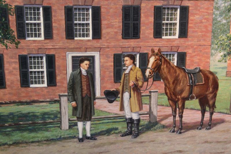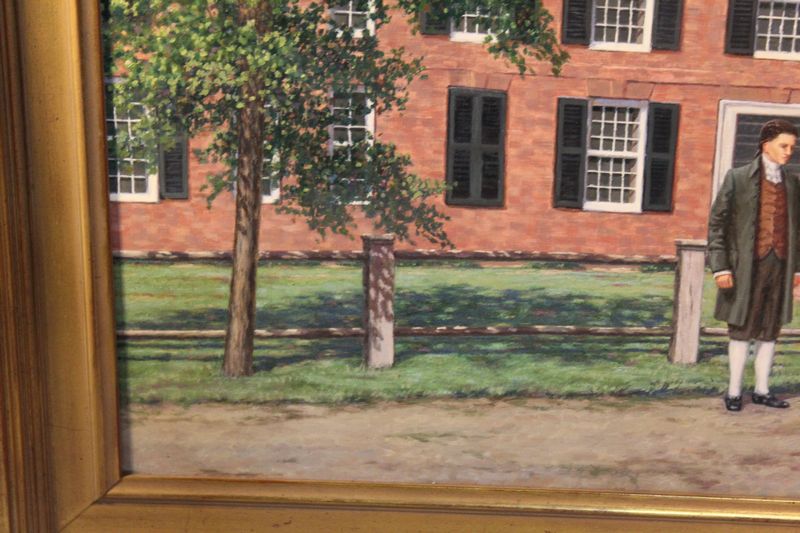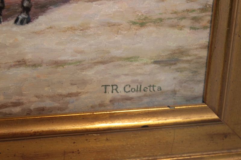 Framed Thomas R. Colletta (20th C) oil on canvas painting of men in 18th C. attire with a horse in front of an imposing brick home, signed lower right T.R. Colletta. Painting size is 23.5"Tx30"W.