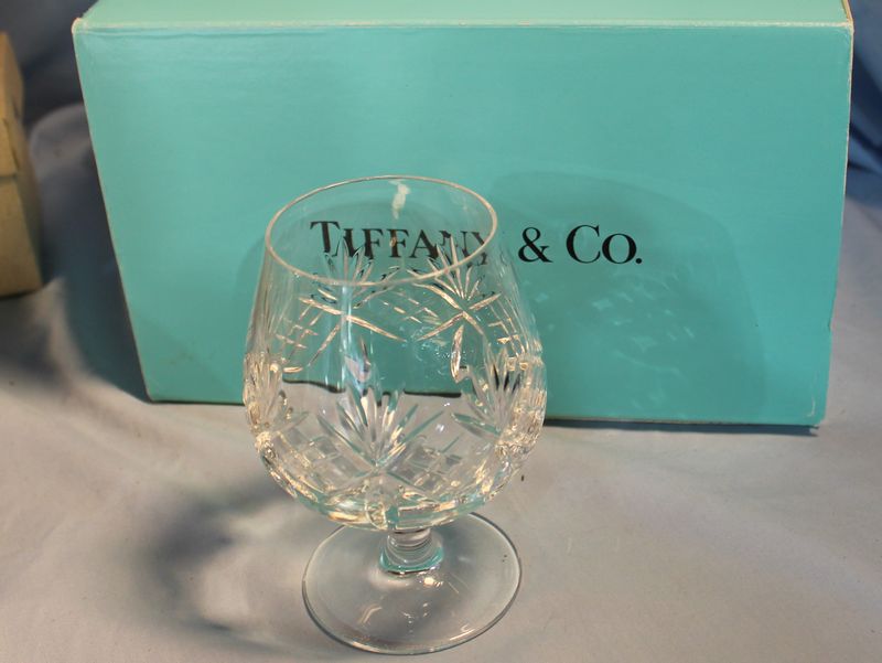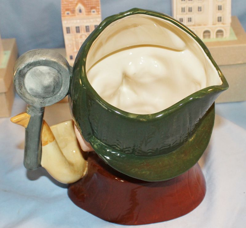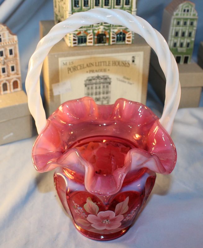 Porcelain and glass items including 5.5"T Chinese export pottery pot with lid; a 9"T Fenton art glass basket; a 7.5"T Royal Doulton "The Sleuth" Toby mug #6631; a Tiffany 5"T crytal brandy glass with box; 6 porcelain Czech miniature houses.