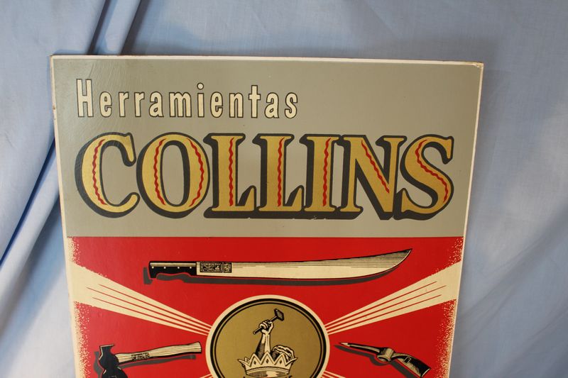 Vintage Collins cardboard South American free standing counter sign advertising bladed tools. Sign is 22"Tx14"W.