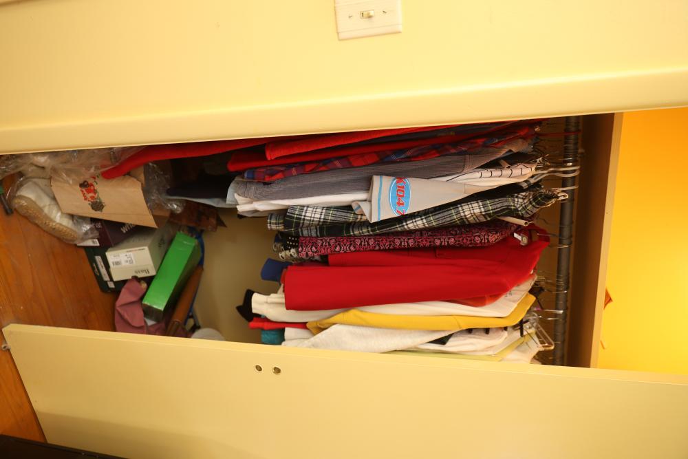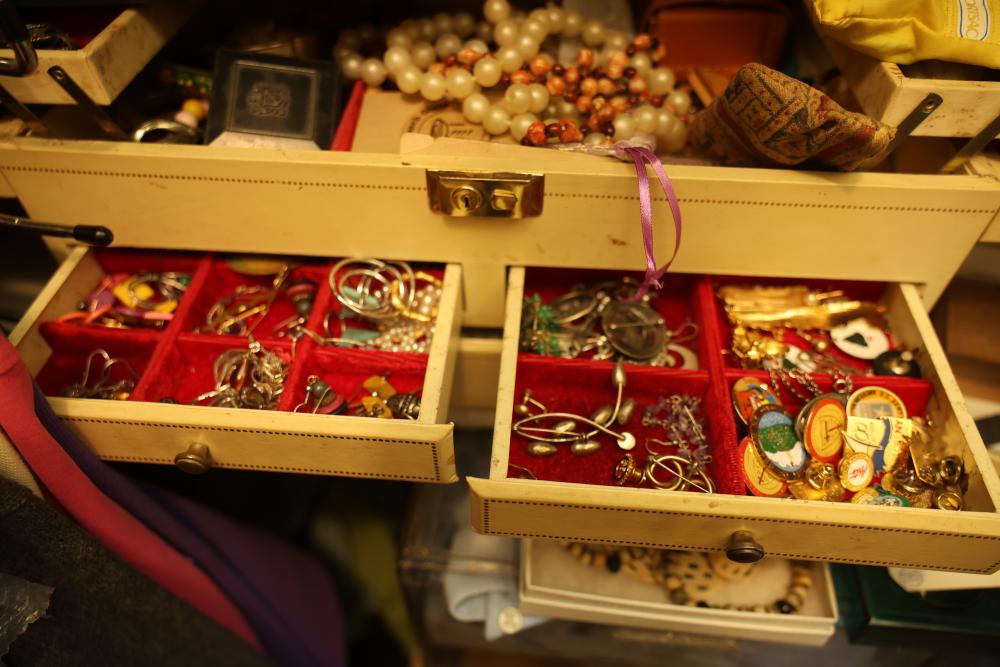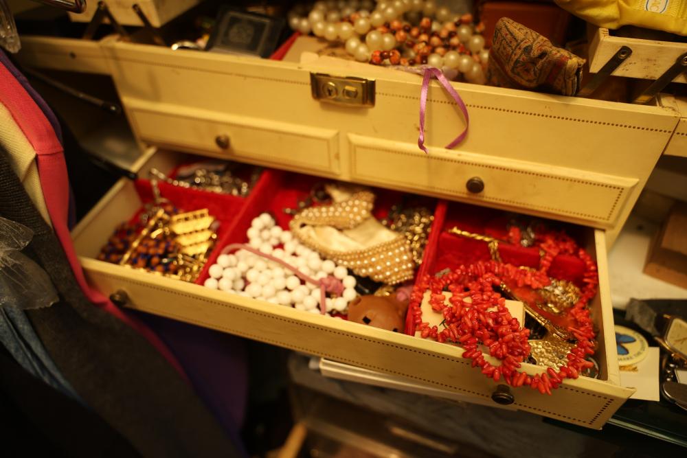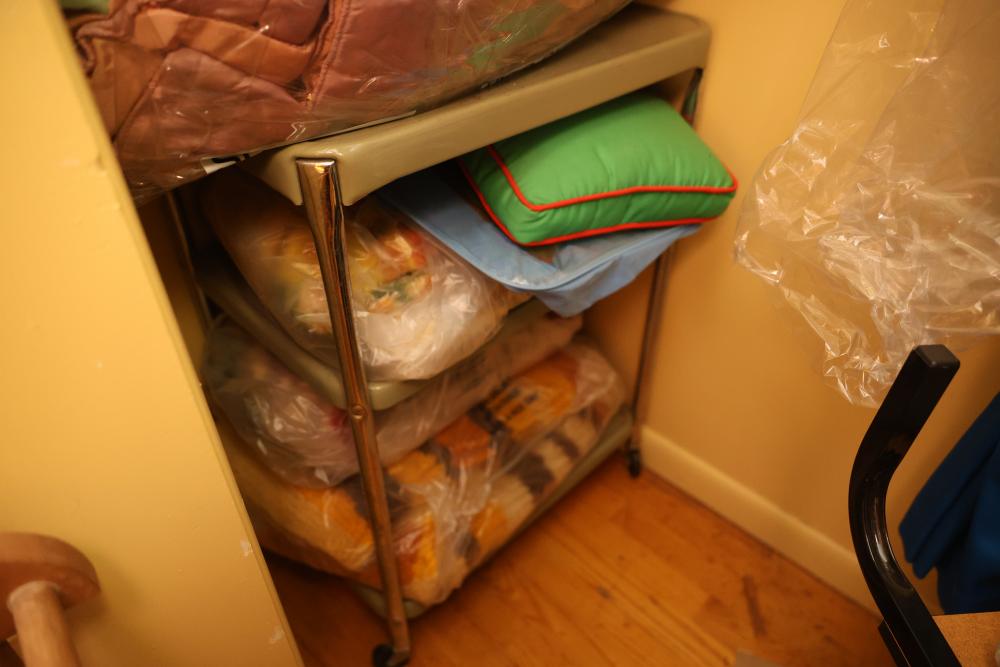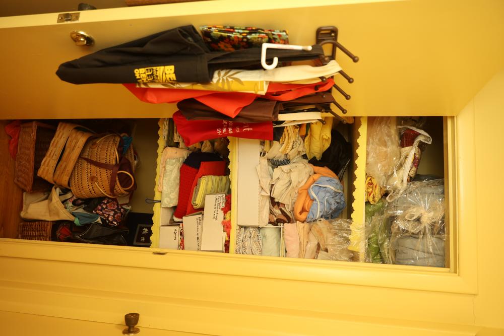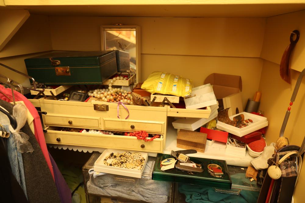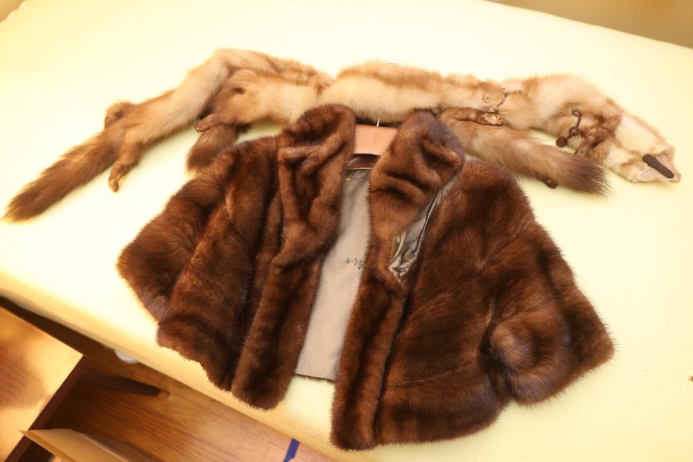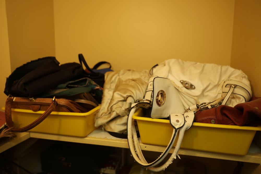 Clothing, Shoes, Accessories, Linens, Containers, Fur Garments, and Household Items incl; a large variety of clothing in both men's and woman's sizes, ties, footwear stored in open cubby shelving, handbags in bins, costume jewelry in boxes, folded textiles in transparent drawers, and stored luggage items. A Does not include items from other lots. Buyer is responsible for all help and materials necessary for safe and proper removal. Buyer must take all. Items located on first floor, no stairs. Pickup only.