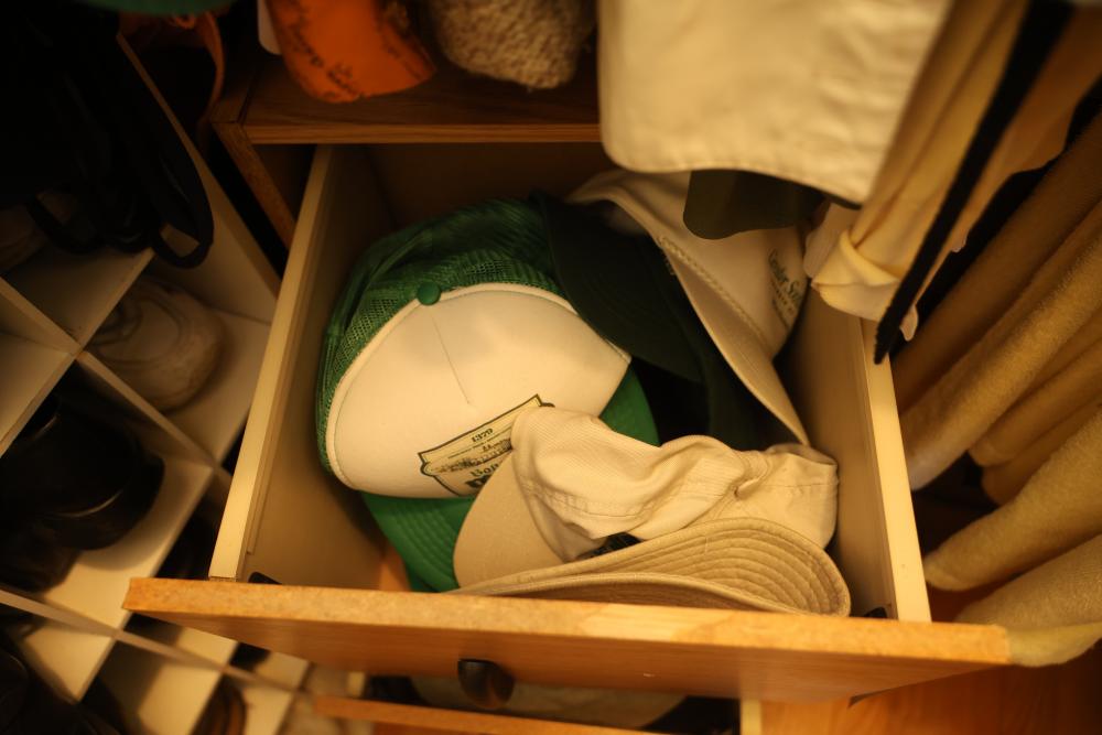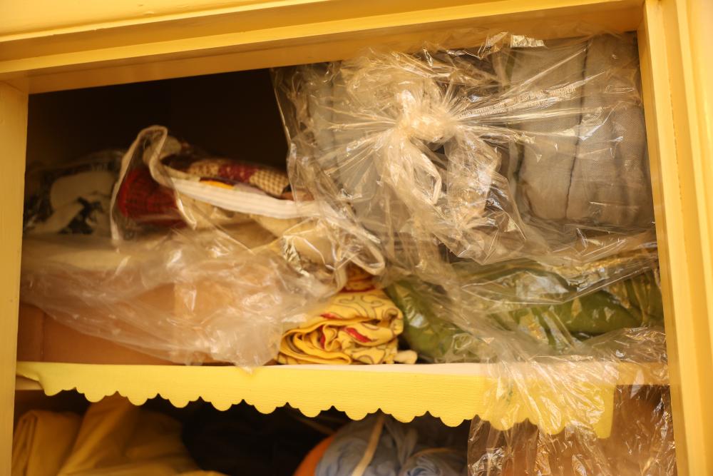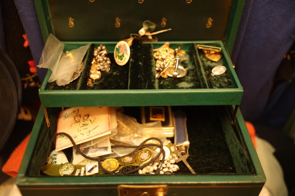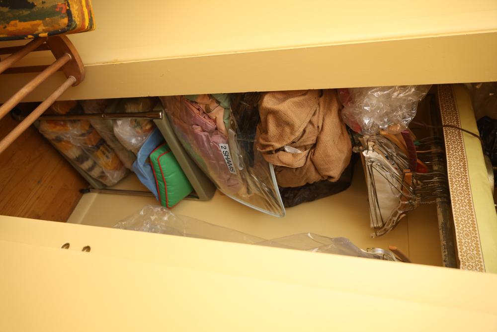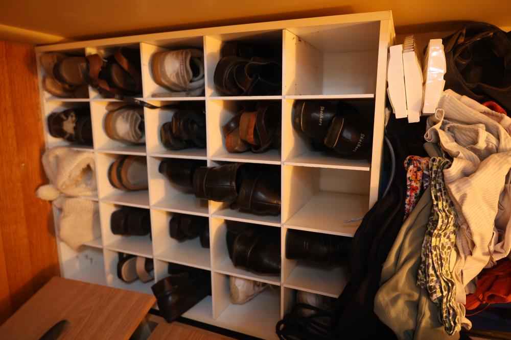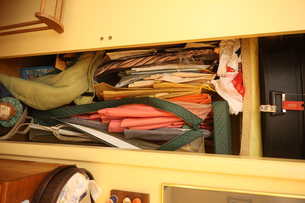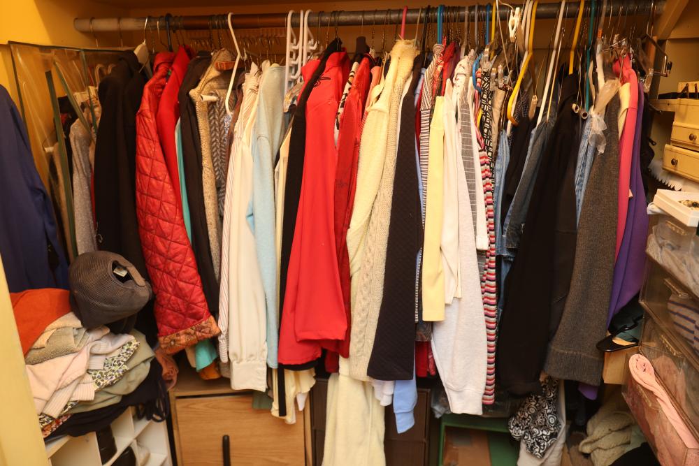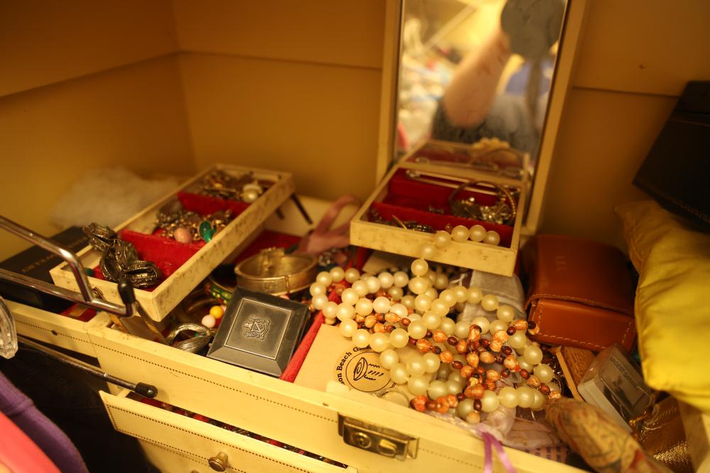 Clothing, Shoes, Accessories, Linens, Containers, Fur Garments, and Household Items incl; a large variety of clothing in both men's and woman's sizes, ties, footwear stored in open cubby shelving, handbags in bins, costume jewelry in boxes, folded textiles in transparent drawers, and stored luggage items. A Does not include items from other lots. Buyer is responsible for all help and materials necessary for safe and proper removal. Buyer must take all. Items located on first floor, no stairs. Pickup only.