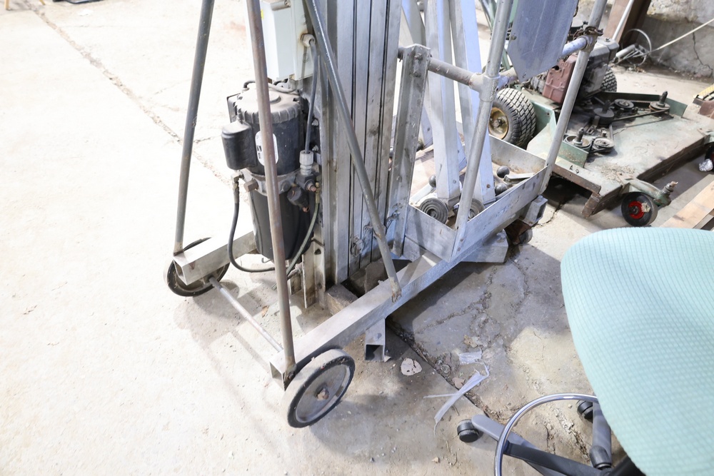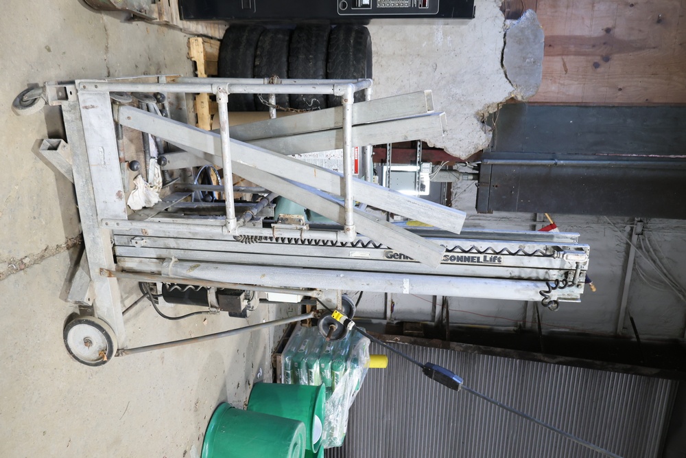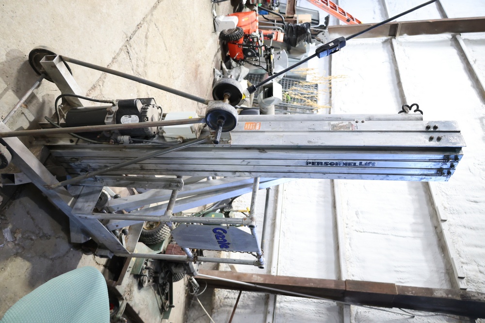 Electric-powered Genie personnel lift on a rolling base, equipped with a Doerr/Emerson 1/2 HP motor (model PR607983BA298B) with dual-voltage capability (100–115V / 200–230V). Includes platform, outriggers, and lift mechanism as shown. Seller reports: Operates as intended.