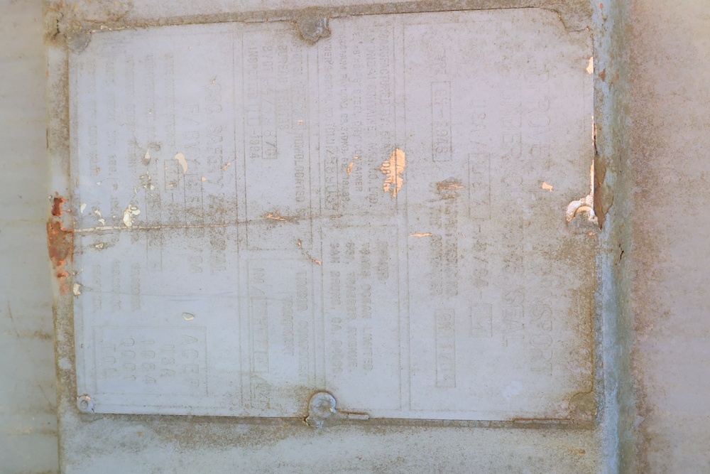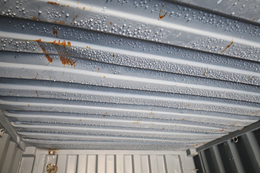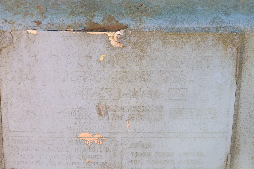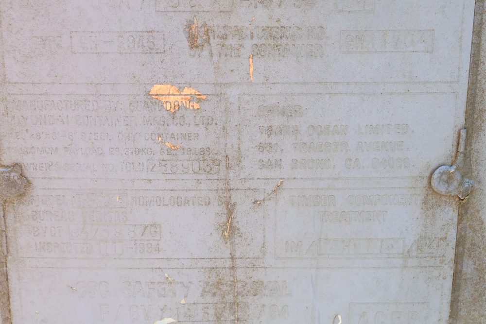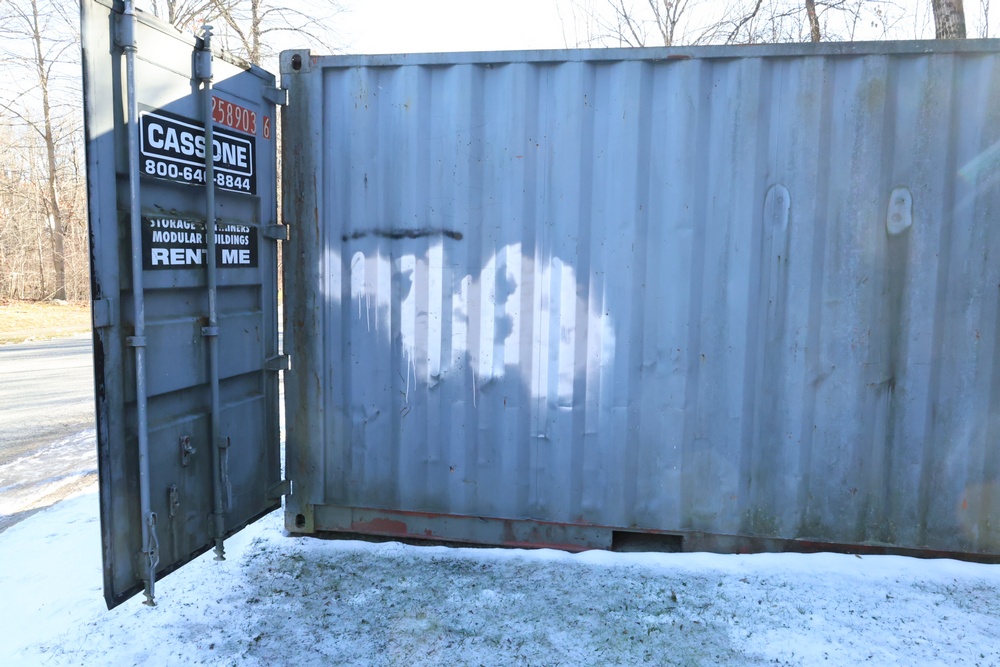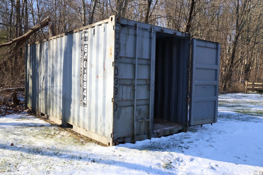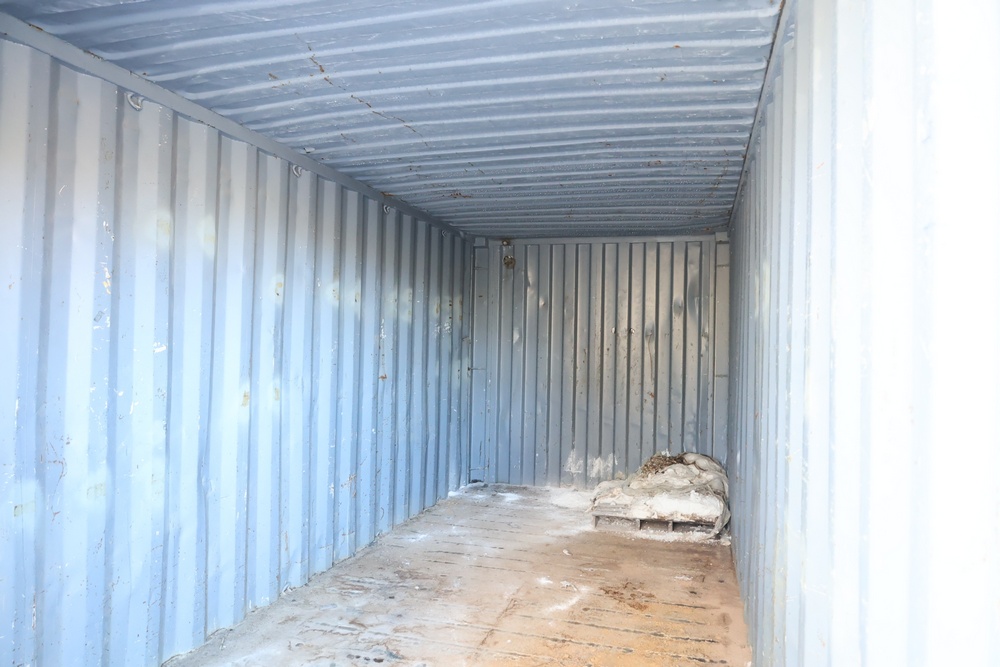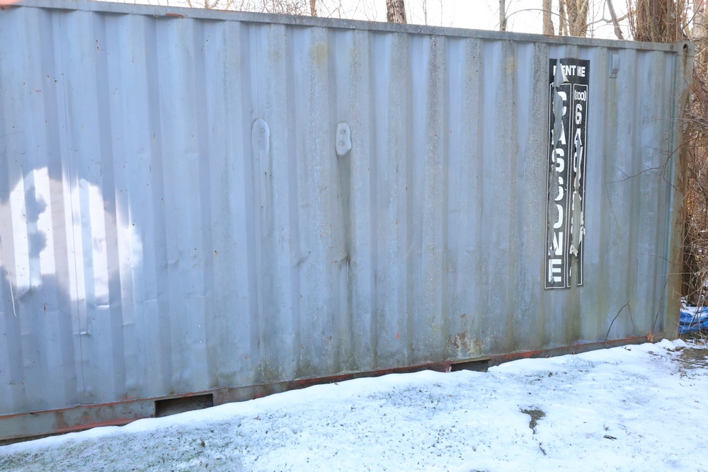 20' steel storage container with corrugated walls, double cargo doors, and interior pallet of bagged lime included; buyer is responsible for removal.