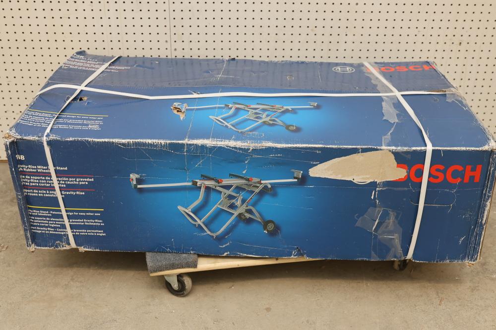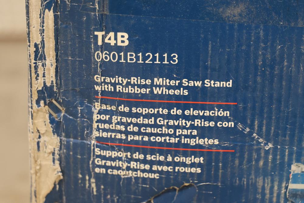 Bosch T4B 061B12113 Gravity-Rise Miter Saw Stand featuring a durable construction designed to accommodate miter saws with a gravity-rise system and rubber wheels for mobility. Item condition includes boxed packaging with visible wear. Pickup only.