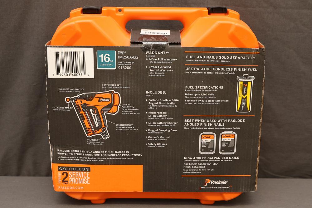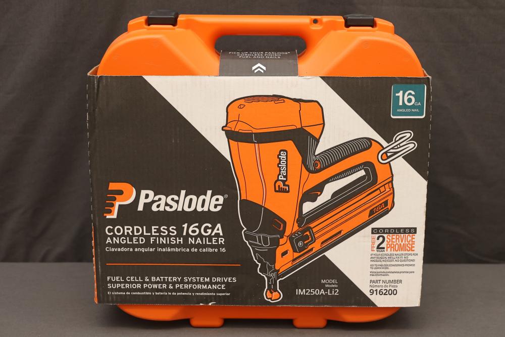 Paslode Cordless 16 Ga Angled Finish Nailer Model IM250A-Li2 P/N 916200. Includes durable carrying case, cordless finish nailer, and necessary components as specified on the packaging. Requires fuel and nails, which are sold separately. Designed for professional-grade performance with lightweight construction for easy handling. Pickup only.