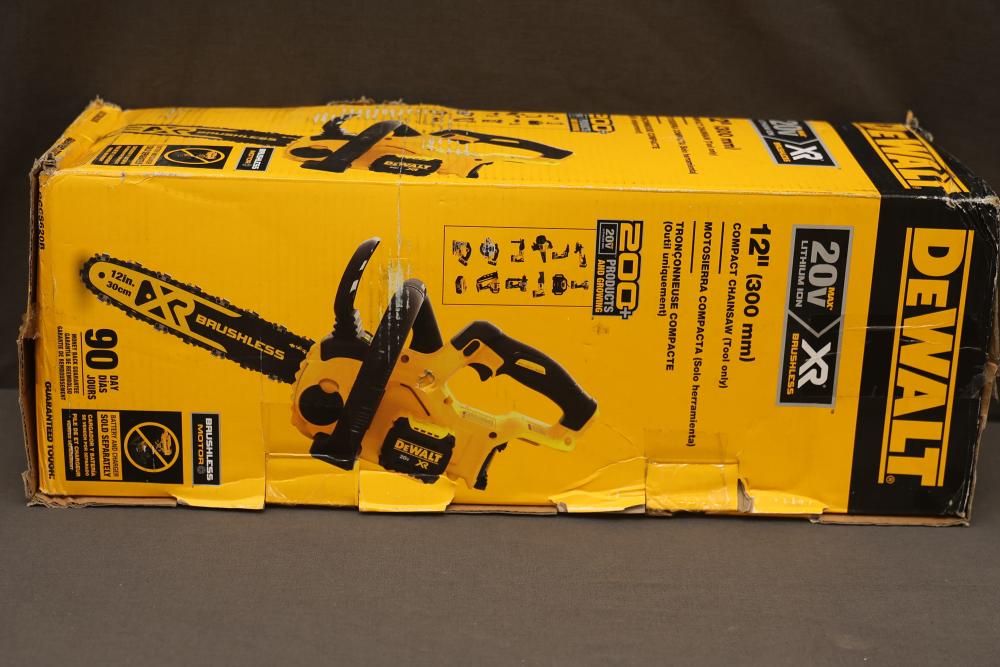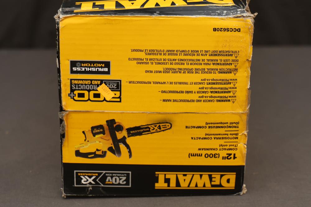 Dewalt 20V MAX 12 Inch Brushless Cordless Battery Powered Chainsaw (Tool Only) DCCS620B. Includes chainsaw unit and instruction manual. Features a brushless motor for efficient performance. Designed for use with 20V MAX batteries (not included). Bar length measures 12 inches (300 mm). Pickup only.