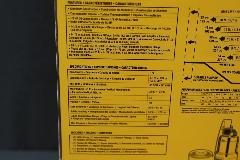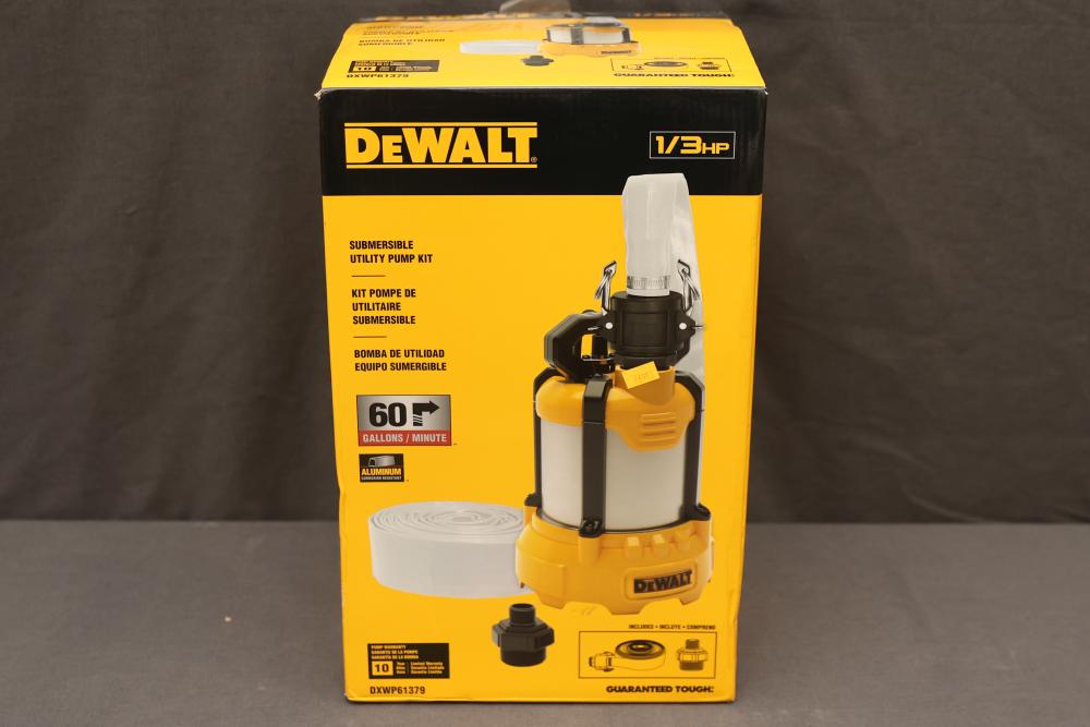 Dewalt 1/3 HP 115V Submersible Utility Pump Kit DXWP61379. Includes a powerful 1/3 HP motor, 115V capacity, and designed for efficient water removal. Comes with a durable pump, hose, fittings, and an instruction manual. Features 60-minute auto shutoff and a thermoplastic construction for durability. Pickup only.