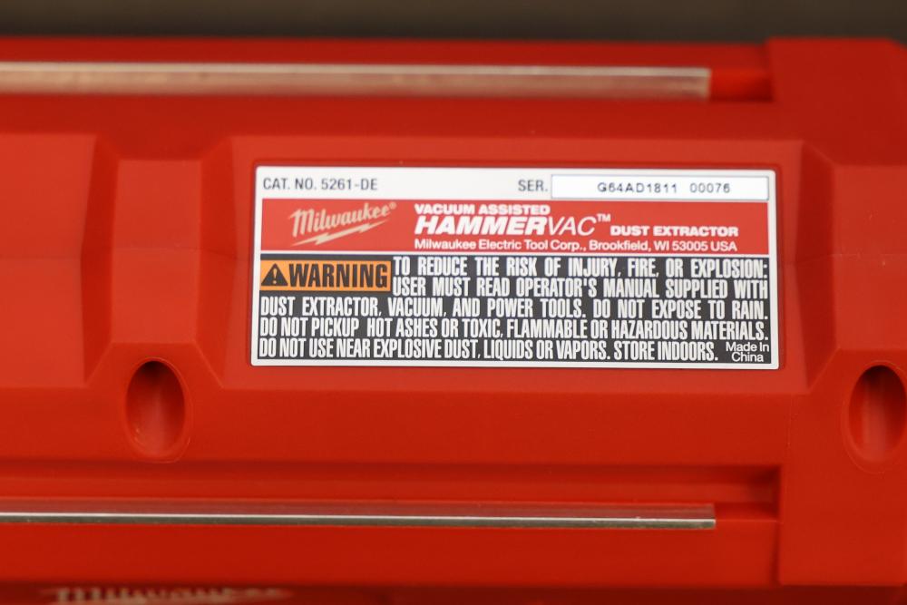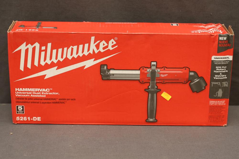Milwaukee Hammervac Universal Dust Extractor, Vacuum Assisted 5261-DE. Includes the Milwaukee 5261-DE unit, handle, multiple clamps, and manuals. Designed for efficient dust extraction and universal fitment. Ideal for use with rotary hammers and compatible tools. Pickup only.