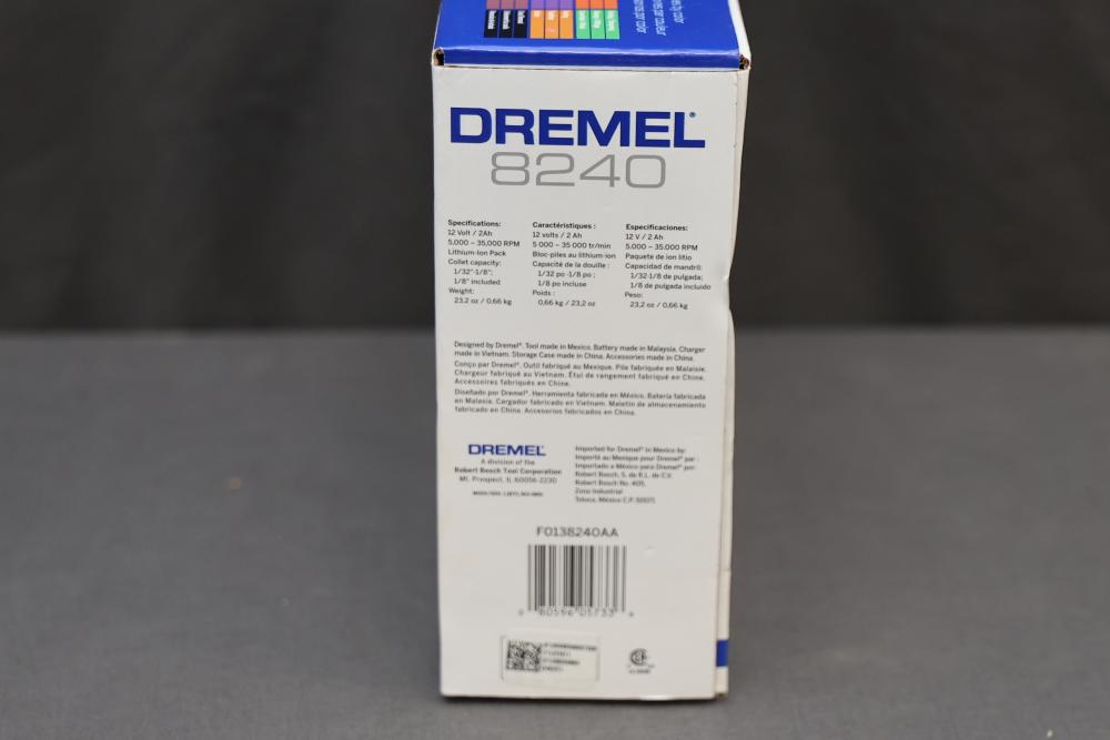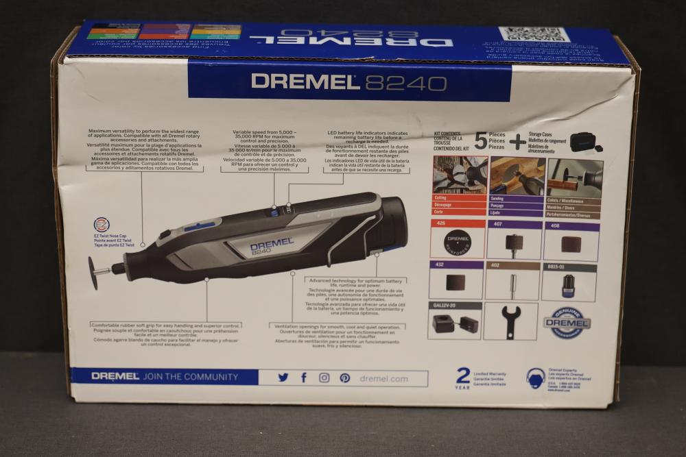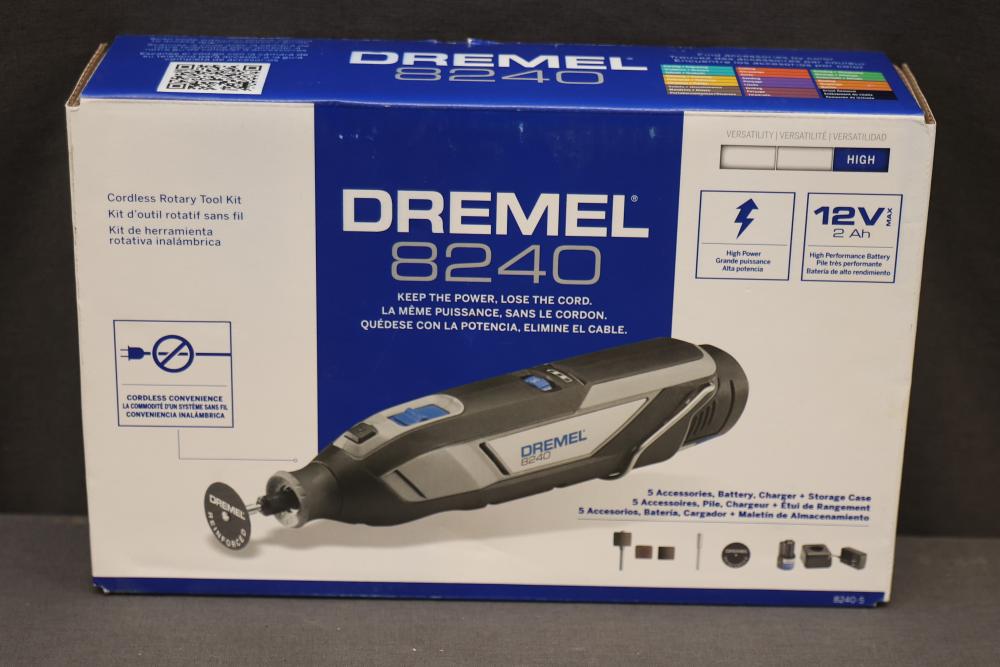Dremel 8240 12V Cordless Rotary Tool Kit includes a rotary tool, rechargeable 12V battery, charger, various accessories, and a carrying case. Ideal for precision tasks, it offers portability and convenience with cordless operation. Comes with a user manual for easy operation. Pickup only.