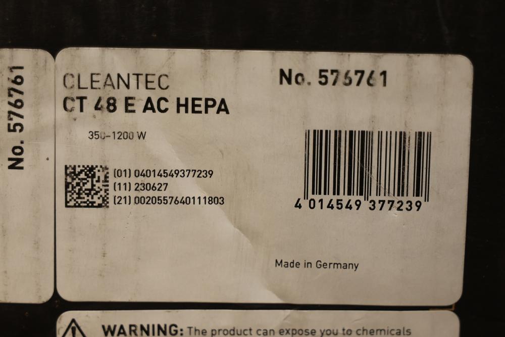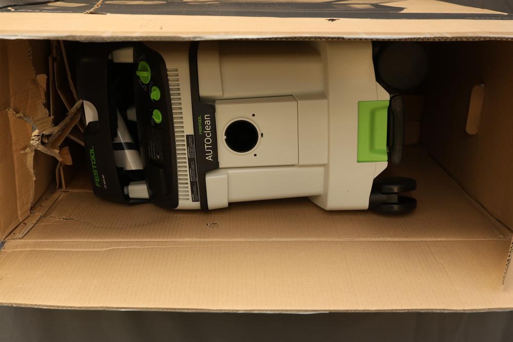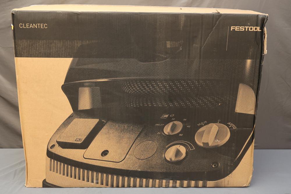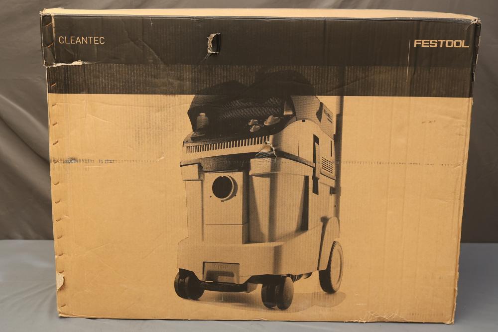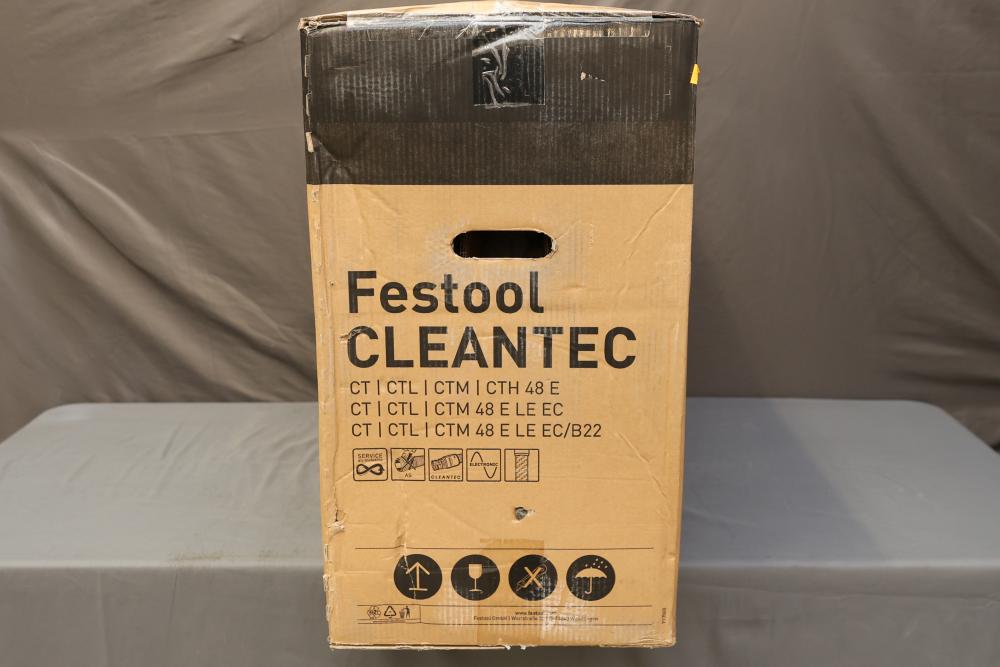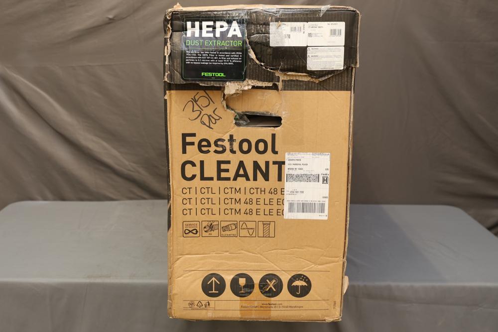 Festool Dust Extractor CT 48 EI AC HEPA CLEANTEC 577876. Features include a 1200 W motor with HEPA filtration for efficient dust extraction. Includes the unit, hose, and dust bags. Box shows signs of wear, but the extractor itself is in good condition. Pickup only.