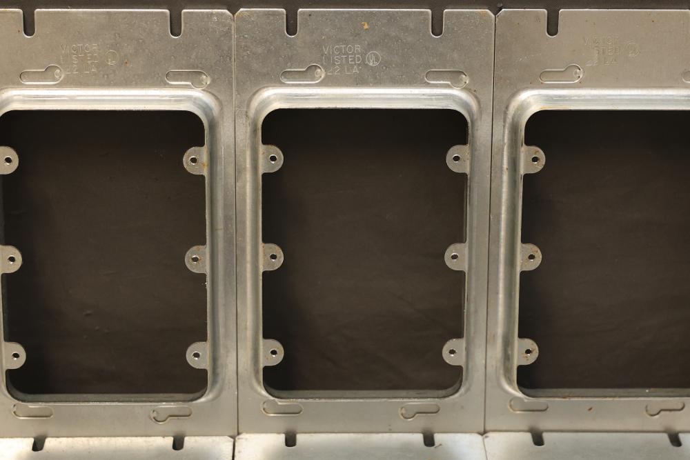3 Gang Three Device Box Cover Adapter Raised 3/4 of an Inch Deep - Quantity of 10. Metal construction with a standardized design for three-gang device boxes. Includes a total of 10 identical adapters. Pickup only.