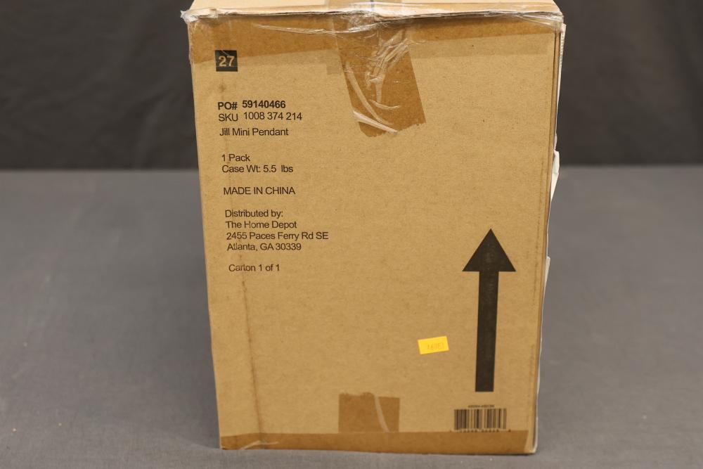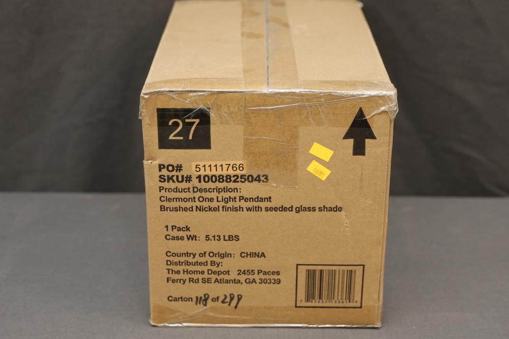 Home Decorators Collection Set of 2 Pendant Lights: Jill Mini Pendant (45094-HBON) and Clermont Light Pendant (6001281SG-962). The Jill Mini Pendant features a clean, modern design with a glass shade, while the Clermont Light Pendant includes a brushed nickel finish with a seeded glass shade. Both items are in original packaging with accessories and documentation. Pickup only.