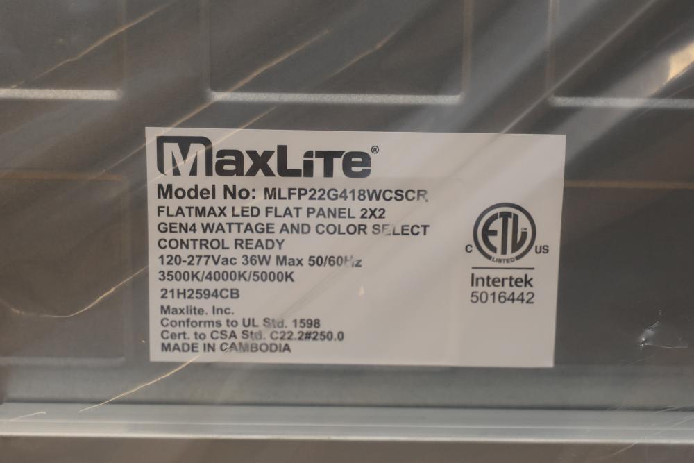 MaxLite 105188 FlatMax LED Flat Panel 2 ft by 2 ft, Gen 4 Wattage, Color Select, Control Ready in a quantity of 3. Each unit operates at 18W, 27W, or 36W with selectable color temperatures of 3500K, 4000K, or 5000K. Designed for 120-277 Vac, 50/60Hz operation. Pickup only.