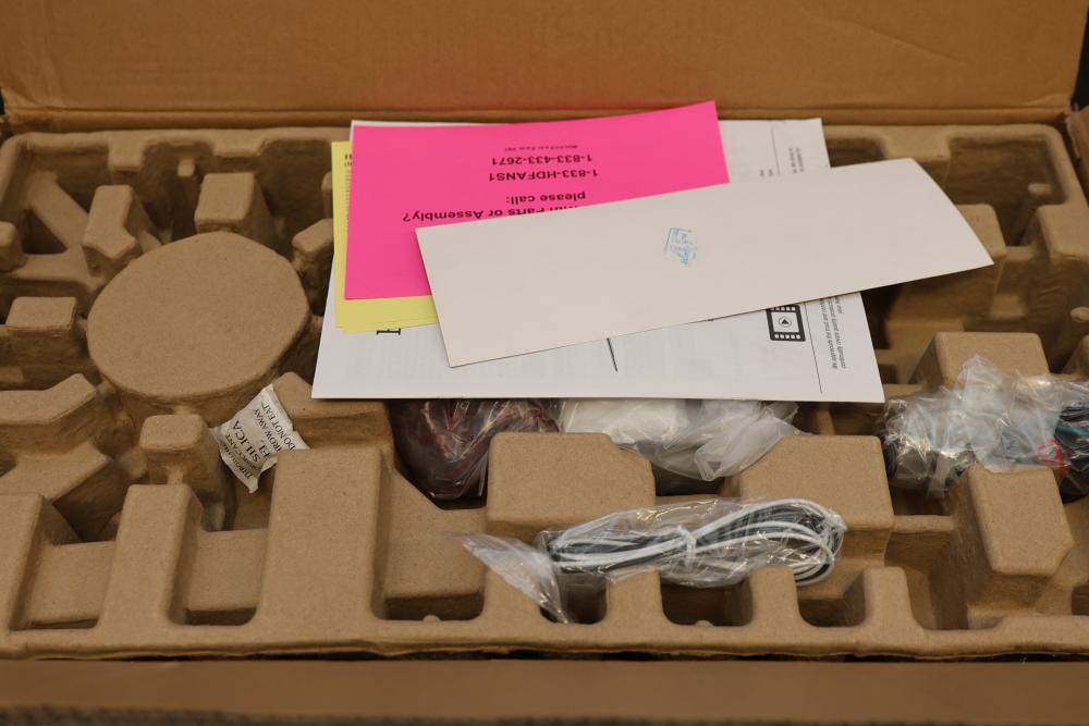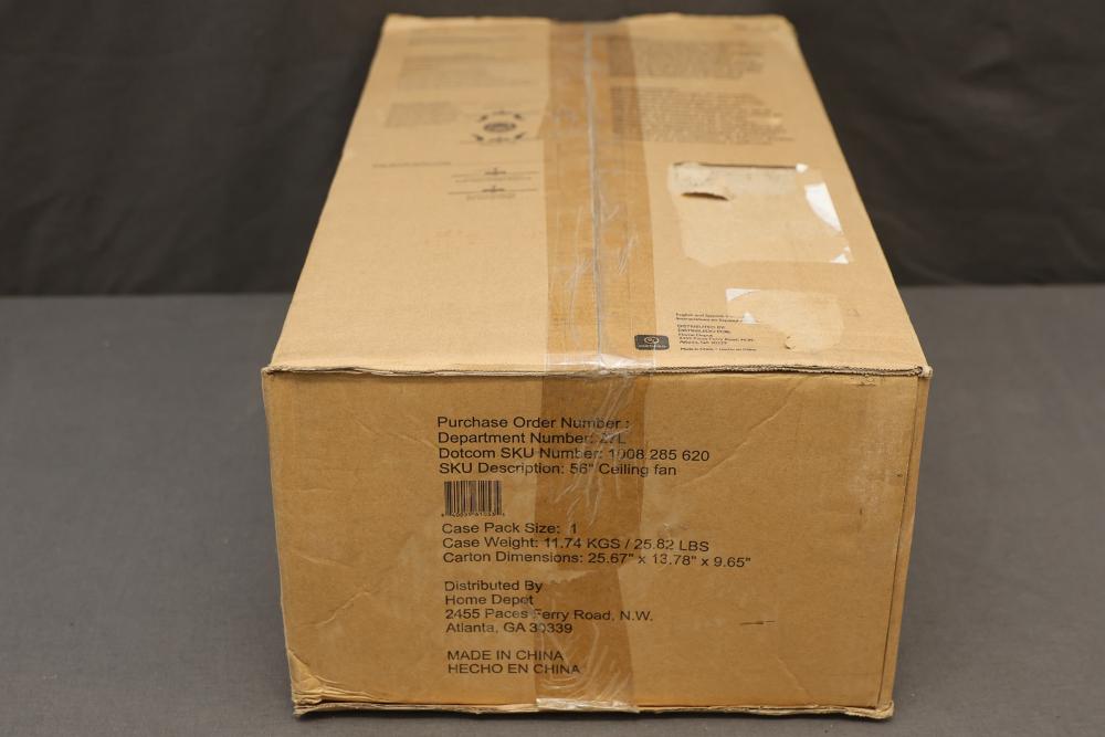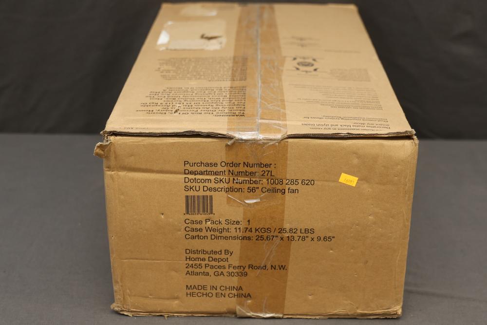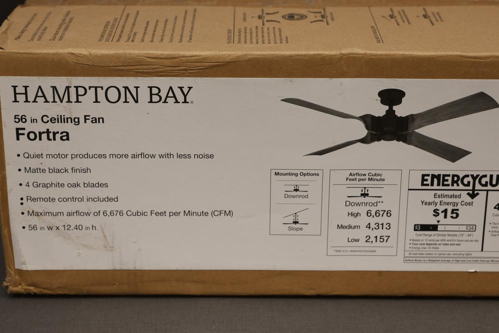 Hampton Bay Fortra 56 Inch Ceiling Fan (AK272-MBK). Features include a quiet motor that produces more airflow with less noise and a matte black finish. Includes four graphite oak blades, remote control, and mounting accessories. The fan has a maximum airflow of 6,576 CFM. Pickup only.