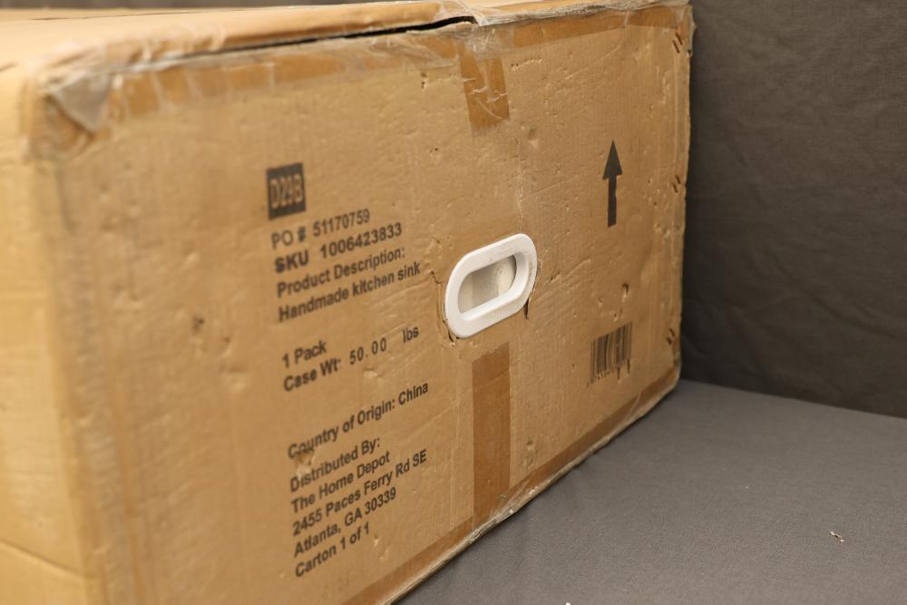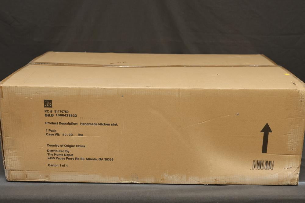 Glacier Bay 36 Inch Farmhouse/Apron Front Single Bowl 18 Gauge Gunmetal Black Stainless Steel Kitchen Sink (ACS3621A1Q). Features an apron front design, gunmetal black stainless steel material, single bowl configuration, and an 18-gauge construction. Includes additional accessories like a cutting board and a drain assembly. Pickup only.
