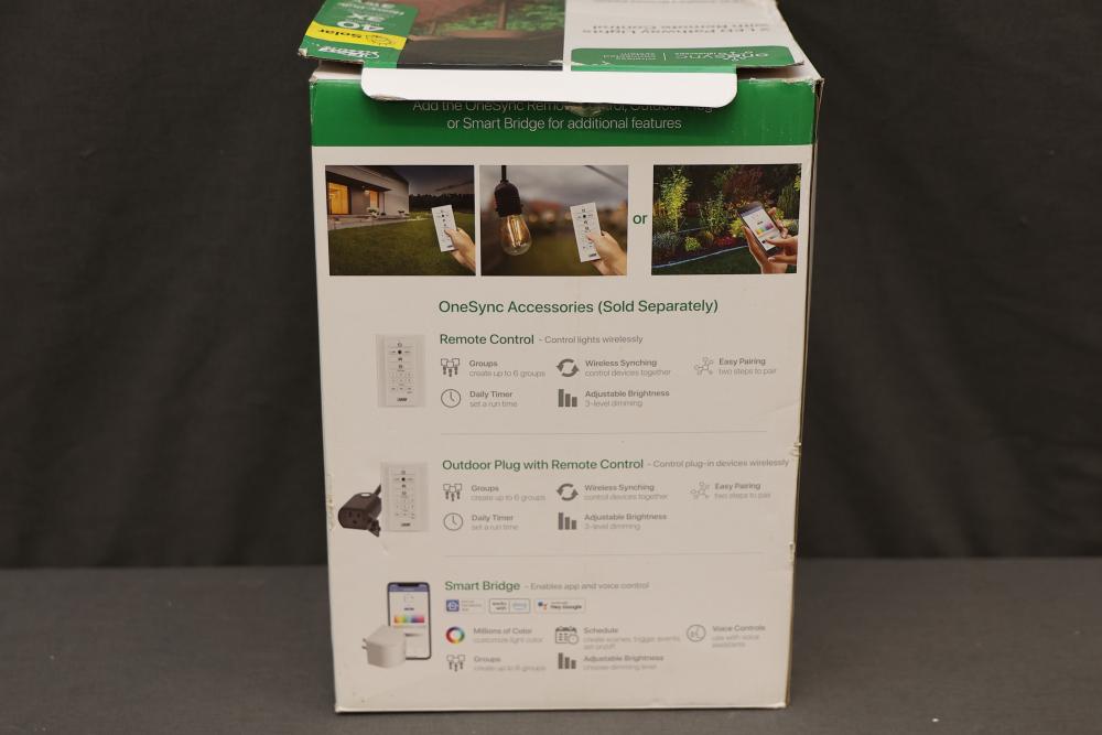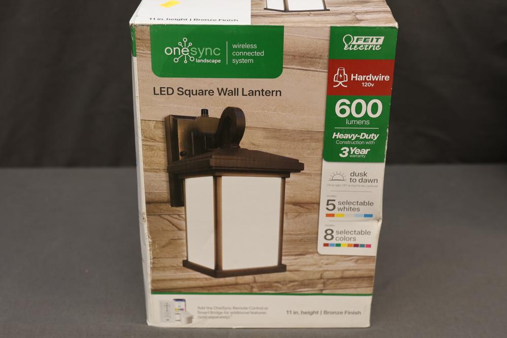 OneSync LED 11 Inch Square Wall Lantern in bronze finish with 600 lumens, hardwired 120v setup, and ability to integrate into a wireless control system. Includes a OneSync Solar Starter Kit with 2 12-inch LED pathway lights, each with 40 lumens, a bronze finish, and a remote control. Both components are designed for durable, outdoor use. Pickup only.