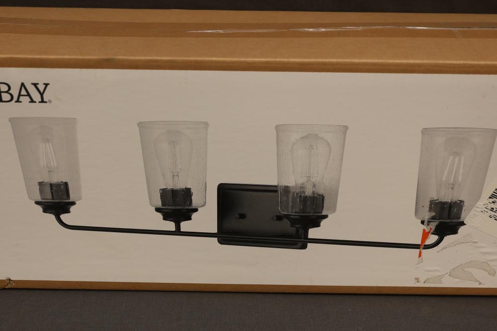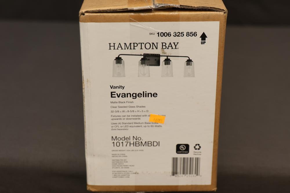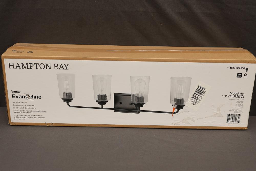 Hampton Bay 32 and 3/8 Inch 4 Light Vanity Evangeline Matte Black Finish with Clear Seeded Glass Shades (Model No. 1017HBMBDI). Features a modern matte black finish with clear seeded glass shades for a stylish design. Item is new in the original packaging. Pickup only.